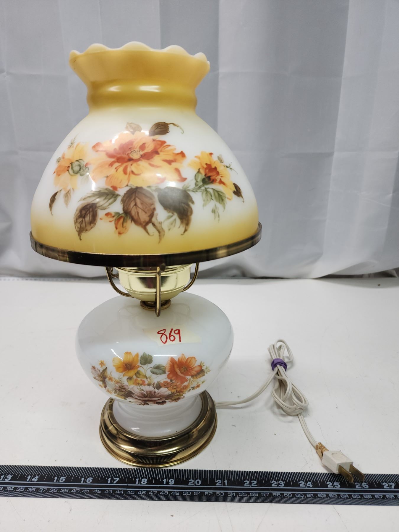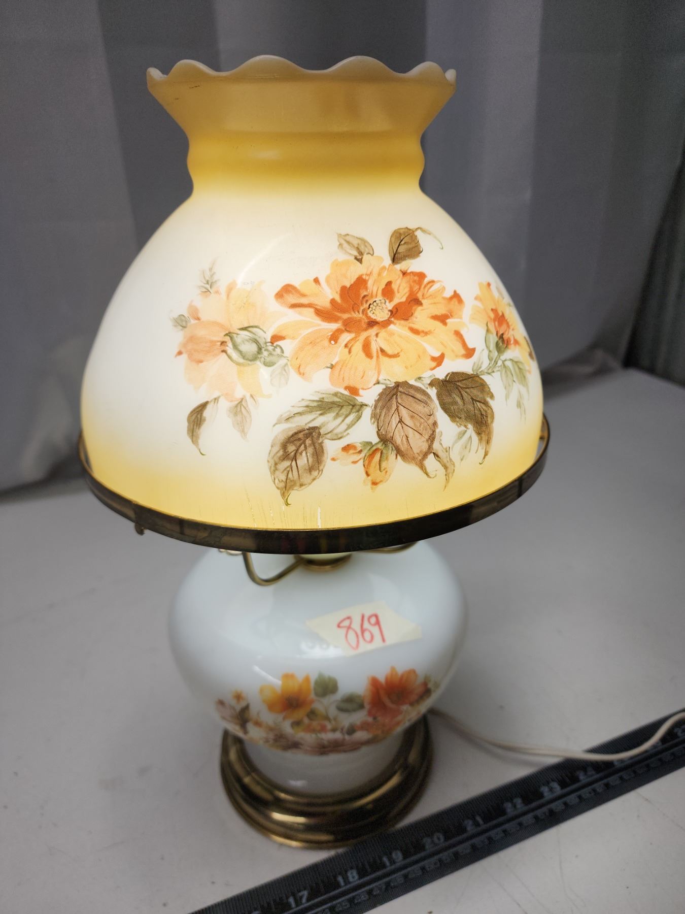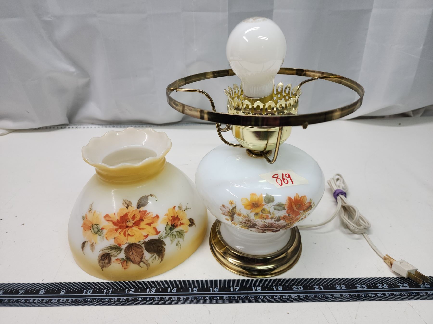 Lovely glass floral lamp, w/ matching glass shade - 14.5"H