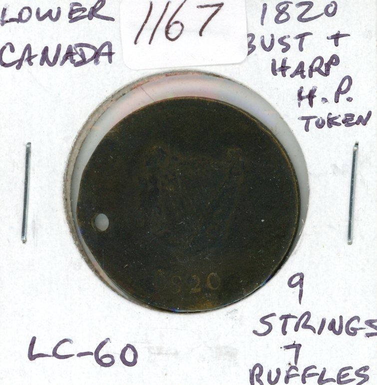 Lower Canada 1820 Bust & Harp Half Penny Token. 9 Strings on Harp & 7 ruffles on shirt. LC-60. Holed.