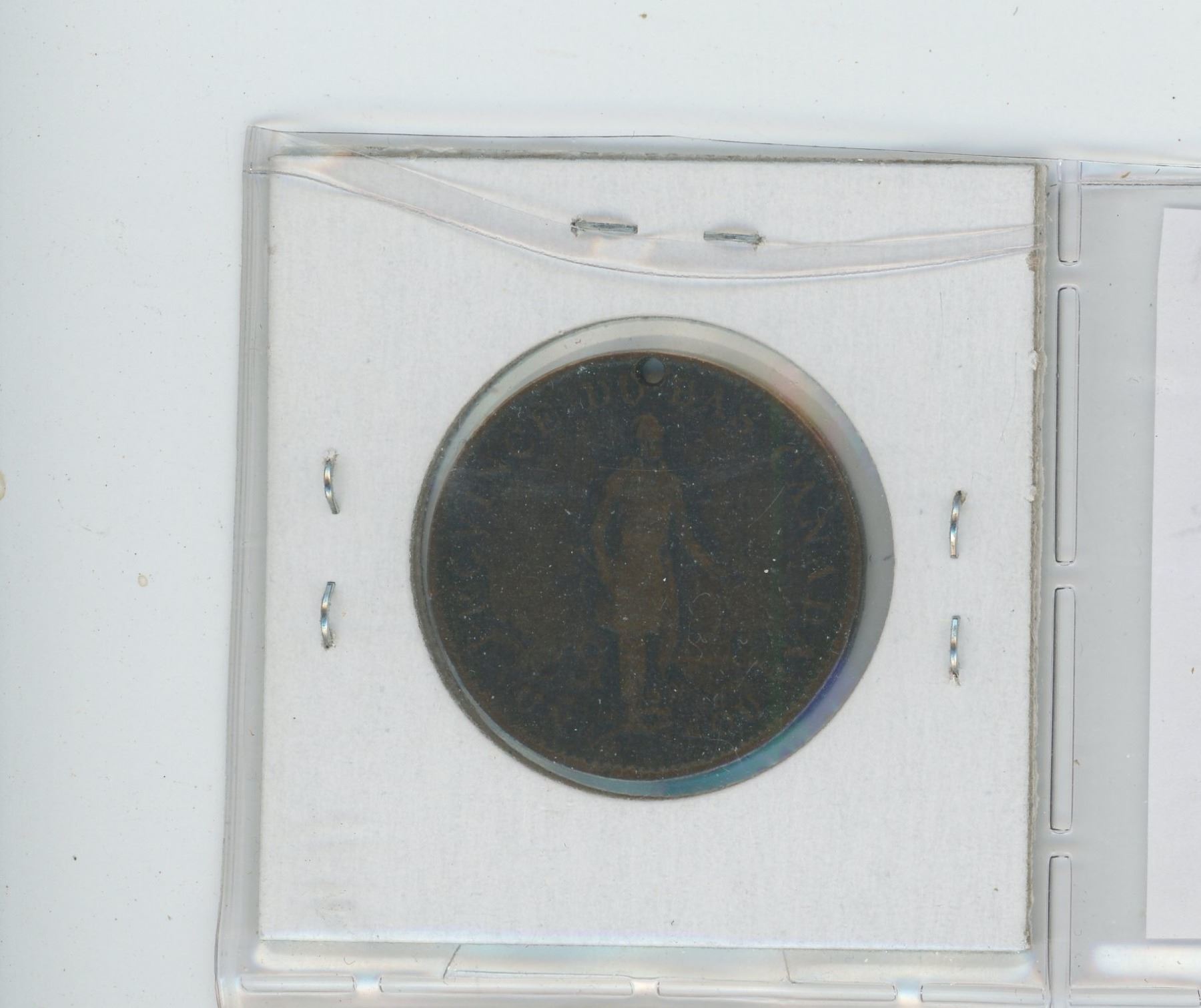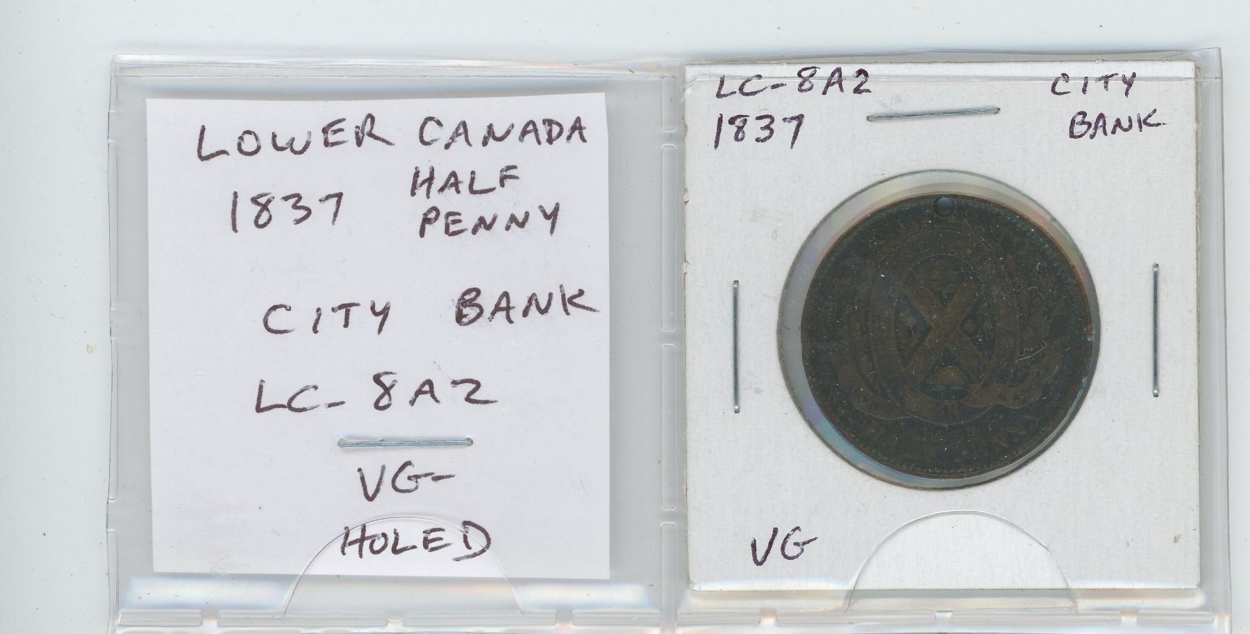 Lower Canada 1837 Half Penny Token. City Bank. LC-8A2. VG. Pre-Confederation token holed for suspension.