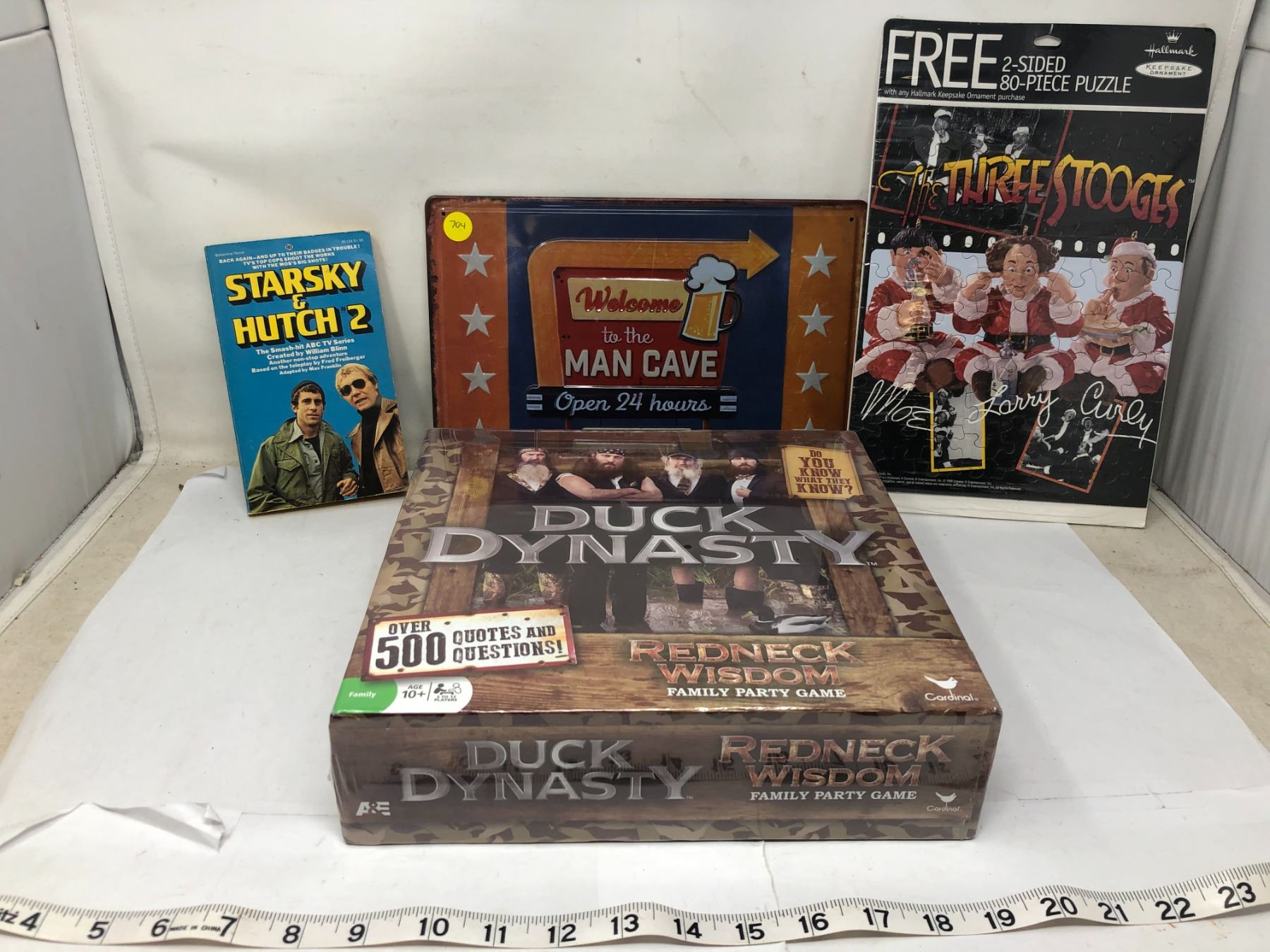 Man Cave Tin Sign, 3 Stooges Puzzle (Sealed), Duck Dynasty Game (Sealed), and Starsky & Hutch 2 Book.