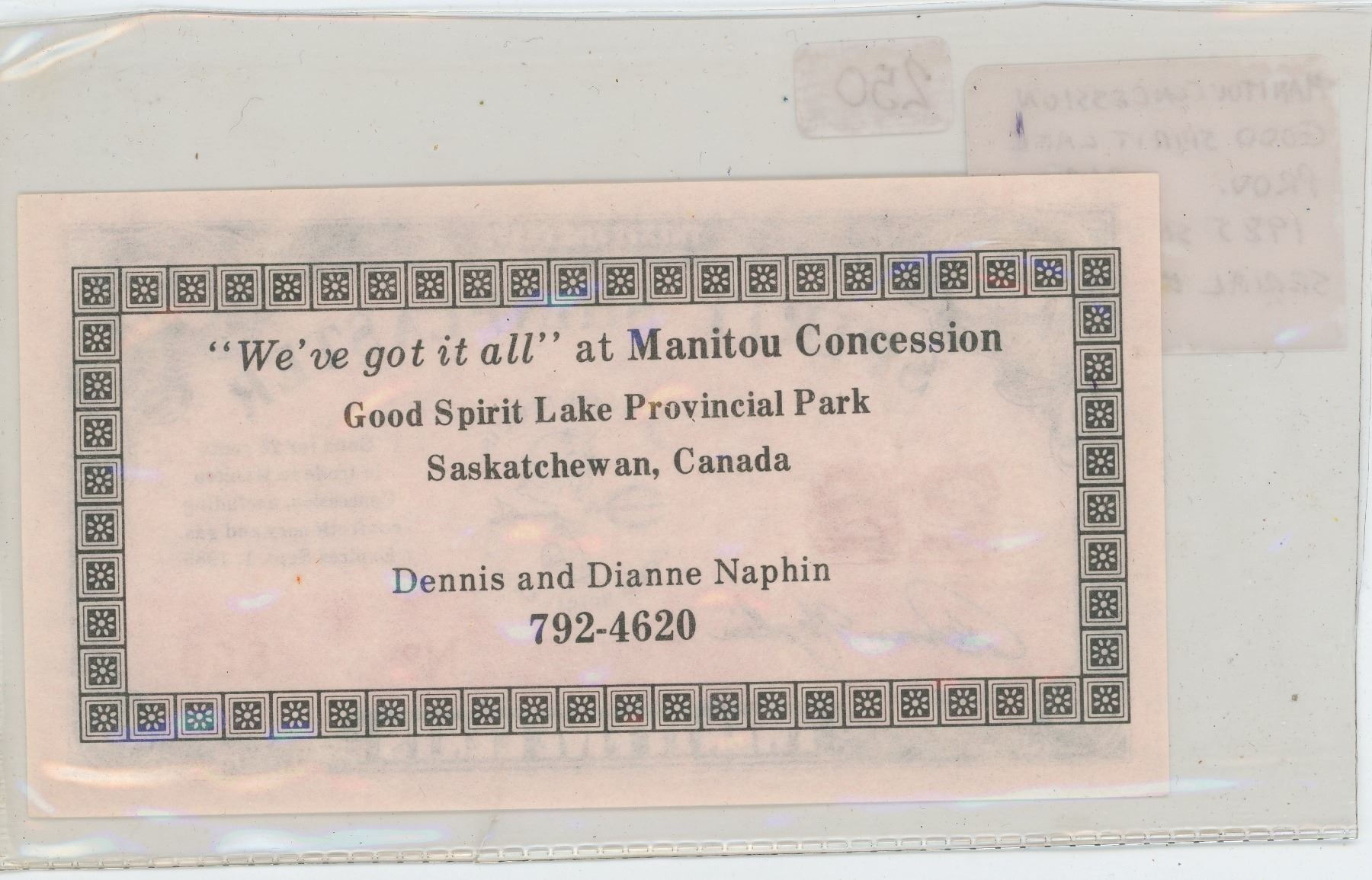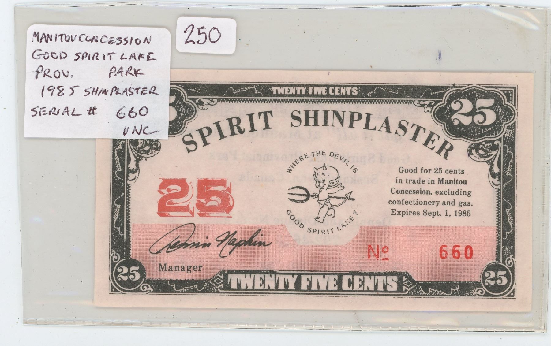 MANITOU CONCESSION, GOOD SPIRIT LAKE PROVINCIAL PARK 1985 25 CENTS SHINPLASTER SCRIP. SERIAL NUMBER 660. UNC.