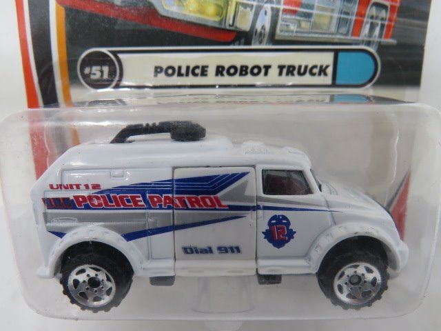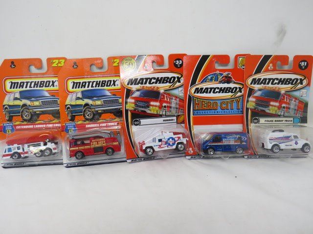 MATCHBOX 5 VEHICLE LOT (POLICE ROBOT TRUCK, 24-HOUR ROOFING, HUMMER, SNORKEL FIRE TRUCK, EXTENDING LADDER FIRE TRUCK)
