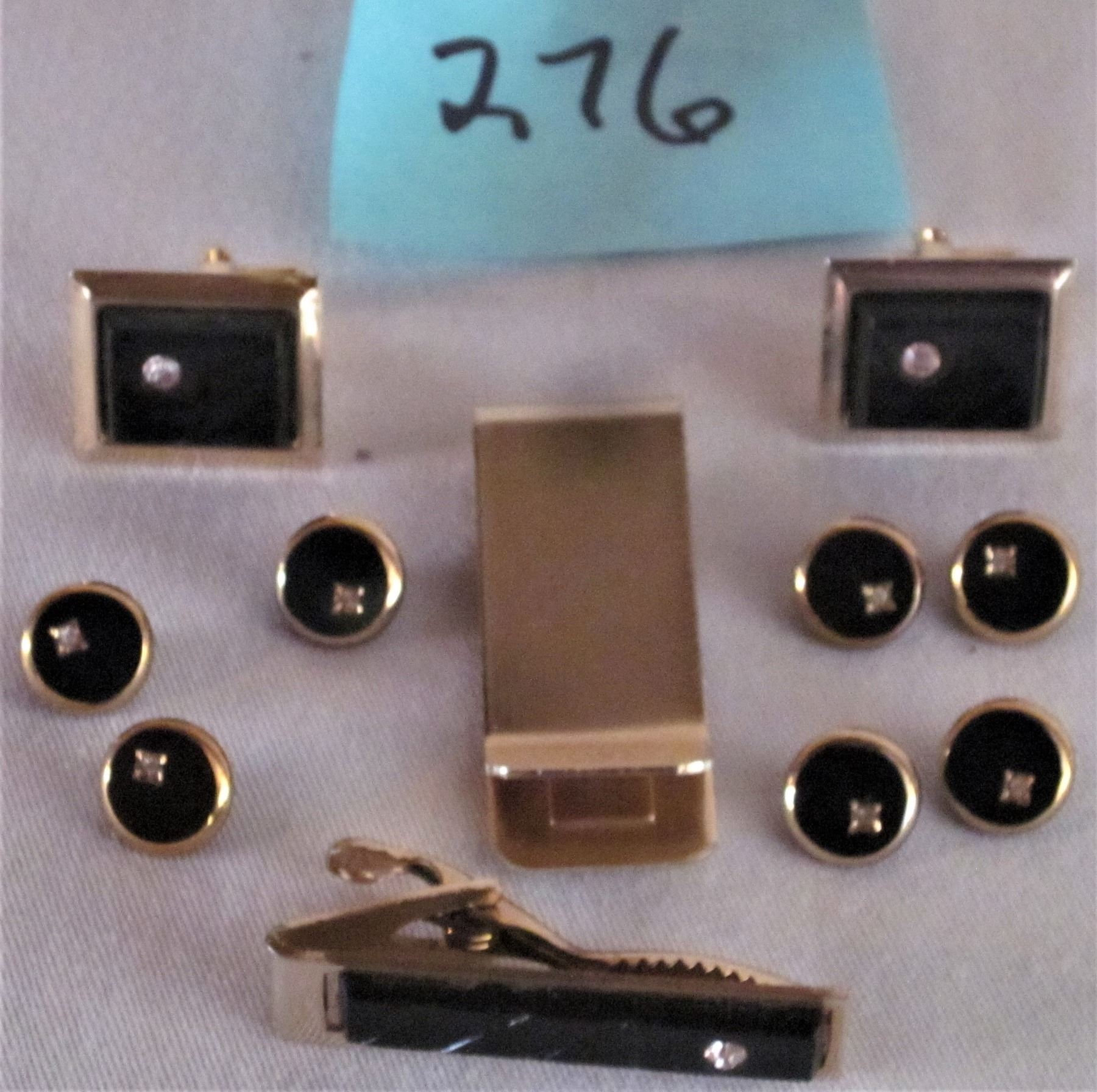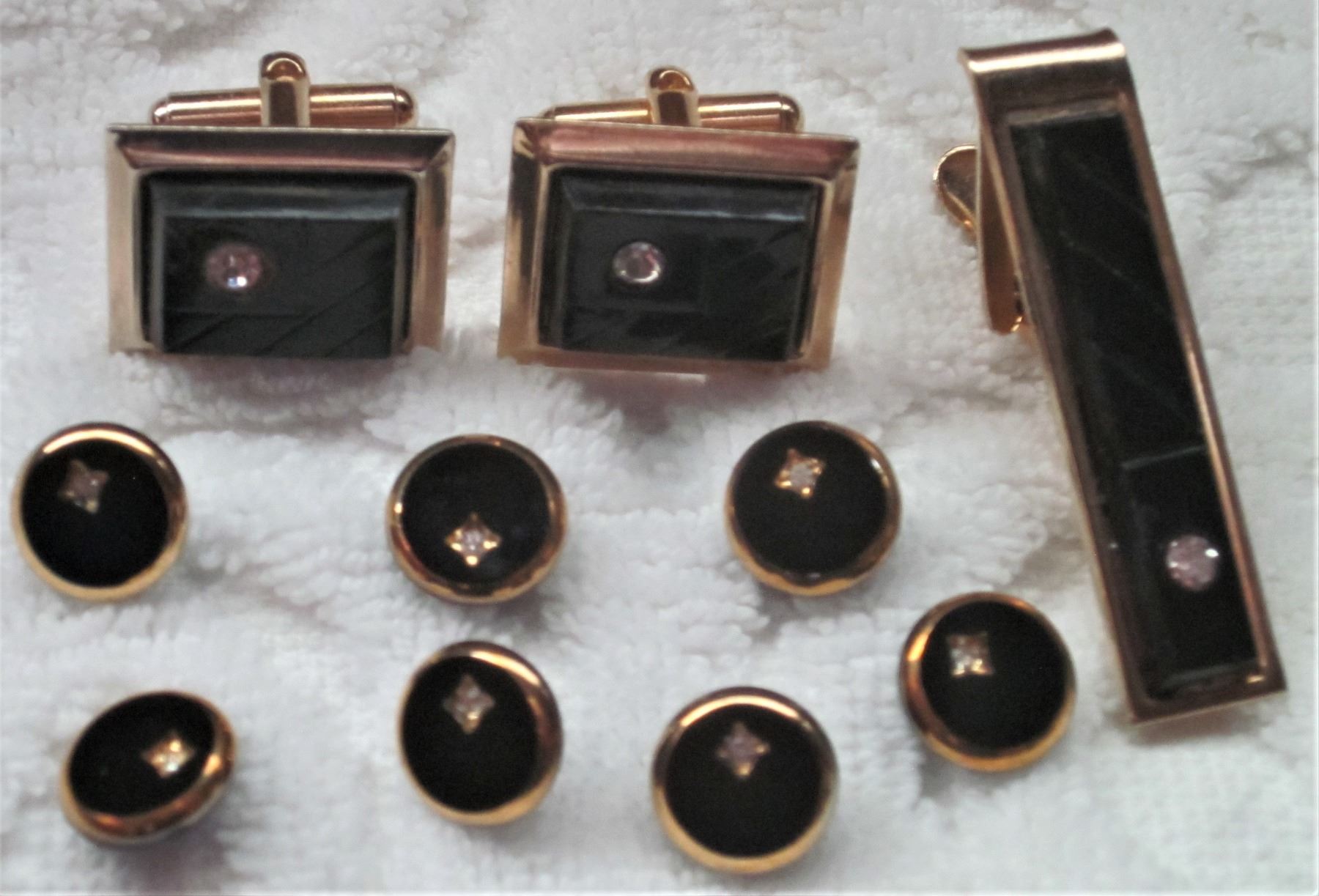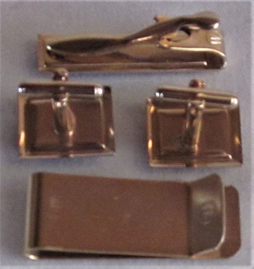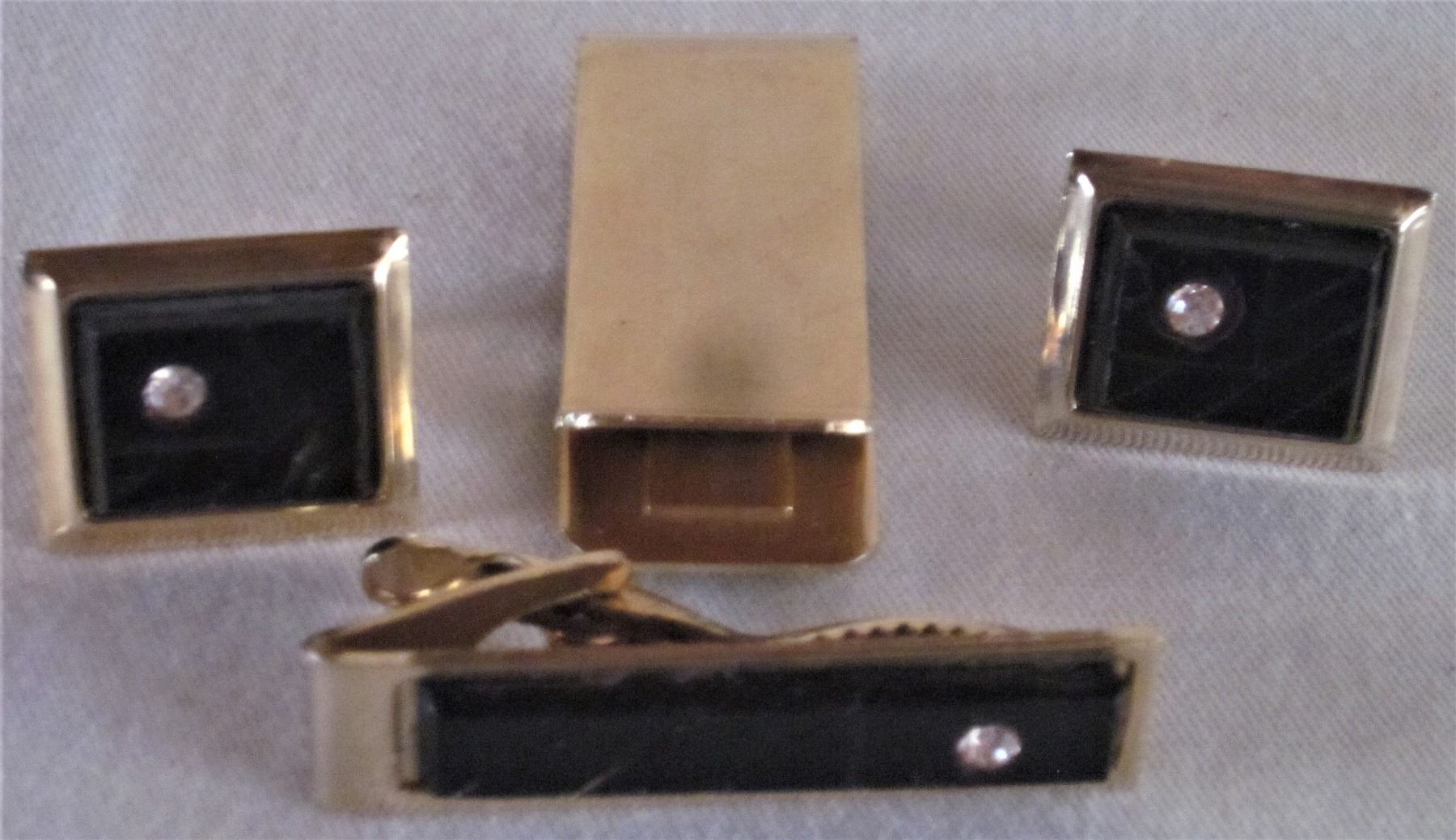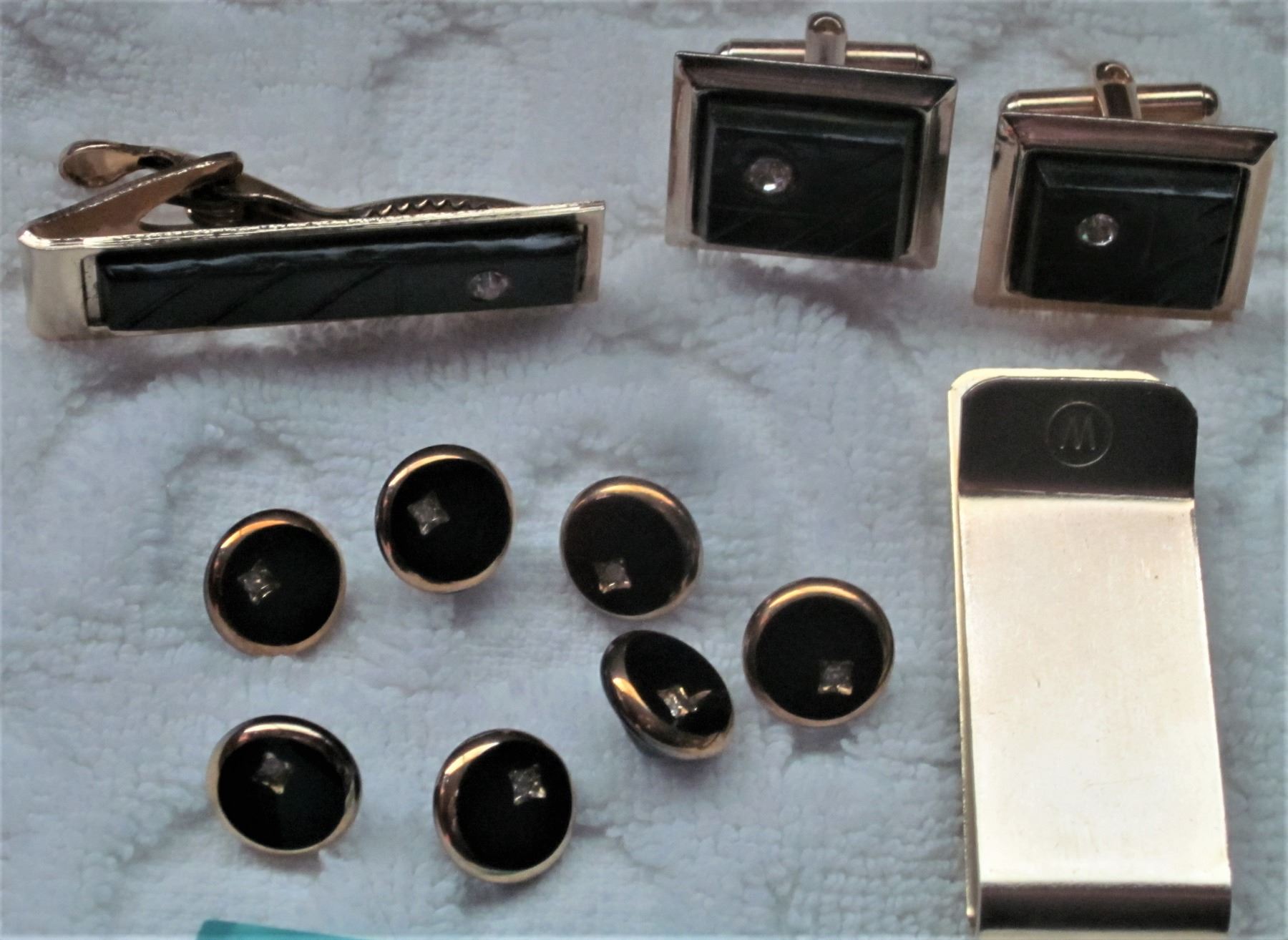 MATCHED SET CUFF LINKS, TIE CLIP, BILL FOLDER AND 7 BUTTONS