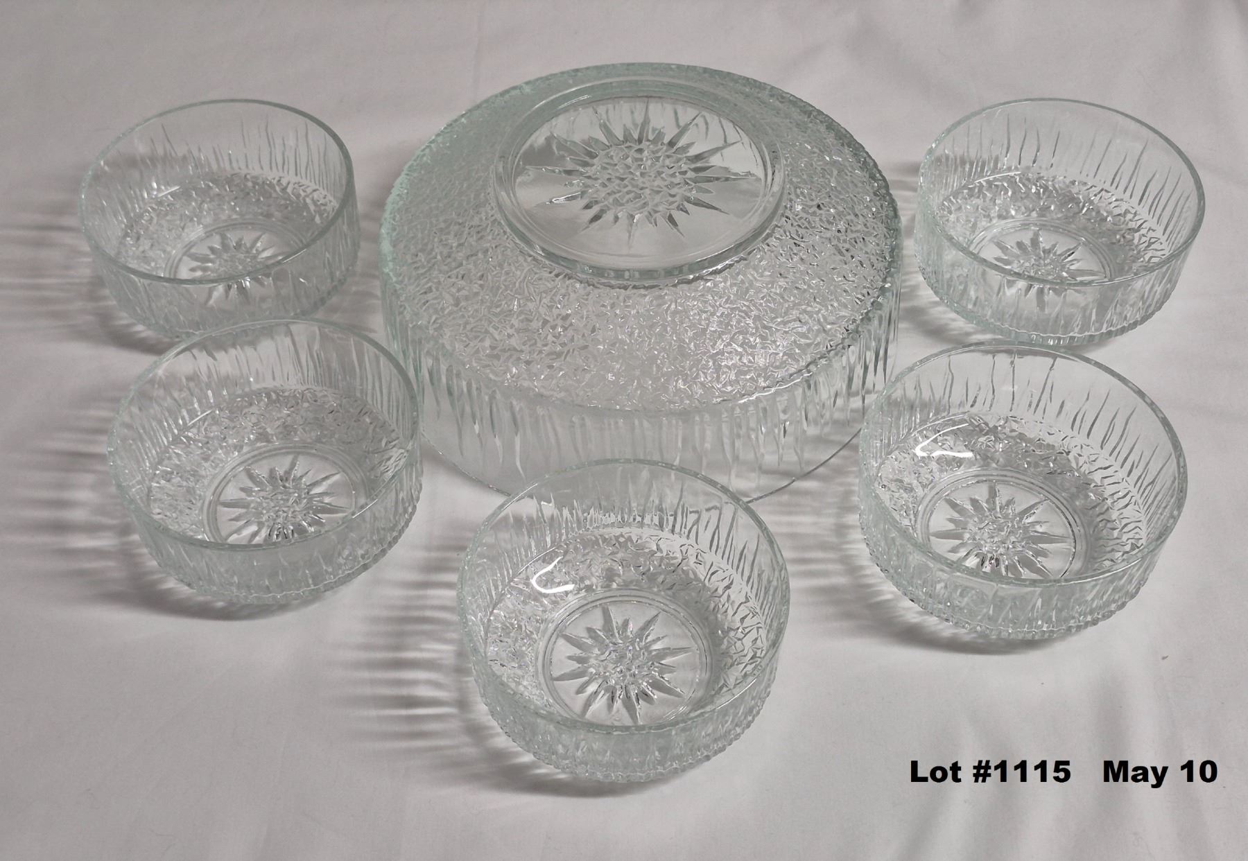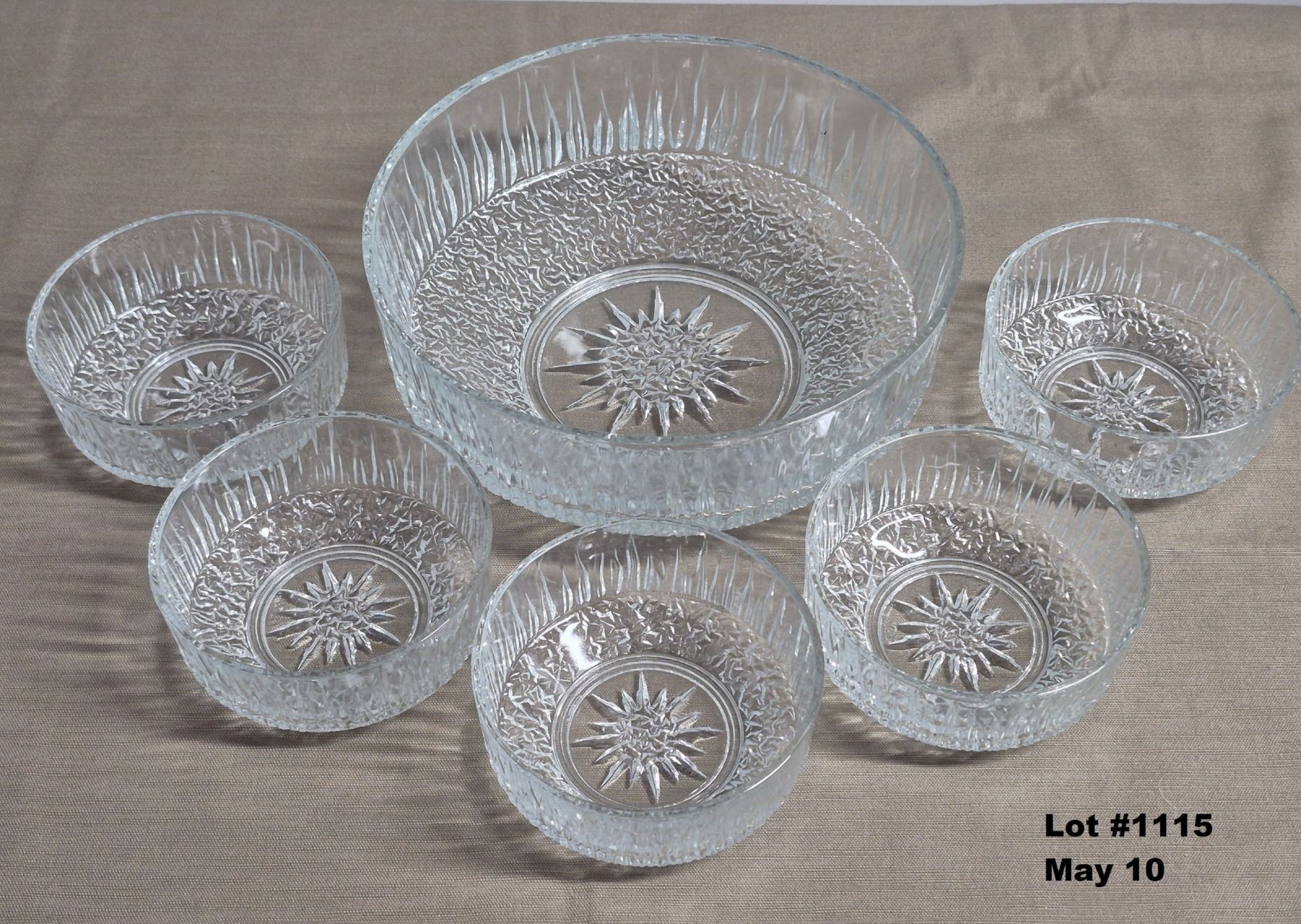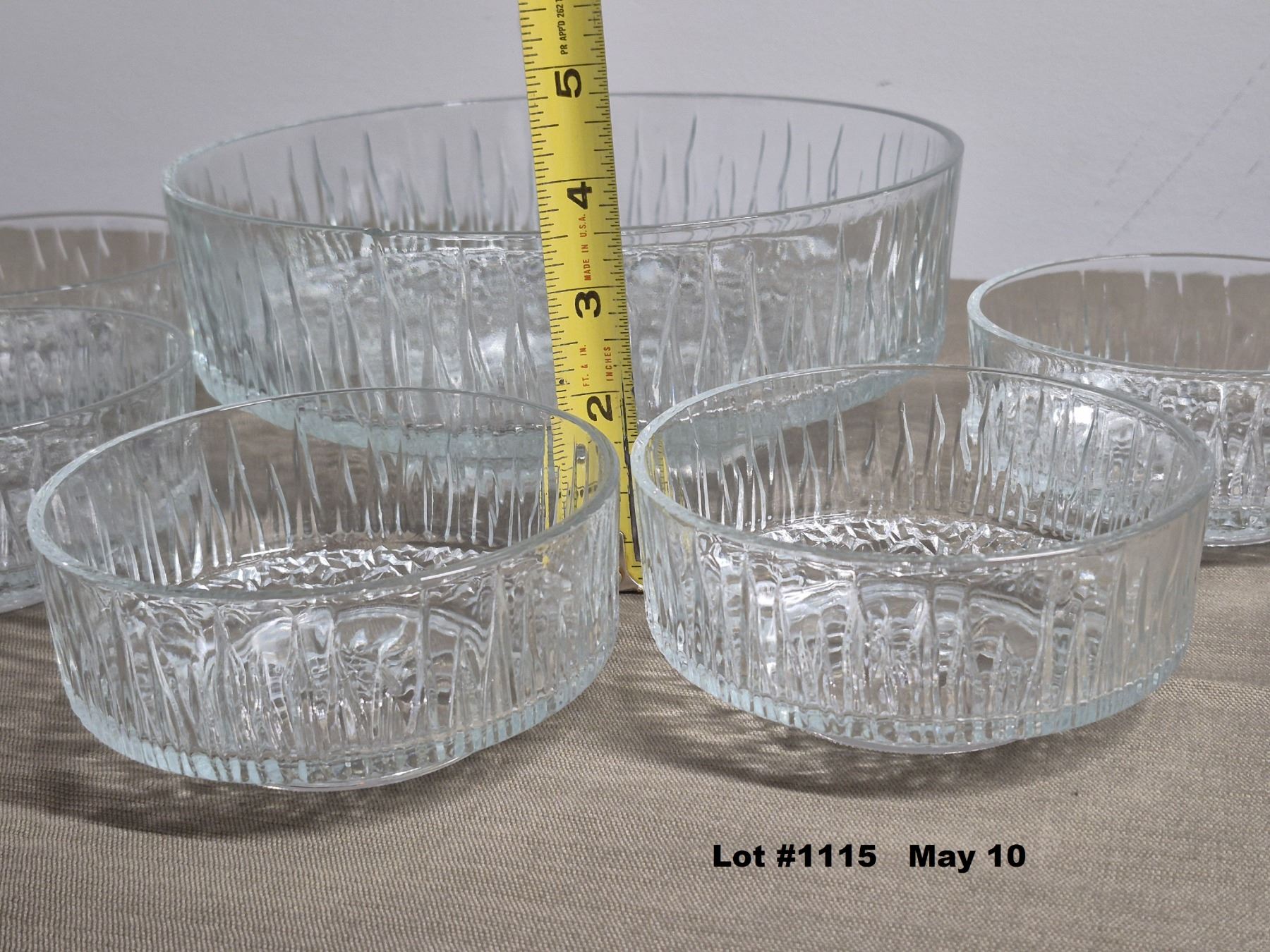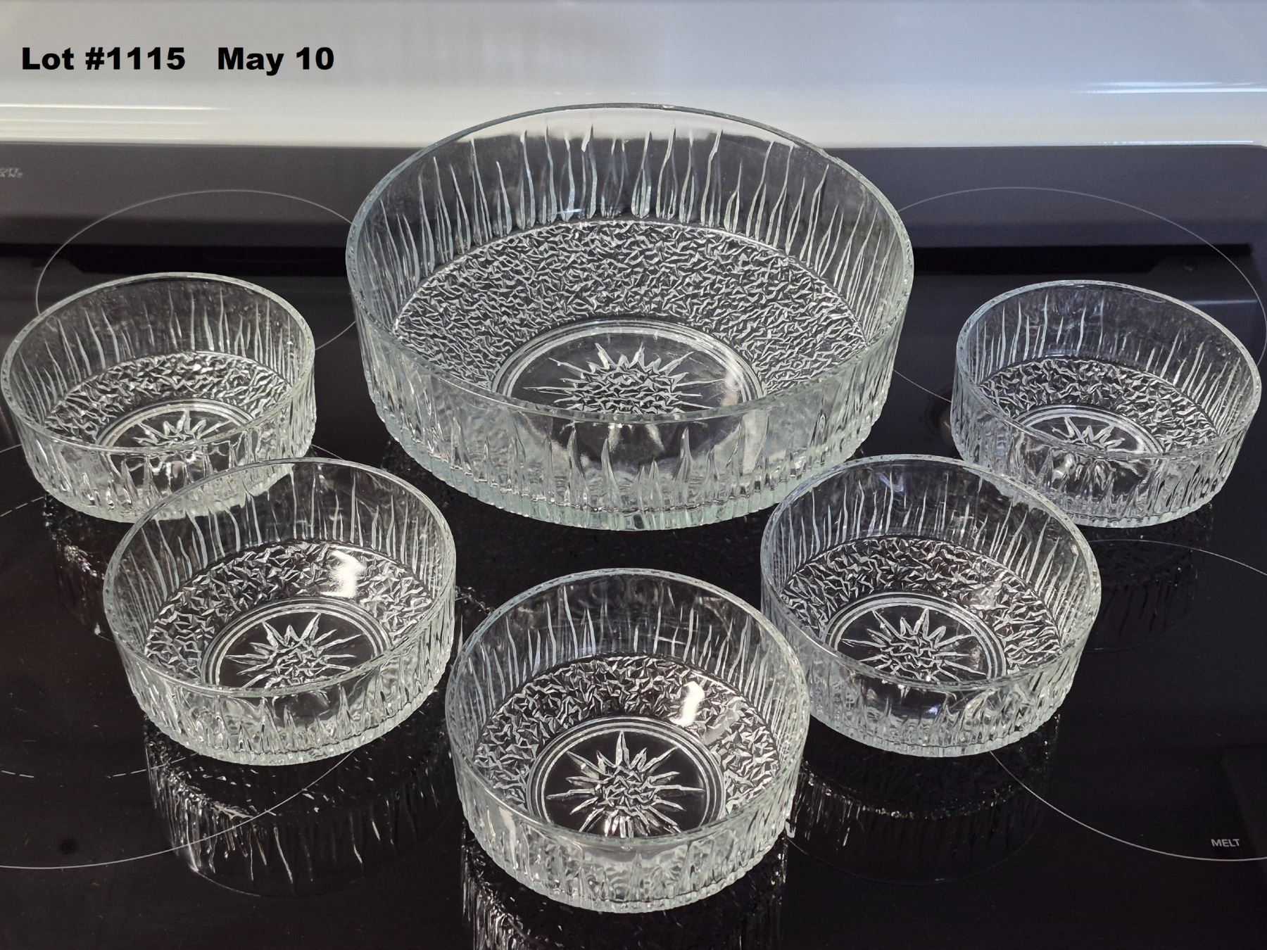 MCM 1970's Vintage Ravenhead White Fire Bowl Set. Cracked Ice Design. (1) Large Bowl 9" and (5) Small Bowls 4.5".