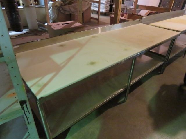 MEAT CUTTING TABLE, STAINLESS W/ CUTTING BOARD TOP AND KNIFE HOLDERS, UNDER-COUNTER SHELF 31"DX3'HX8'L W/ 6" BACK SPLASH