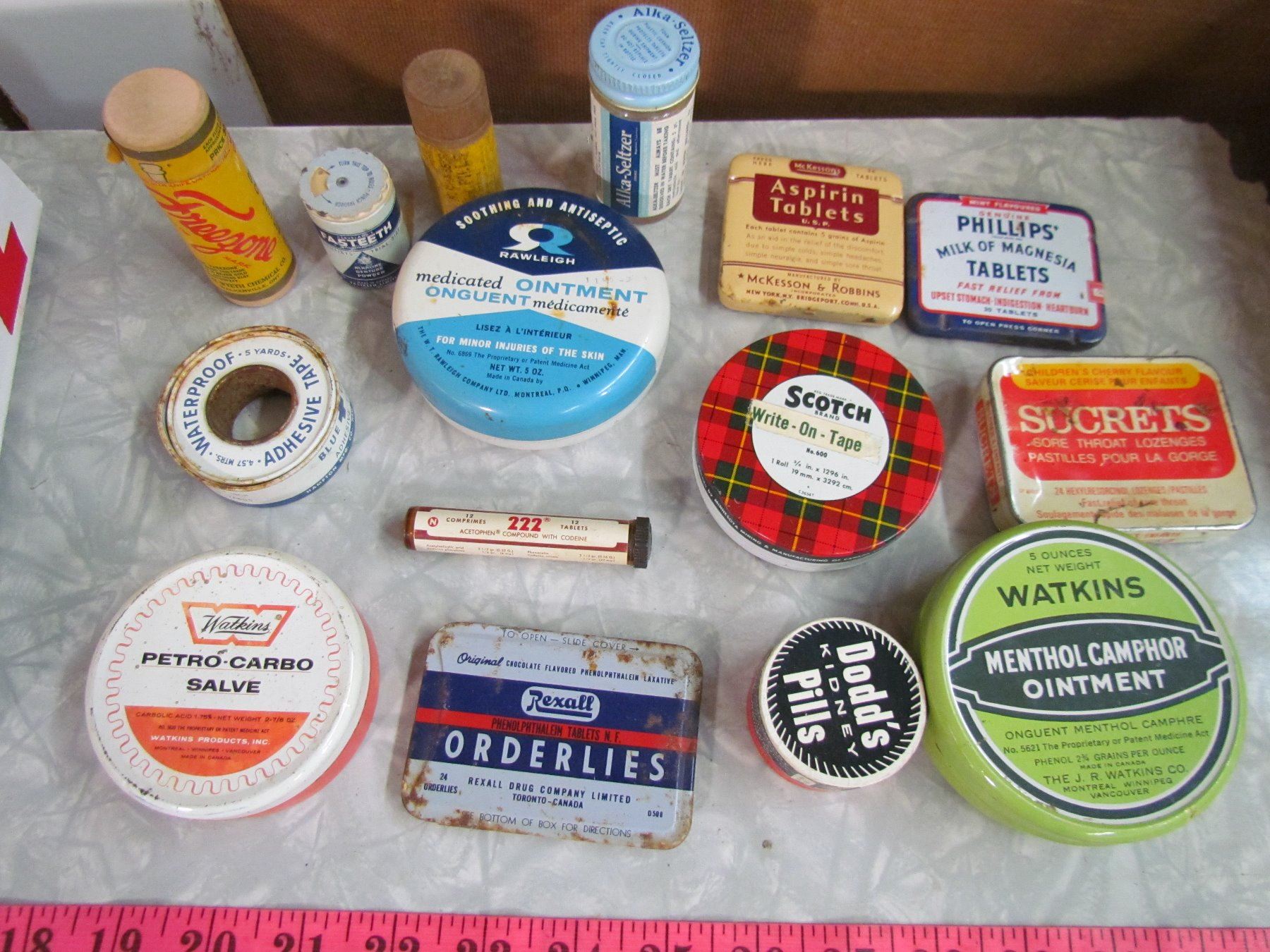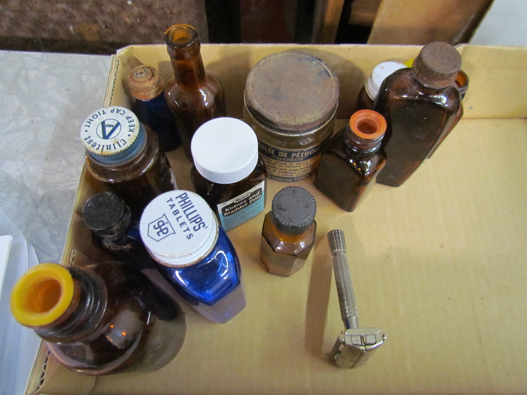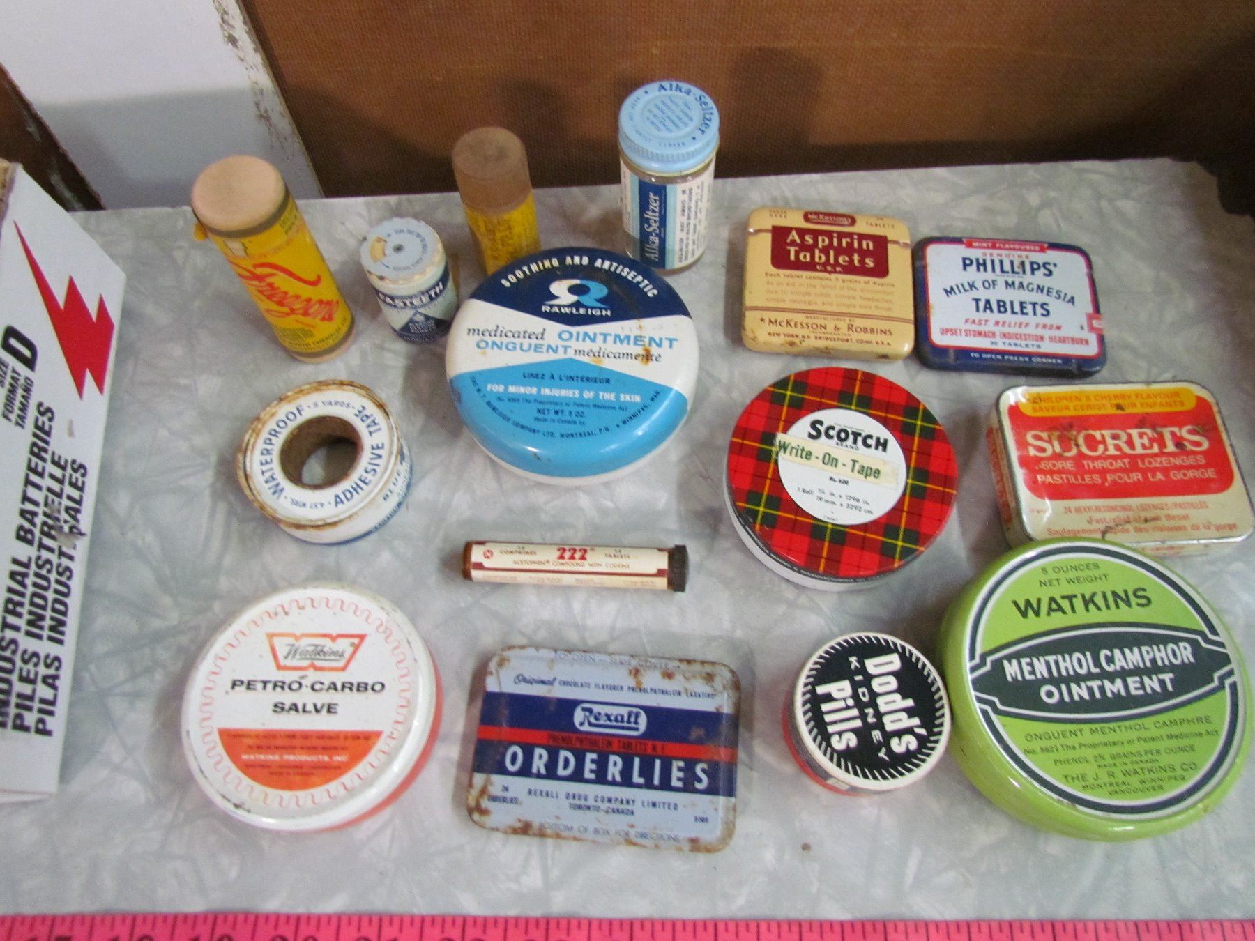 MEDICINE CABINET JUNK DRAWER (BOTTLES, TINS, RAZOR)