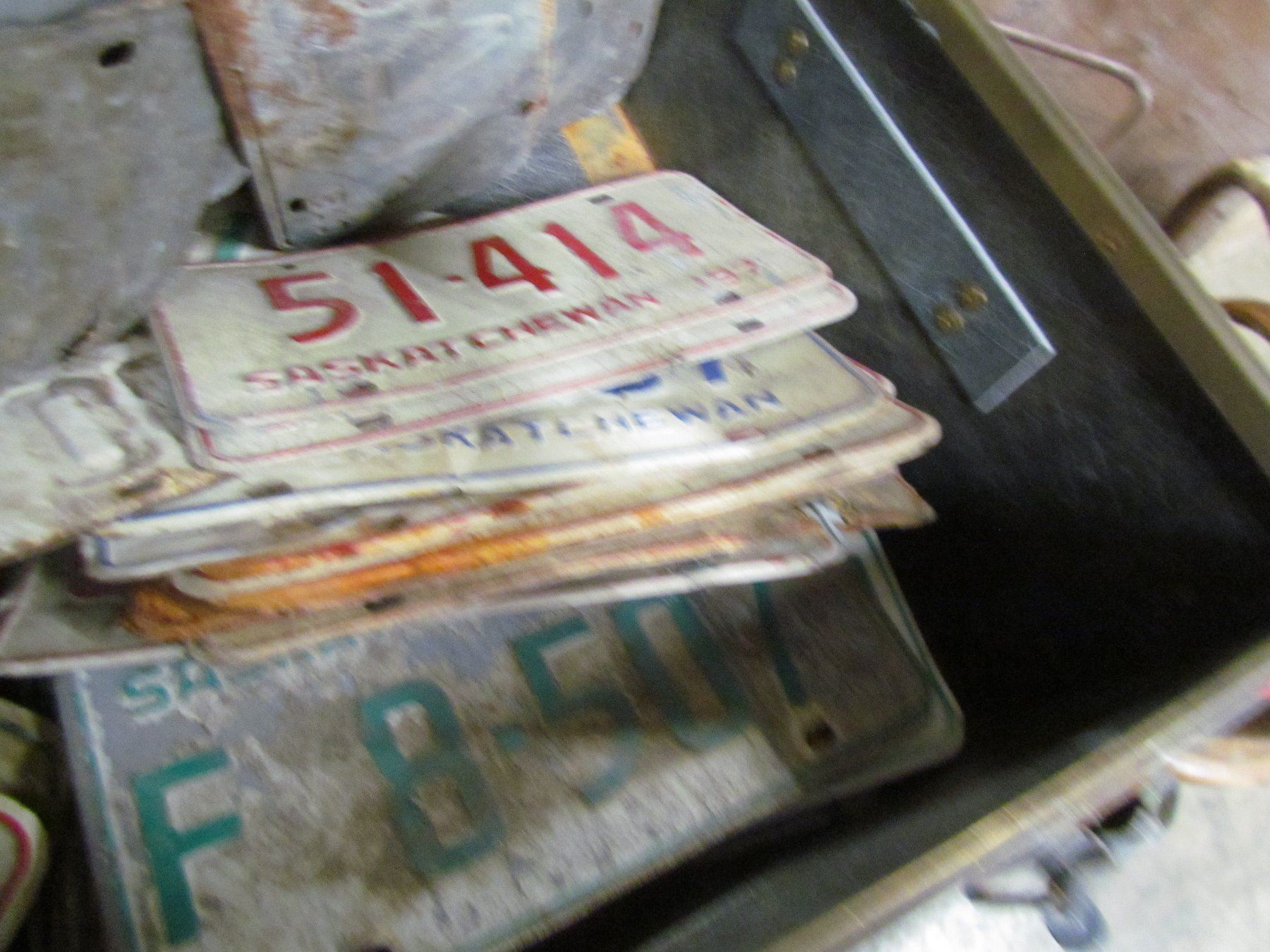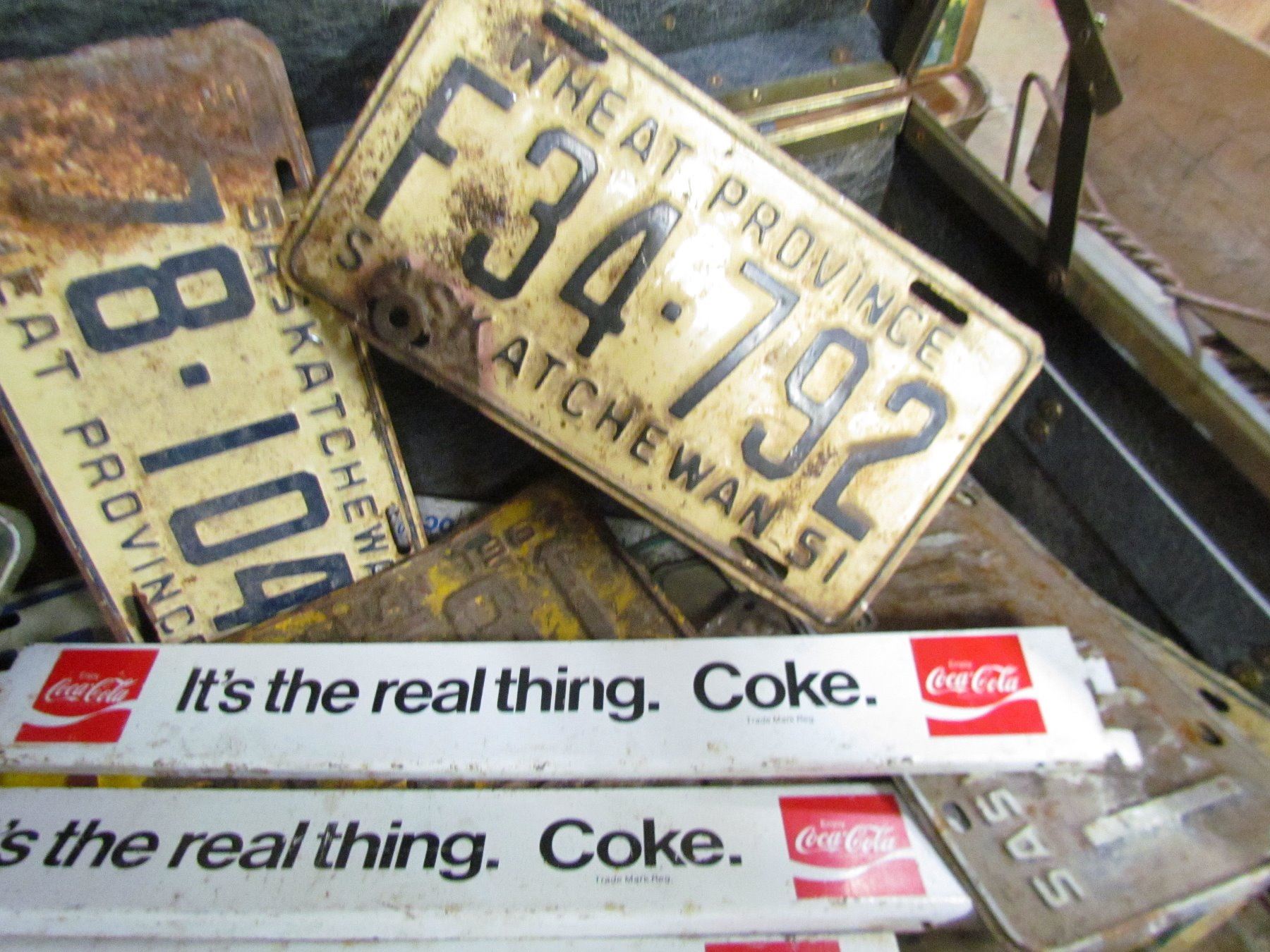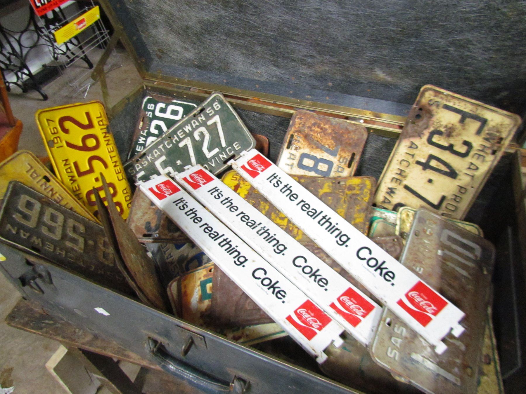 METAL TRUNK (FULL OF LICENSE PLATES) *OVER 75 PCS* (1933, 1949, 5Os, 60s, 70s, etc) + 3 METAL COKE PCS