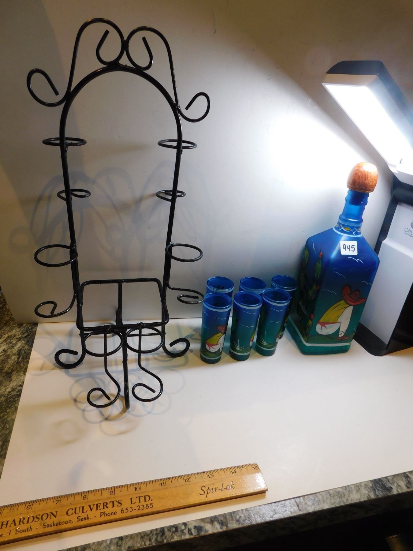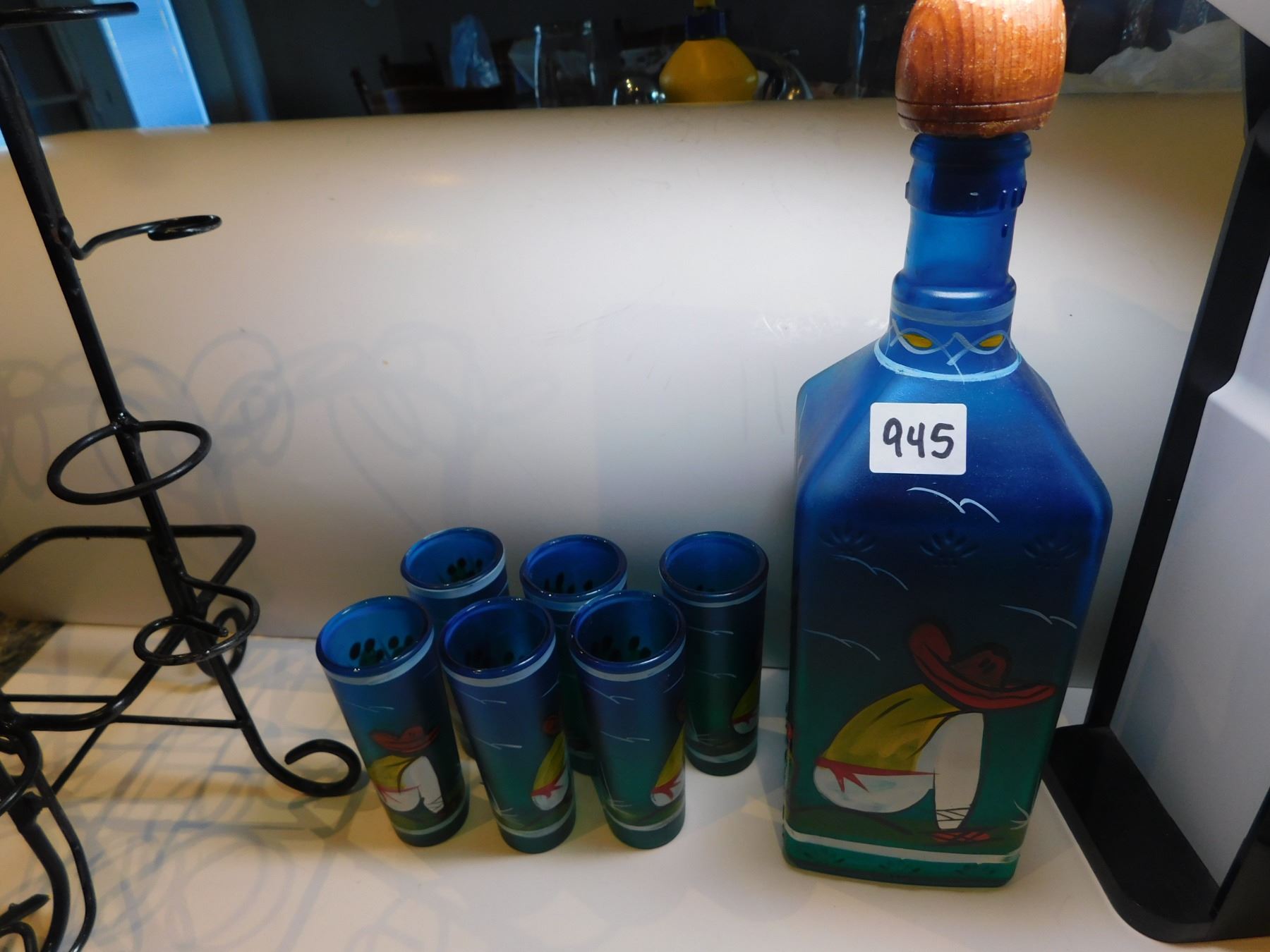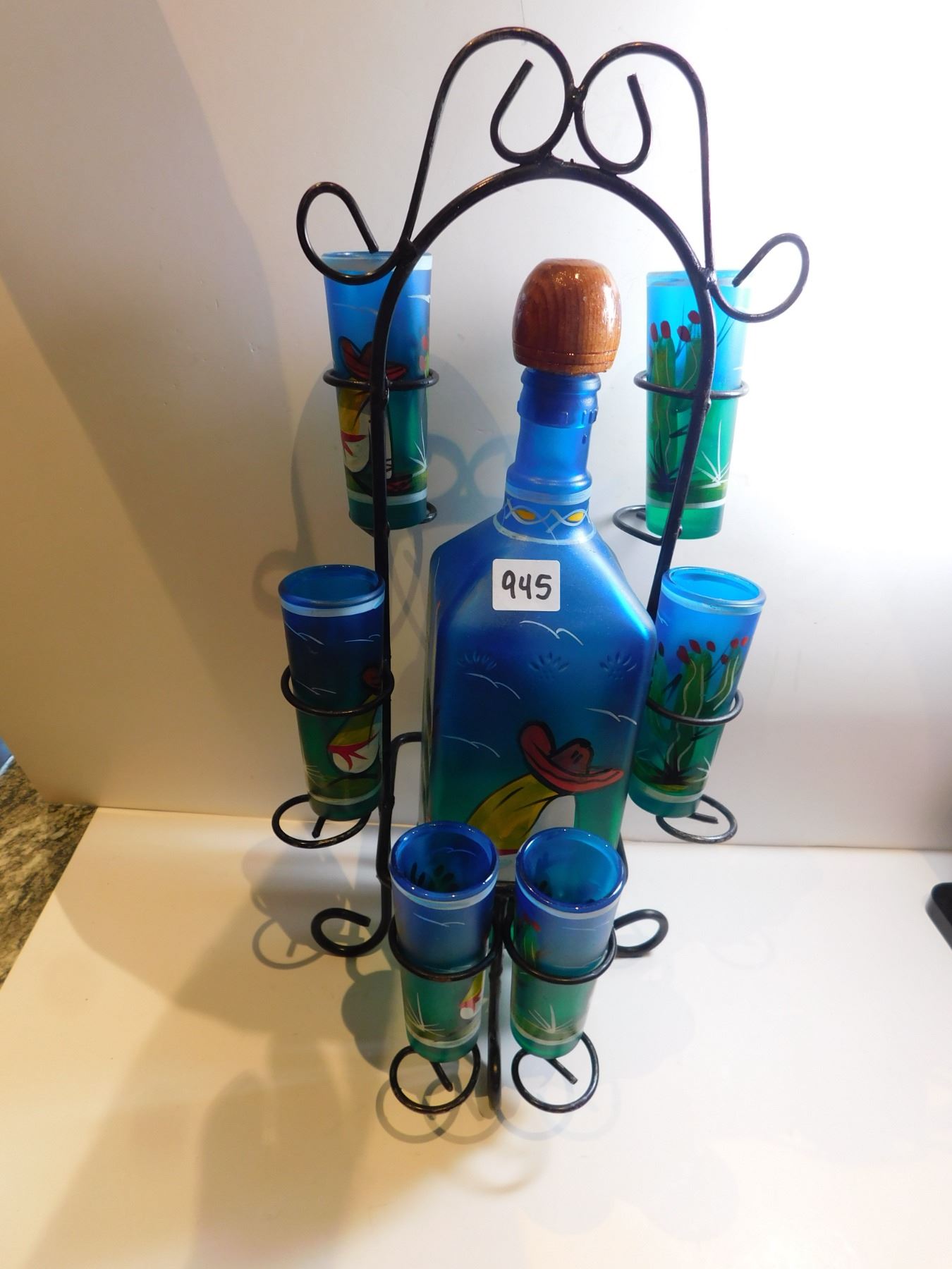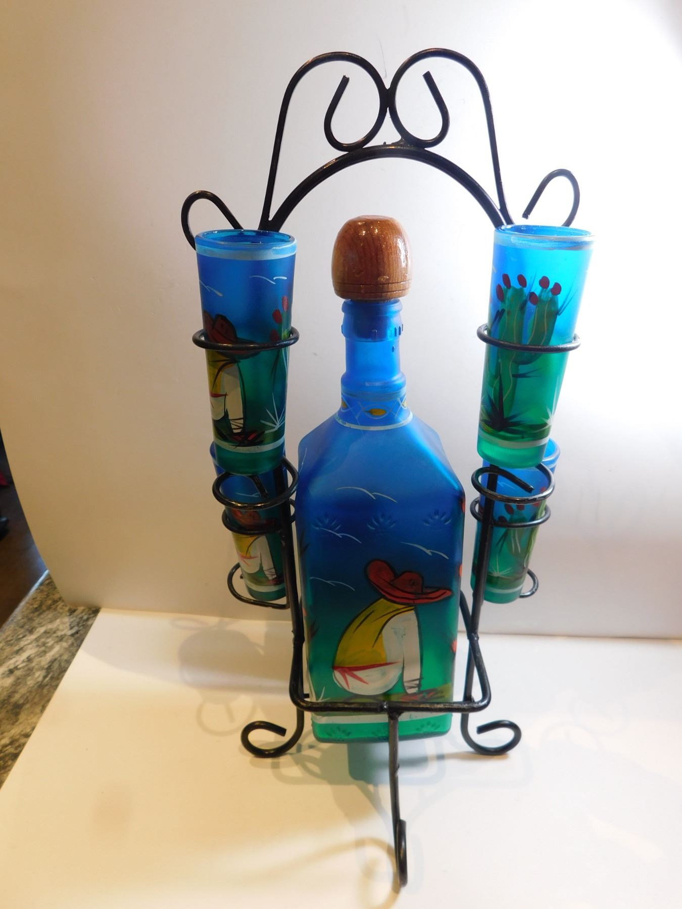 MEXICAN PAINTED DECANTER AND SIX SHOT CUPS WITH STAND