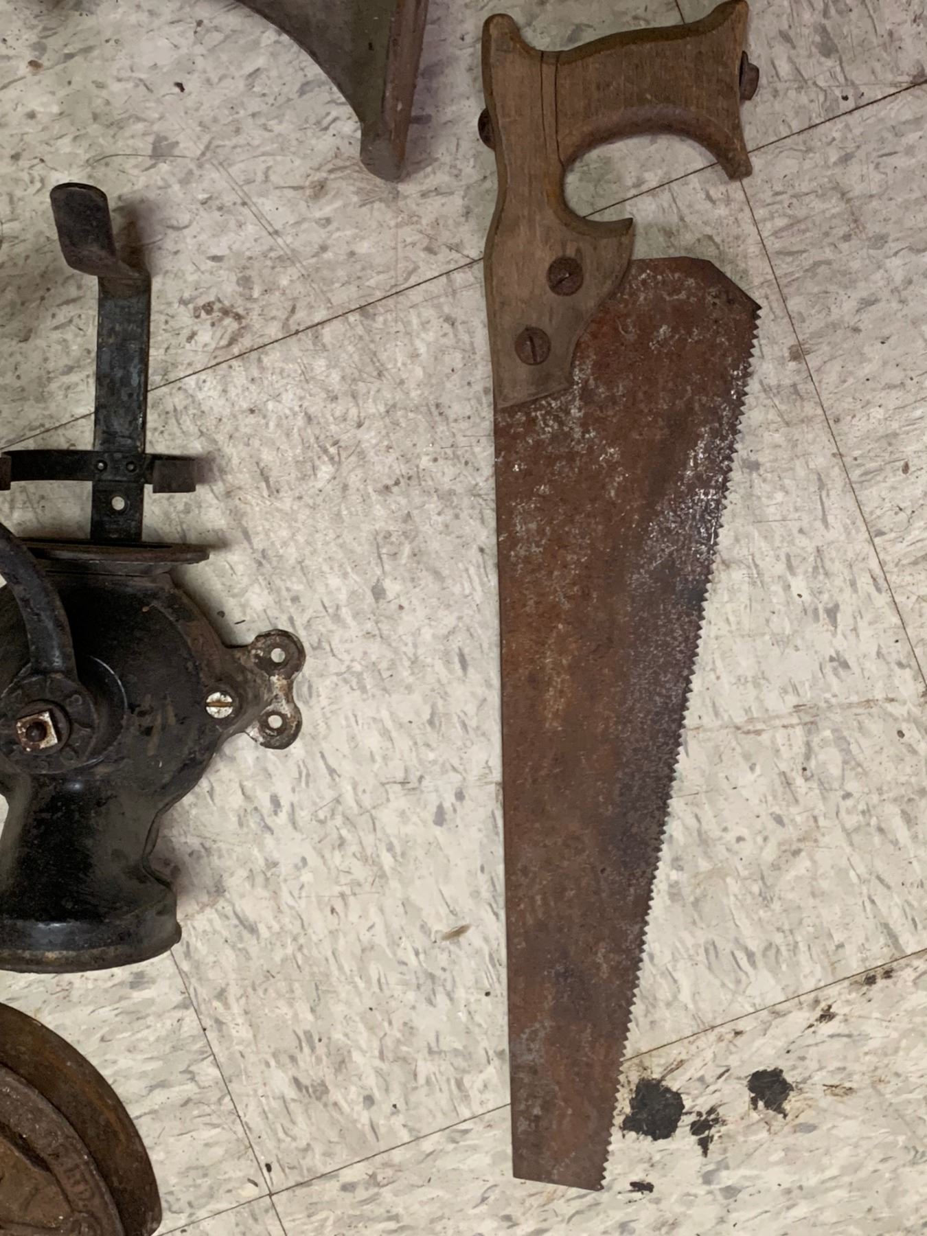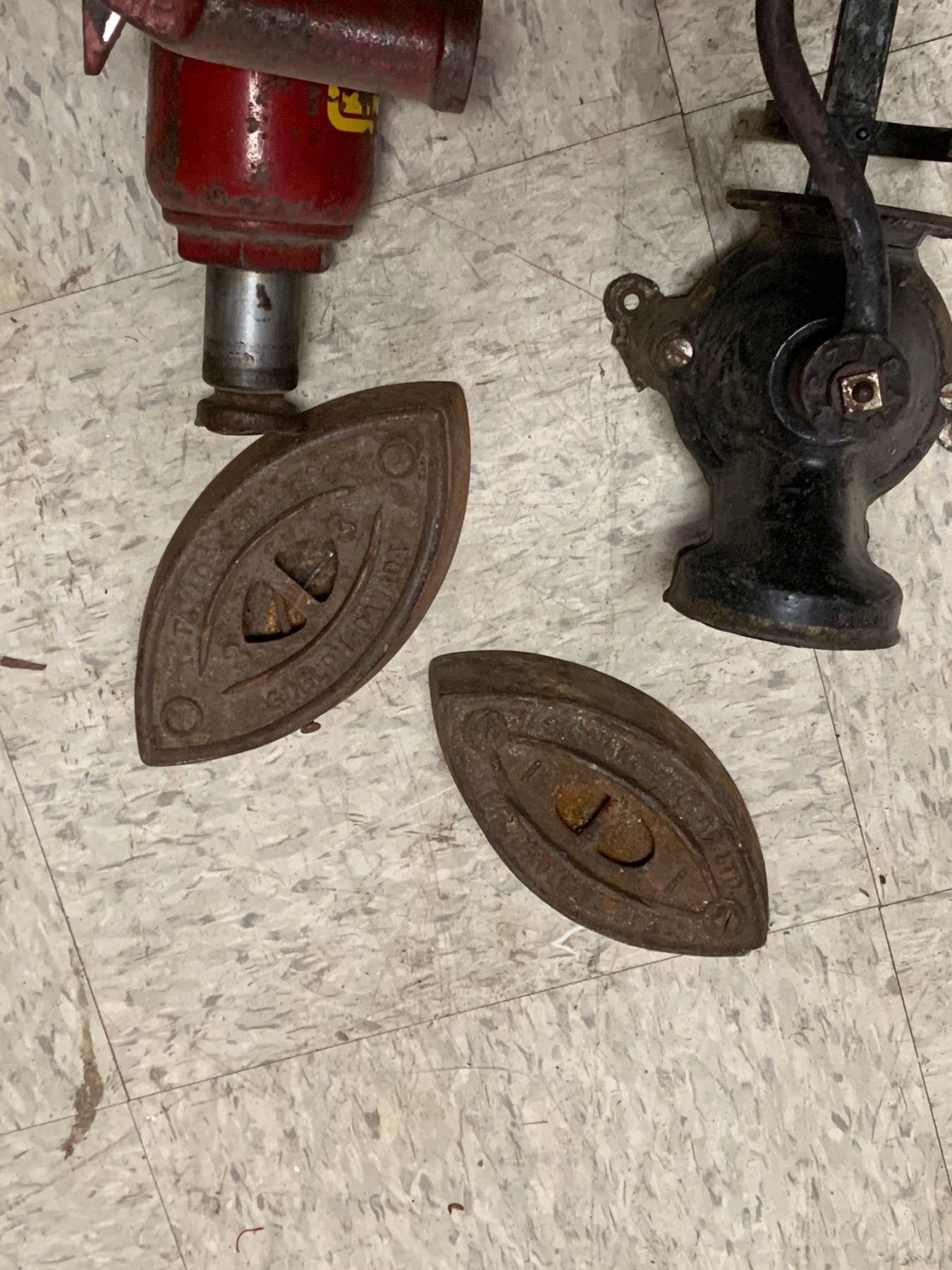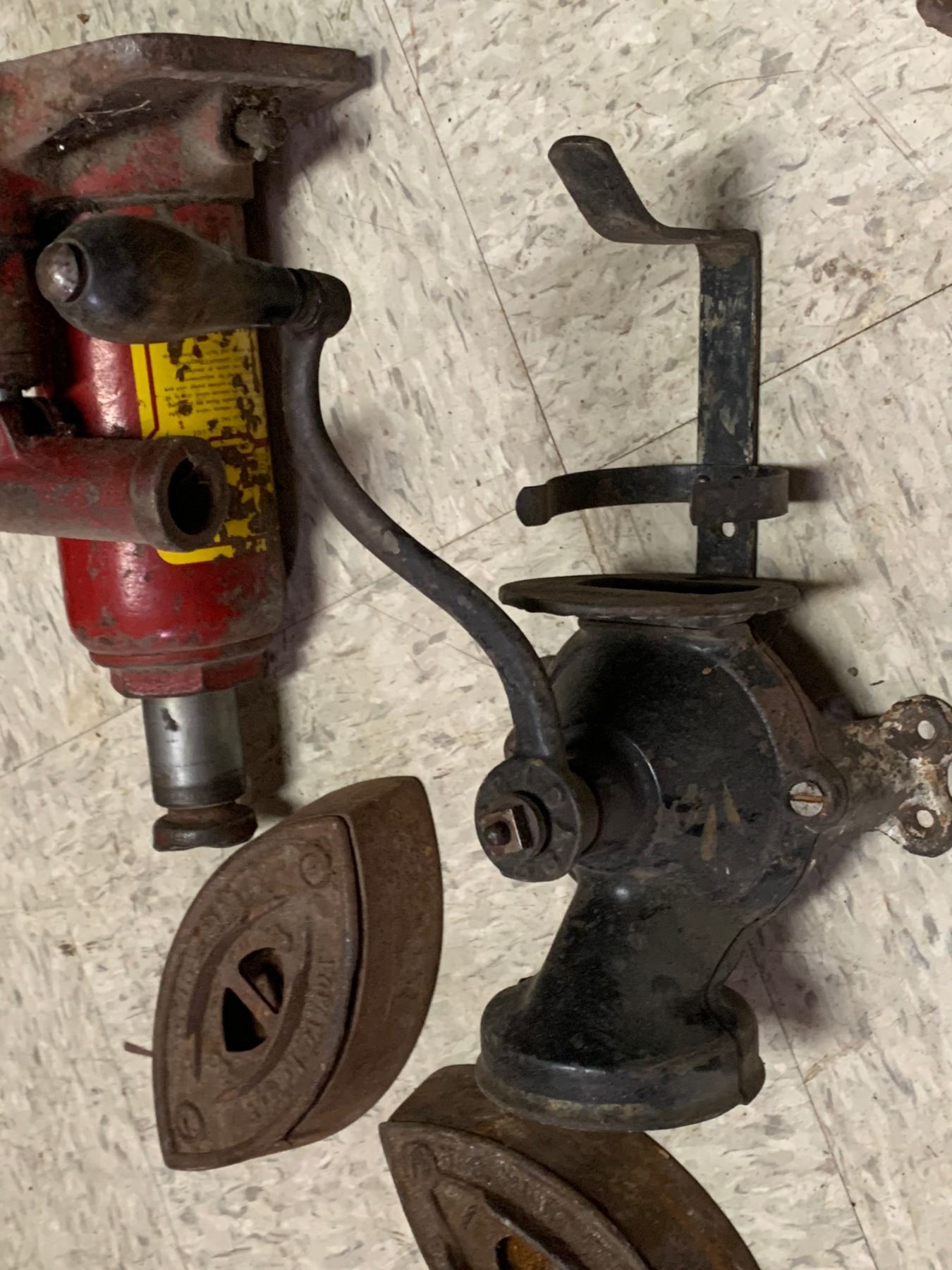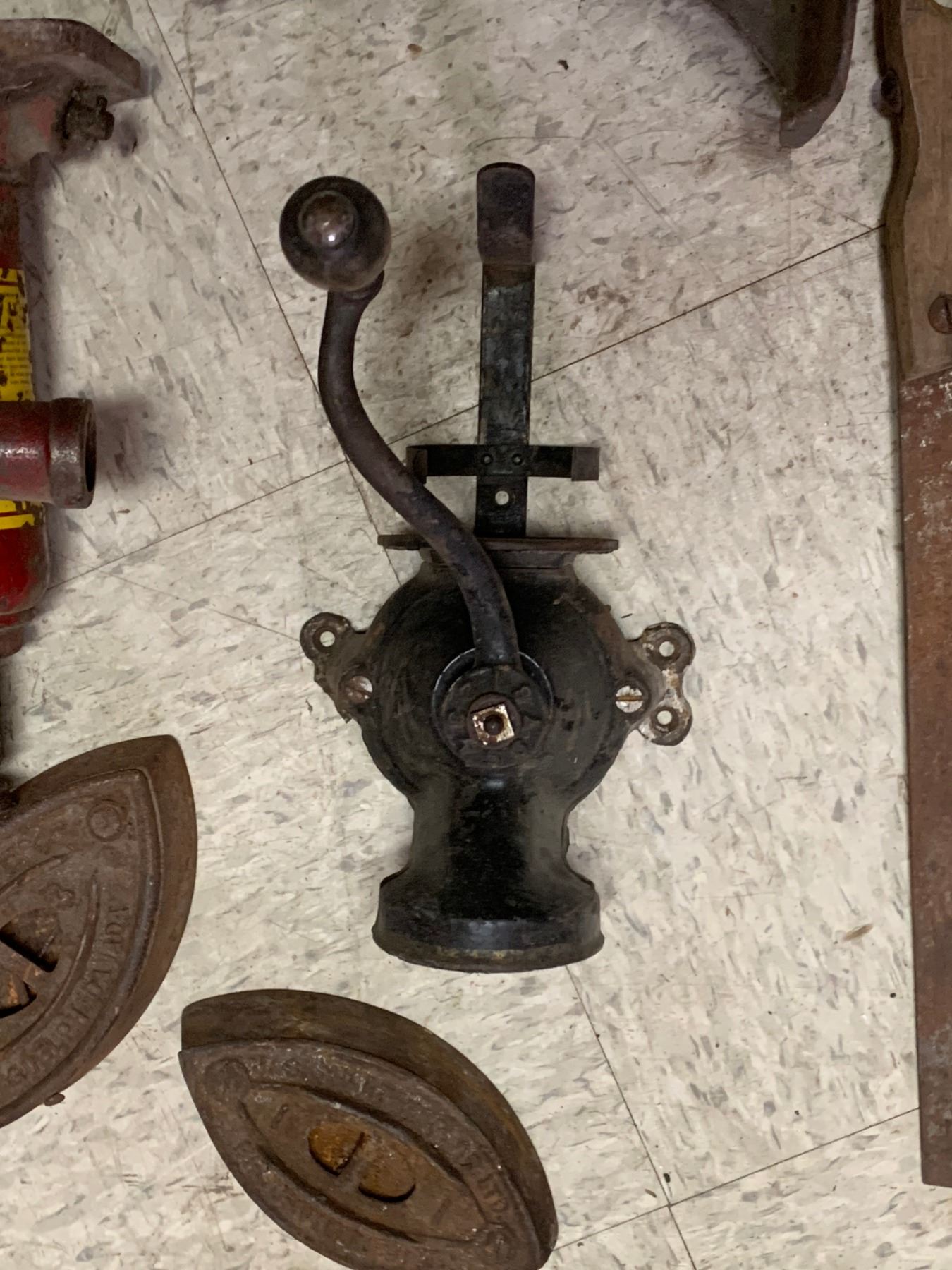 MISC LOT COFFEE GRINDER JACKS SAD IRONS