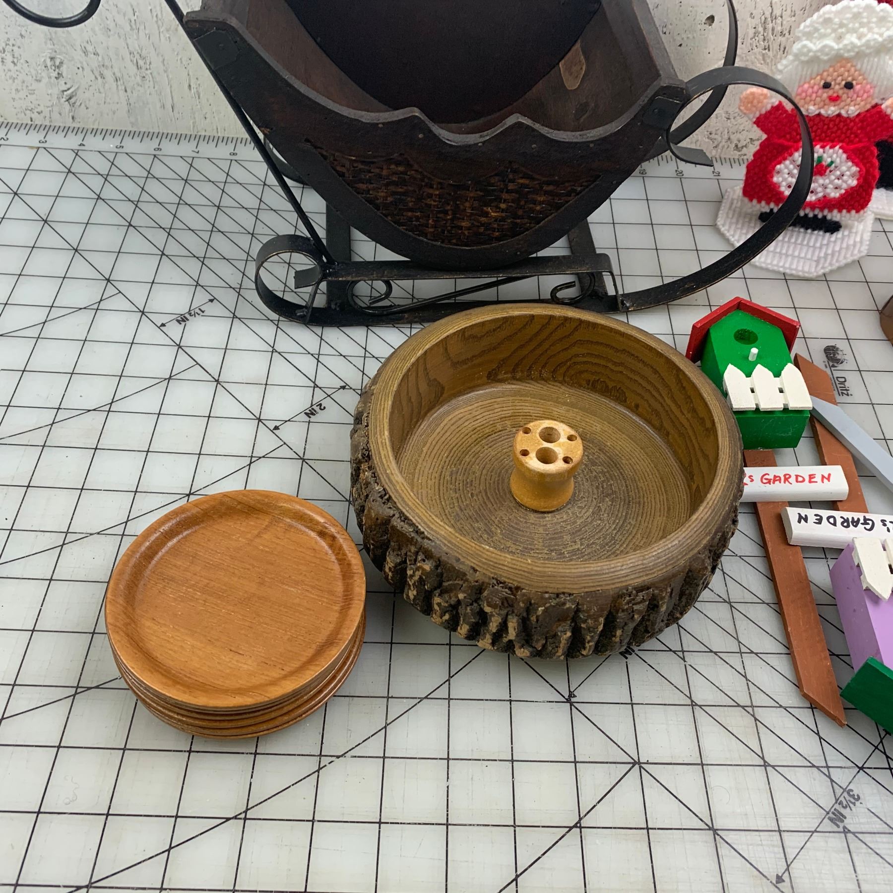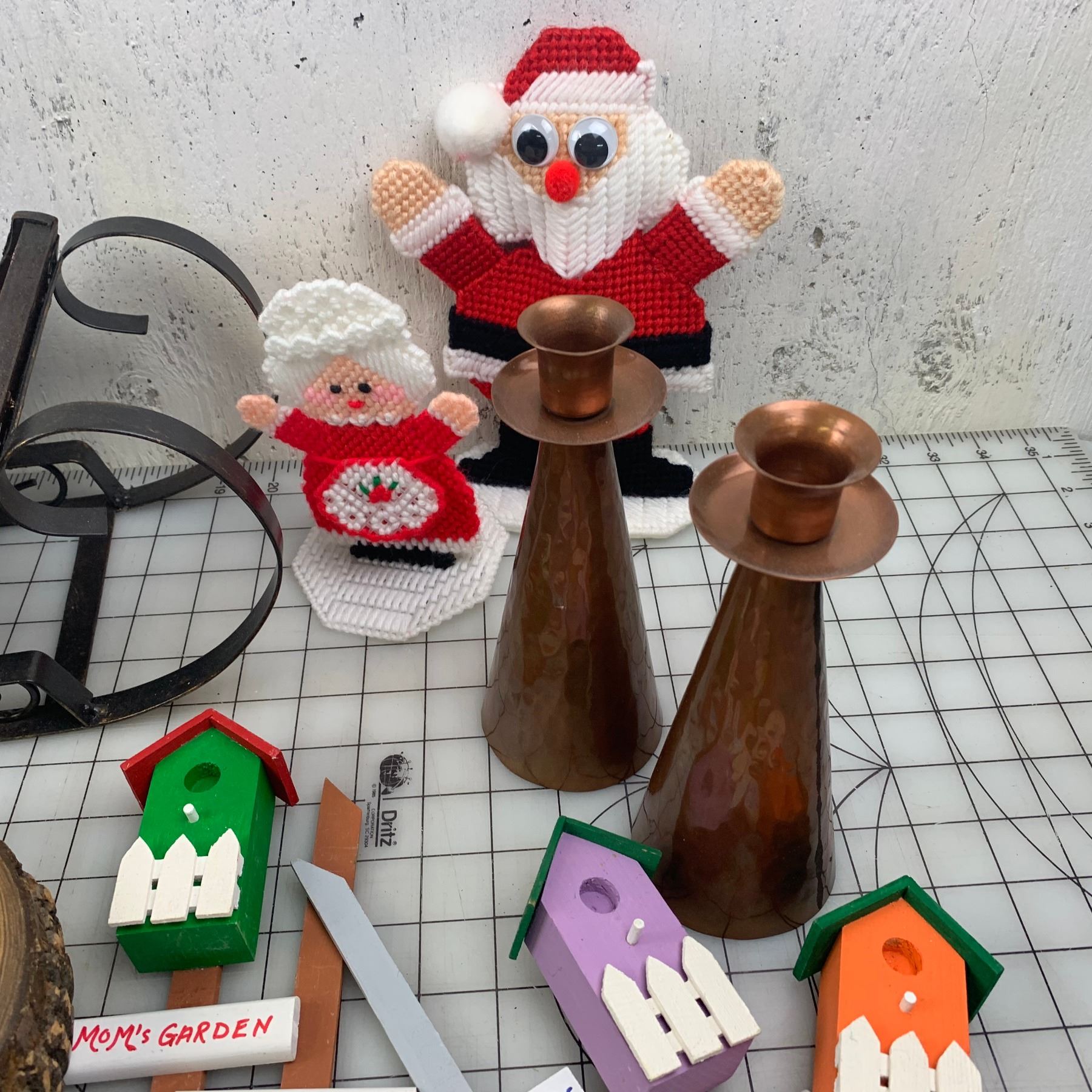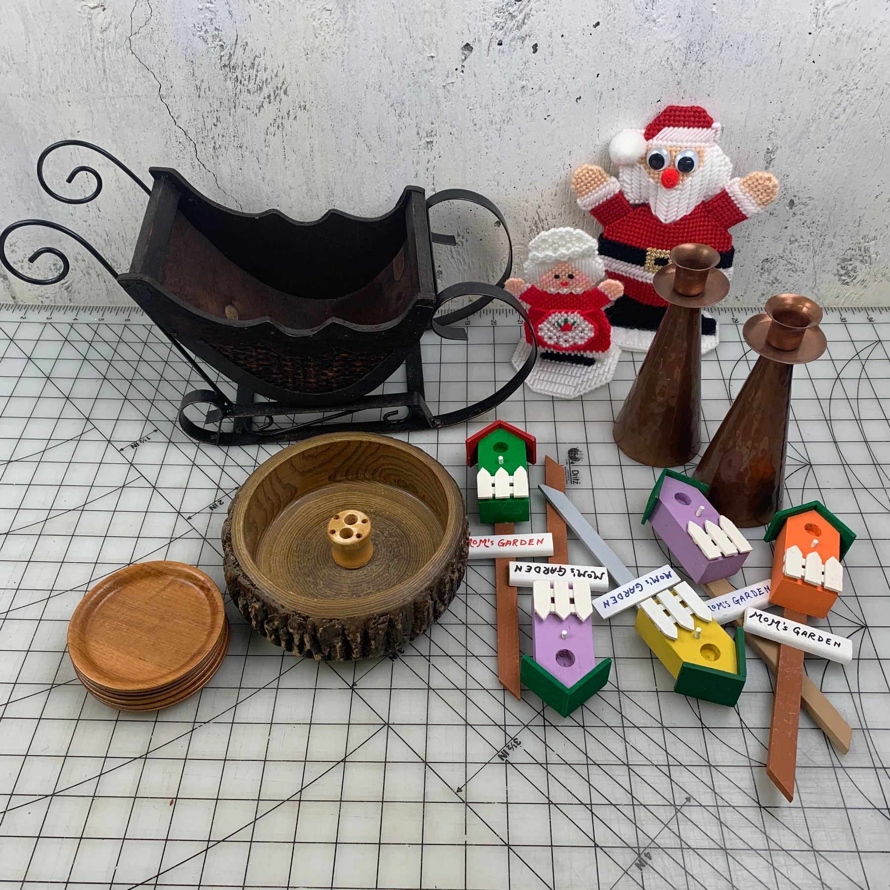 MISC LOT GARDEN STAKES SLEIGH COPPER CANDLE HOLDERS ETC