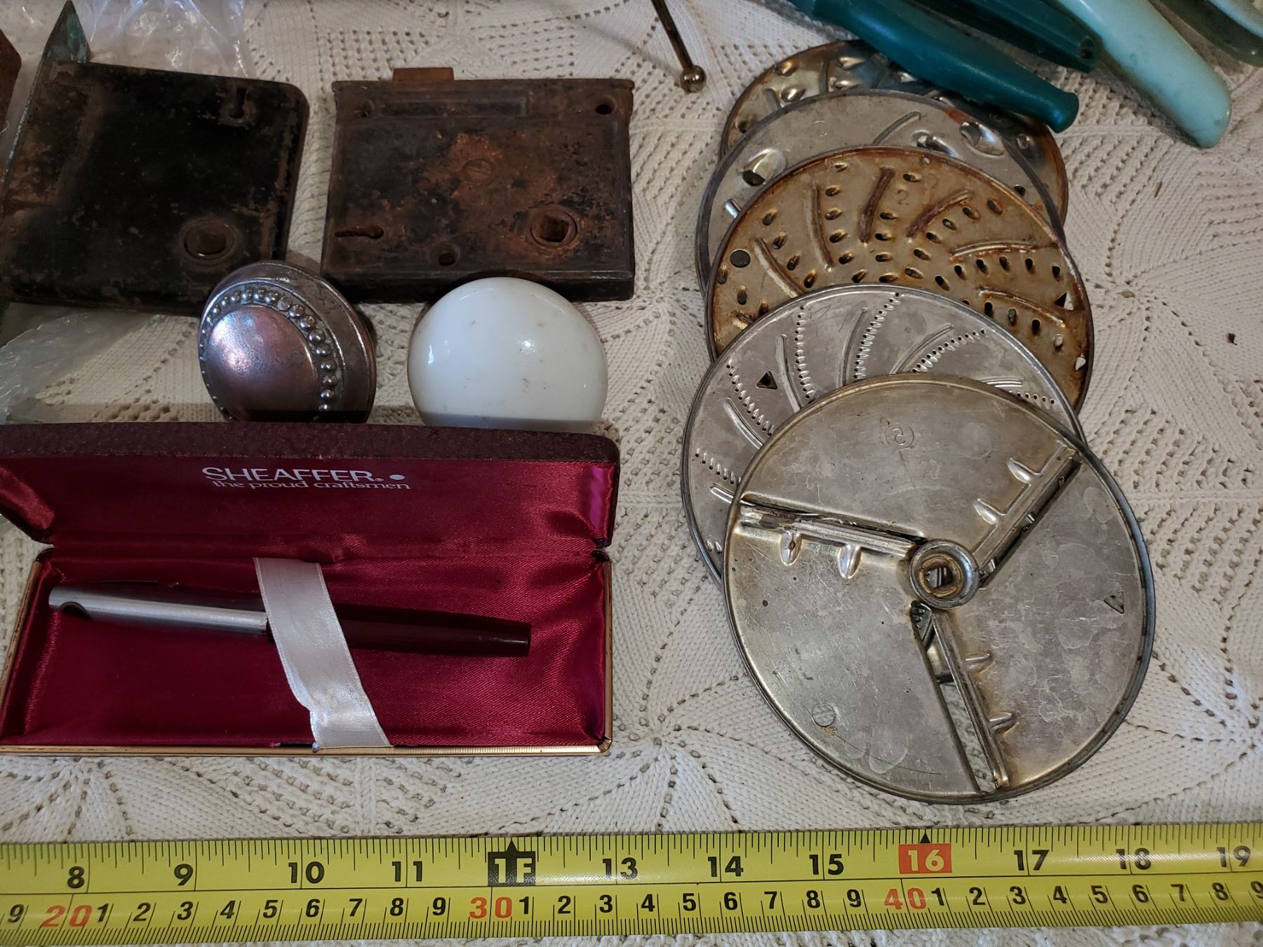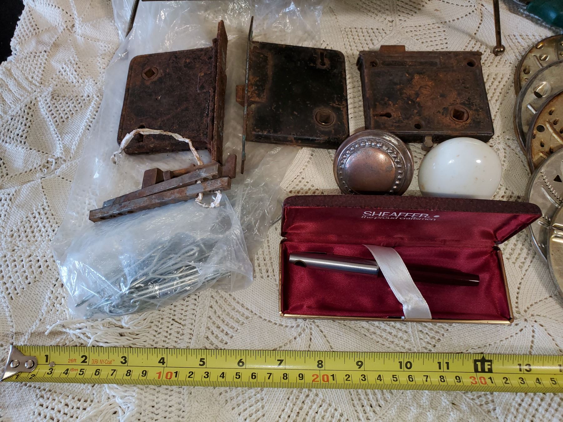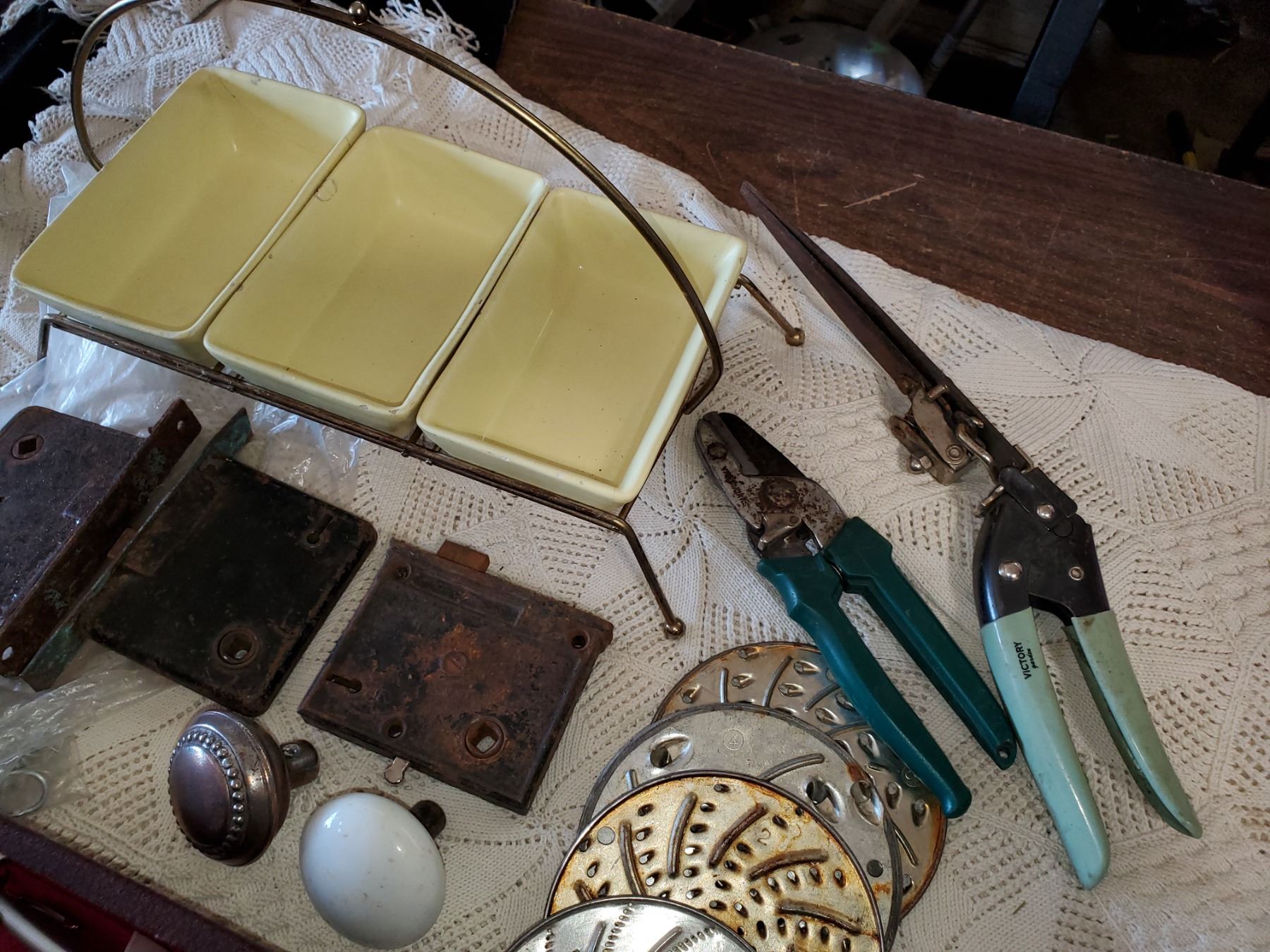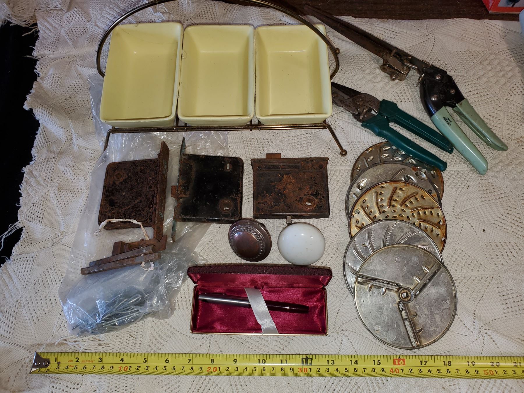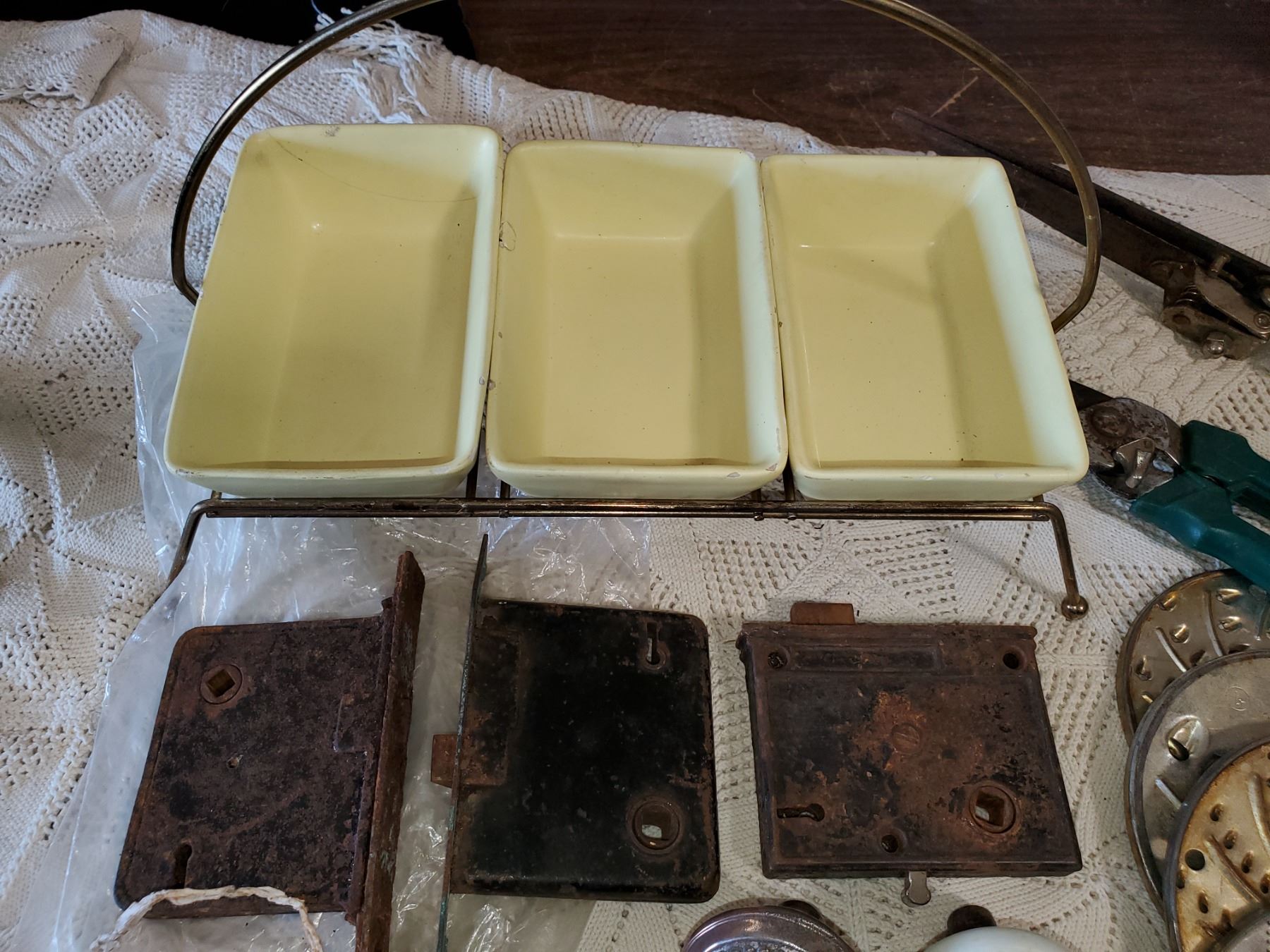 MISC LOT - GLASS DOOR KNOB, HARDWARE, SERVING TRAY, ETC