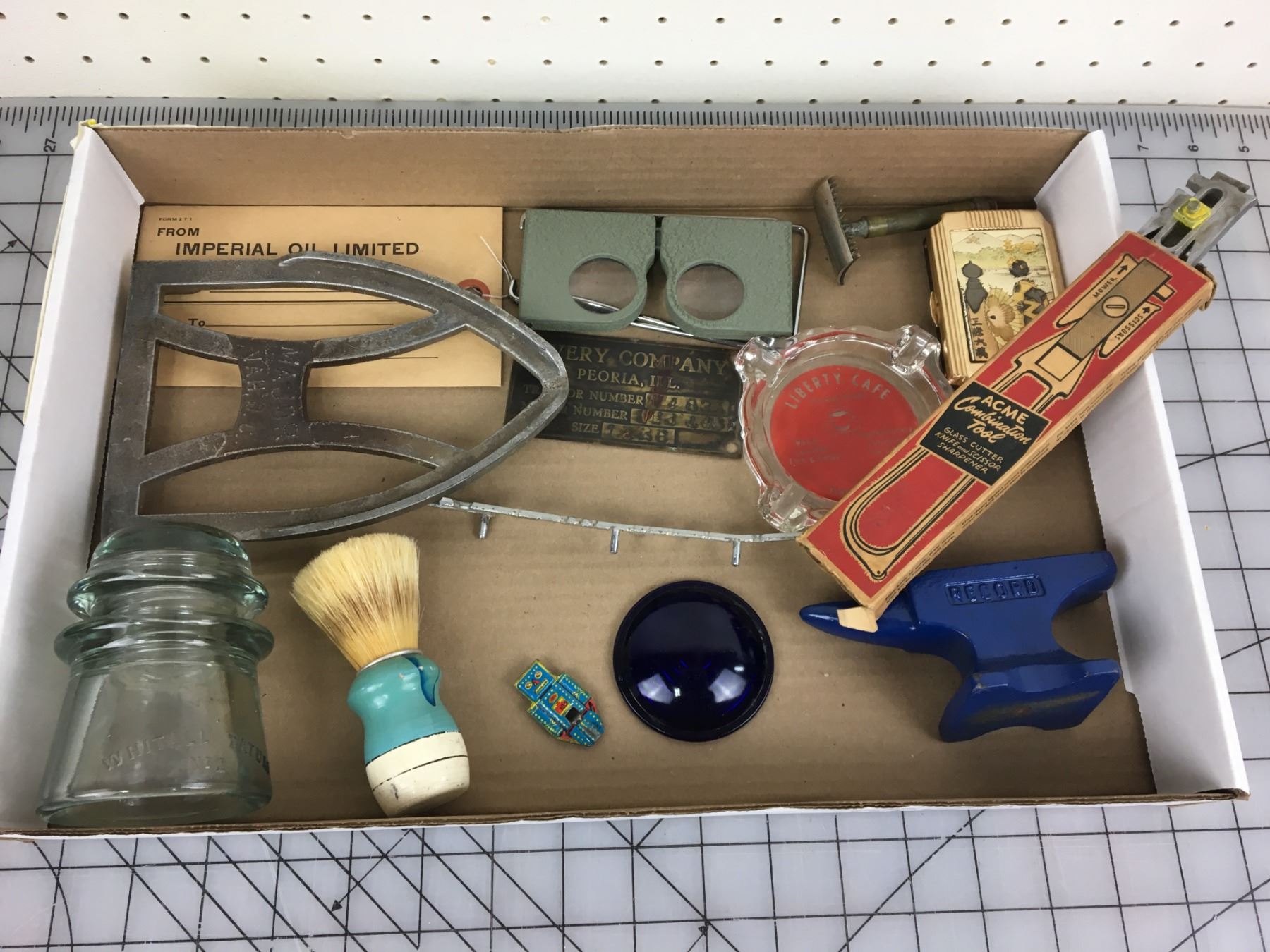 MISC LOT (MINI ANVIL, INSULATOR, TIN WHISTLE, ETC...)
