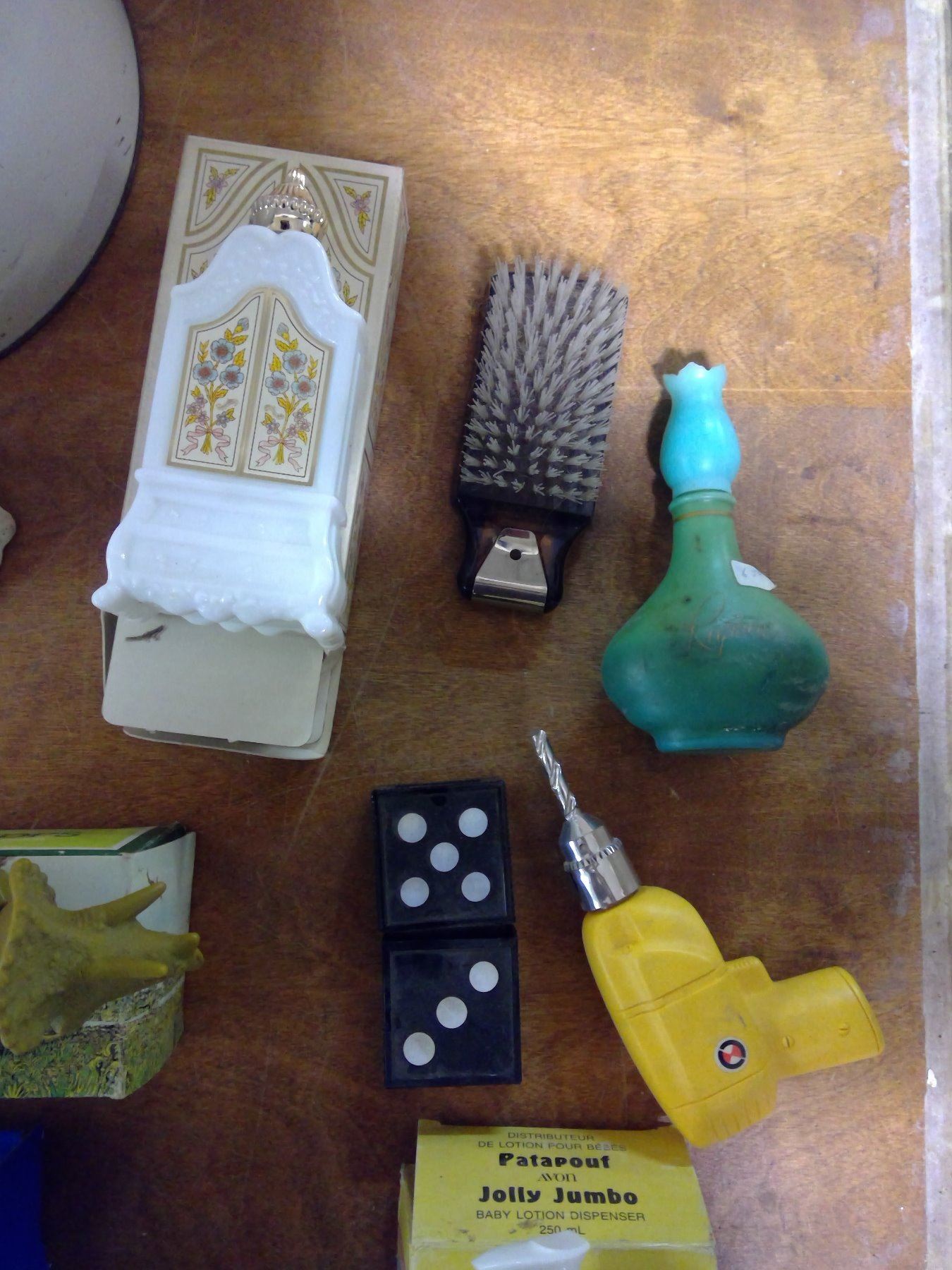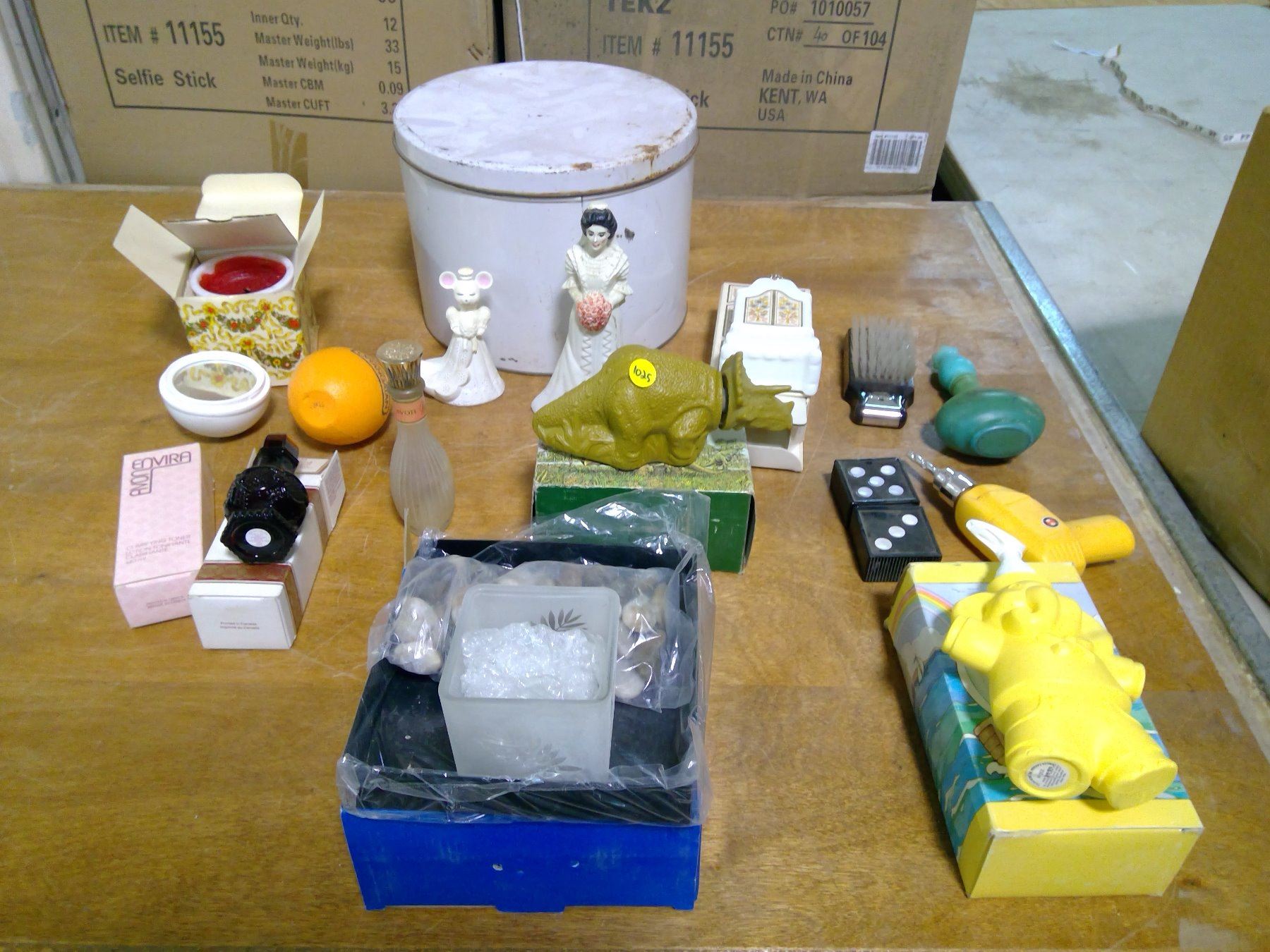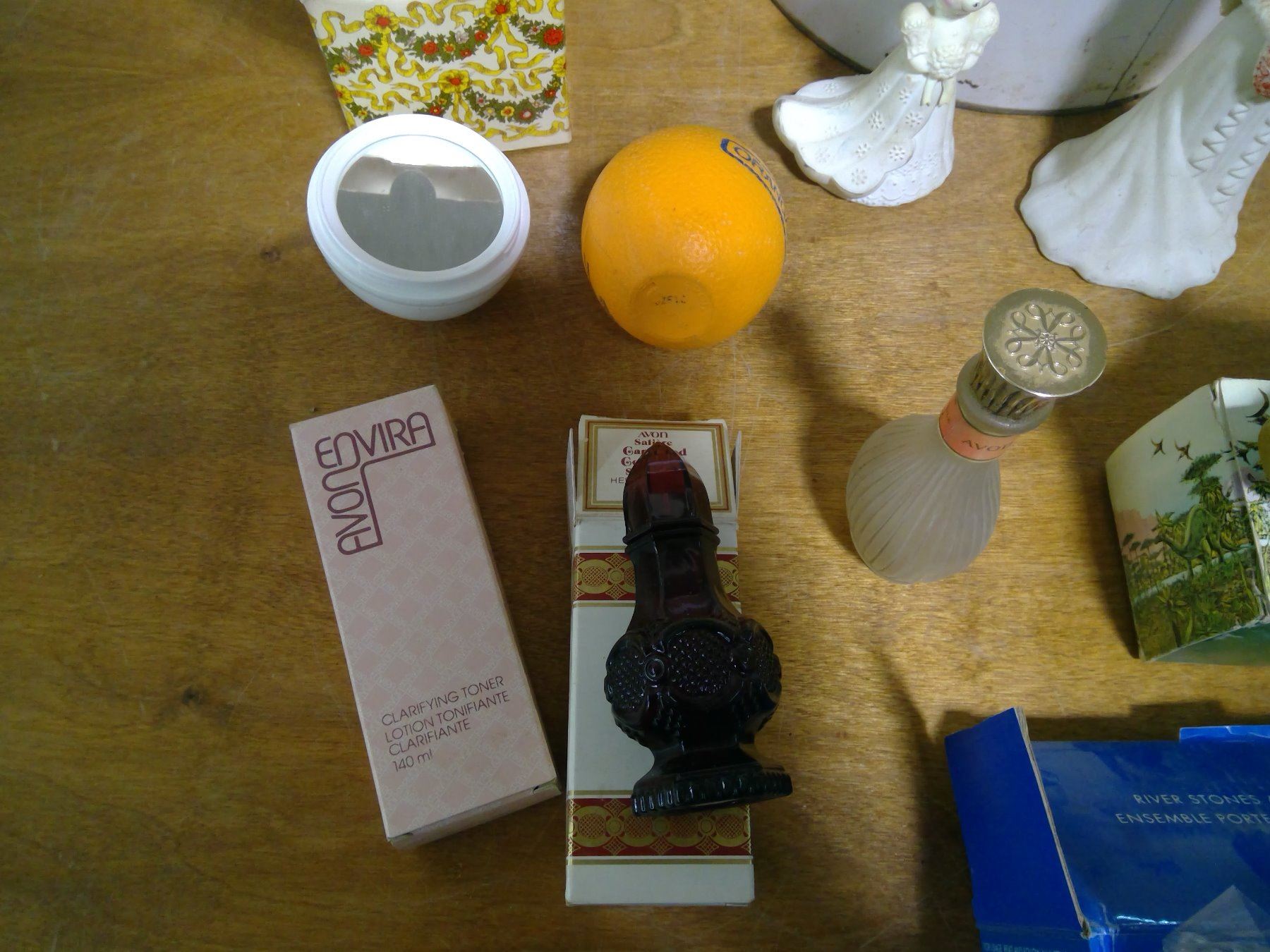MISC. PERFUMES + SCENTED CANDLE + TIN CONTAINER (BOXES ALL FULL)