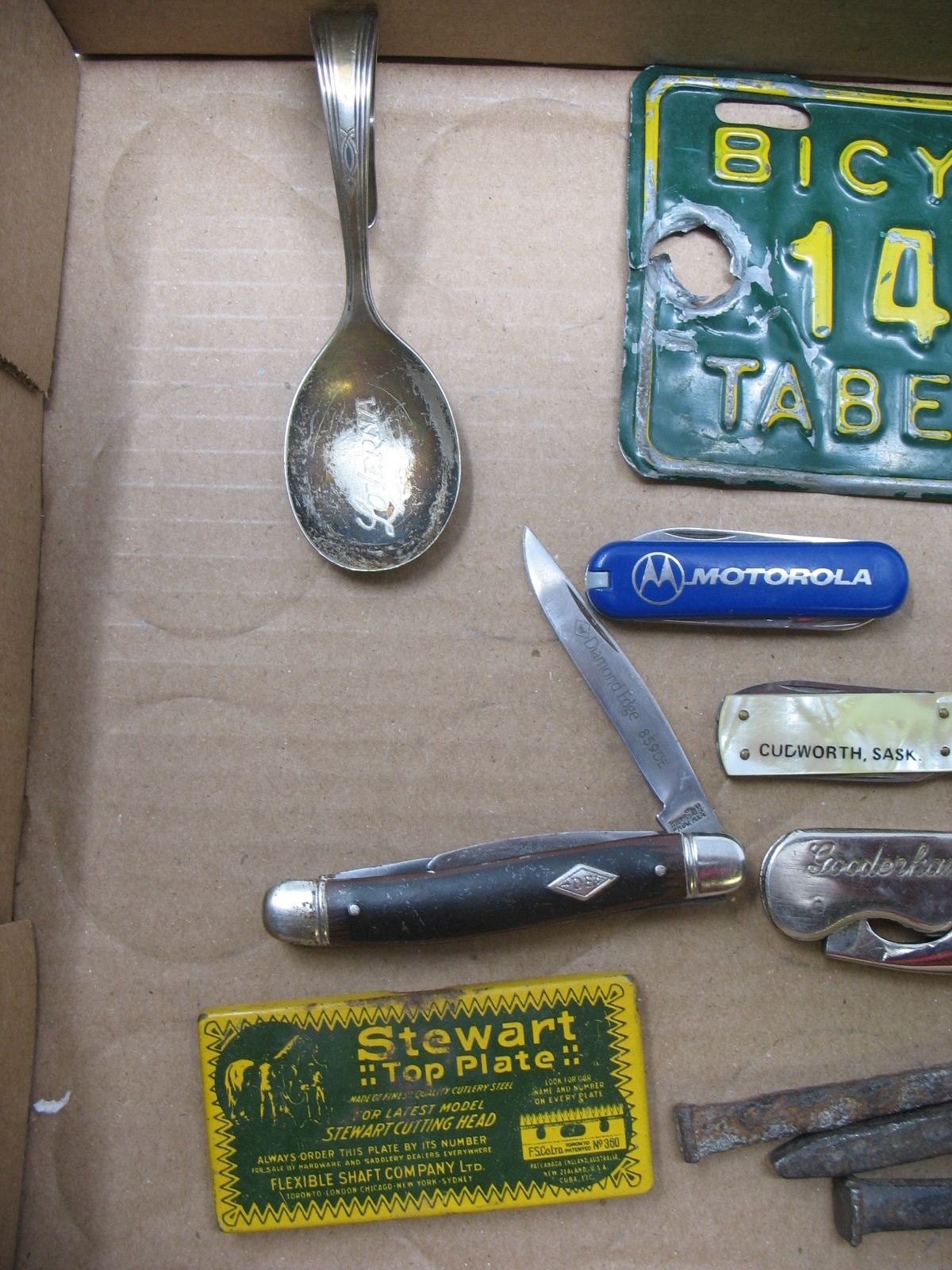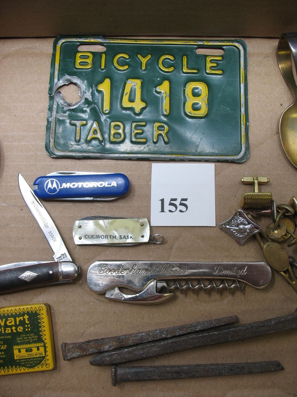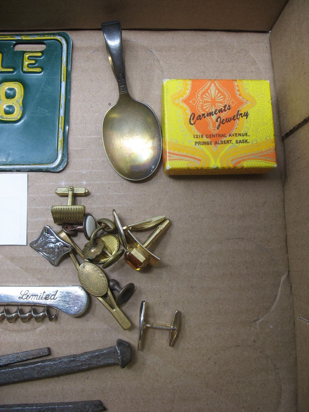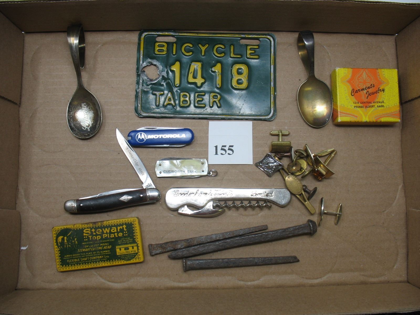 MIXED LOT - BICYCLE PLATE - POCKET KNIFES - BABY SPOONS - CUFF LINKS - MISC. ITEMS