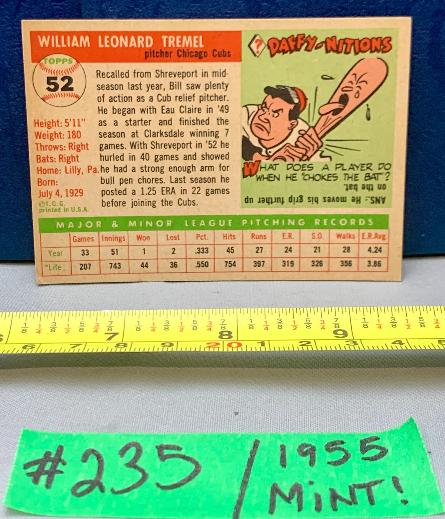 MLB Baseball Card - 1955 Vintage Bill Tremel #52 Mint!