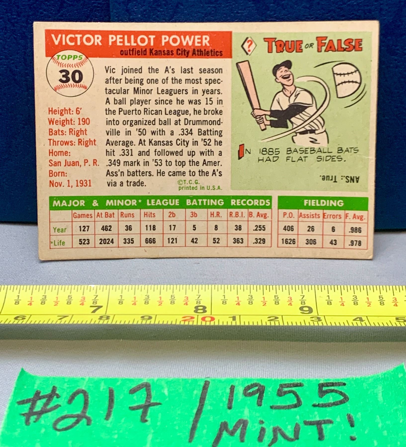 MLB Baseball Card - 1955 Vintage Mint Vic Power #30