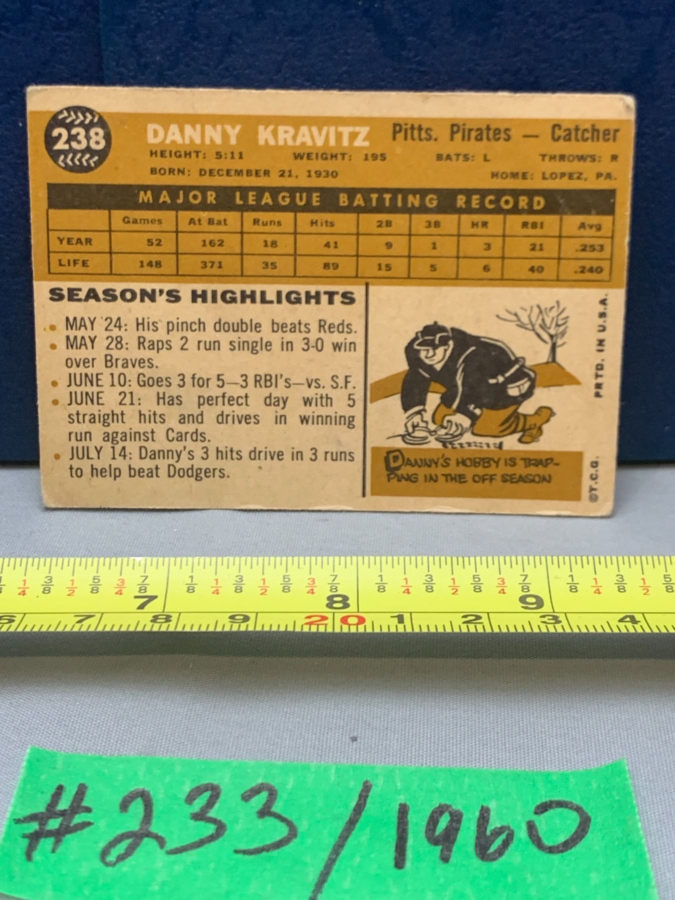 MLB Baseball Card - 1960 Vintage Danny Kravitz #238 Nice!