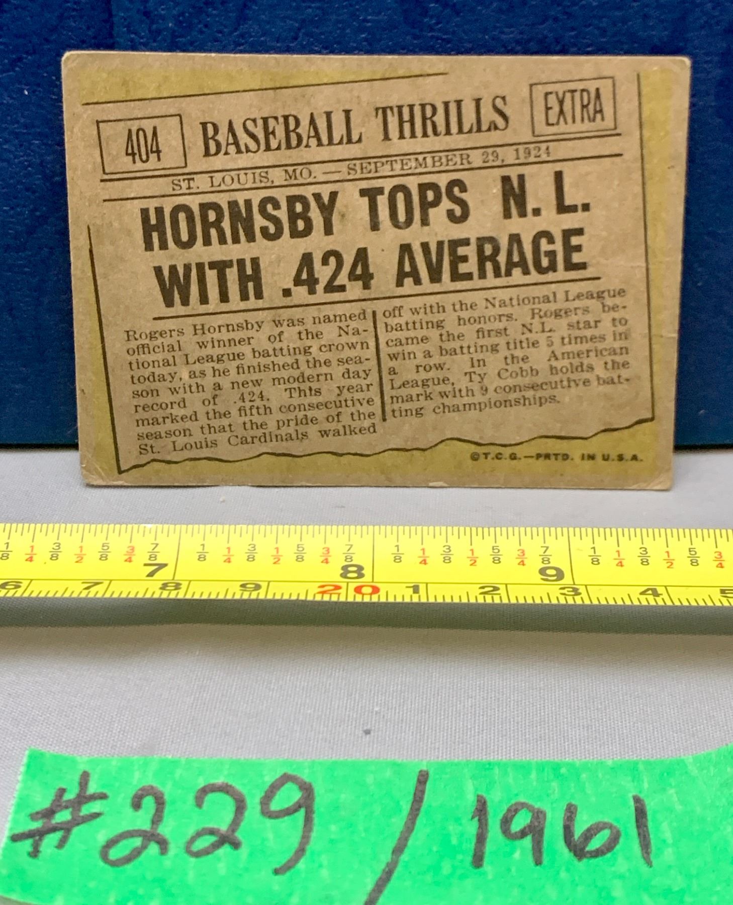 MLB Baseball Card - 1961 Vintage Hornsby N.L. .424 Batting Average! Rare Card!