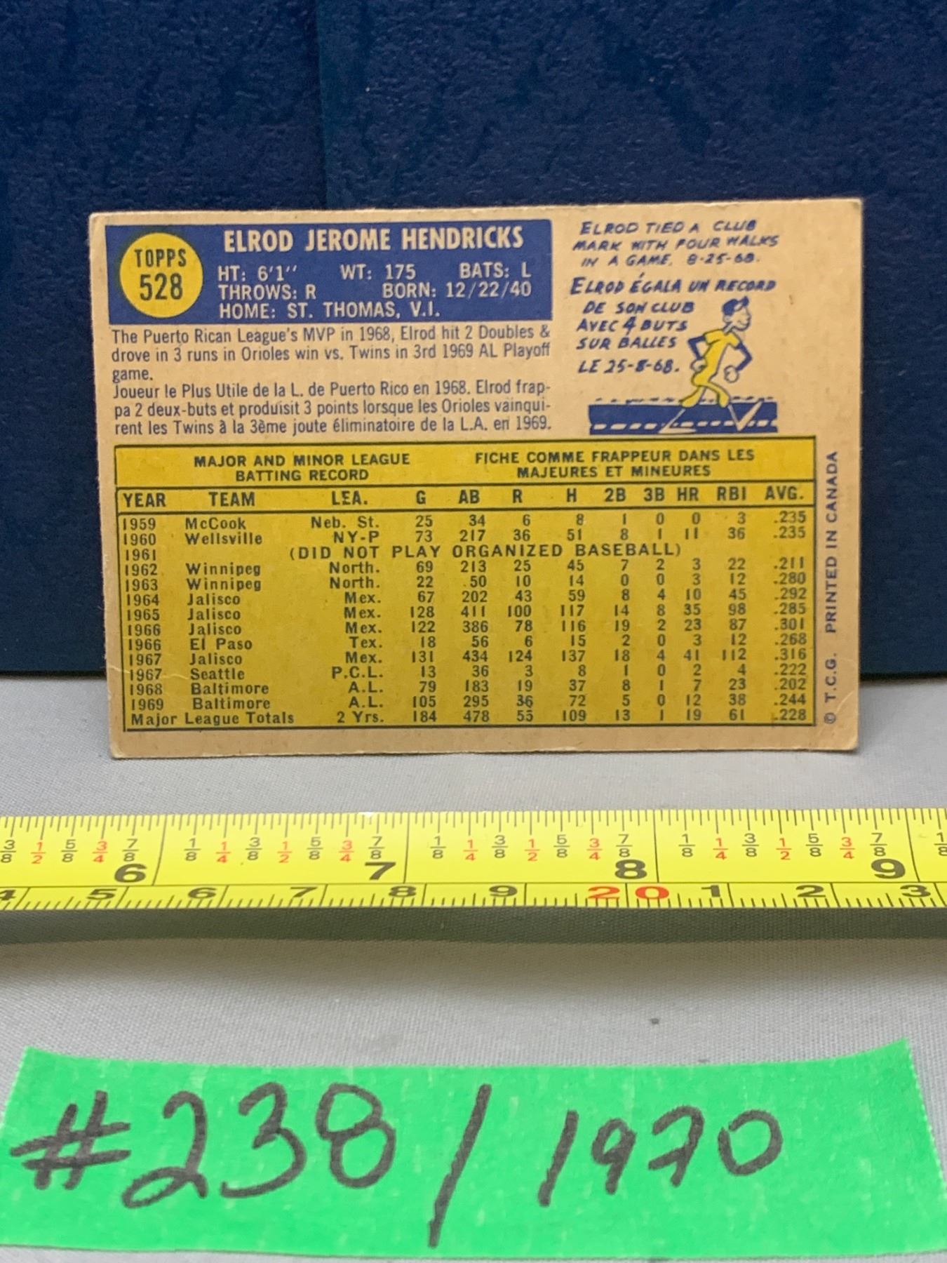 MLB Baseball Card - 1970 Vintage Elrod Dendricks #528