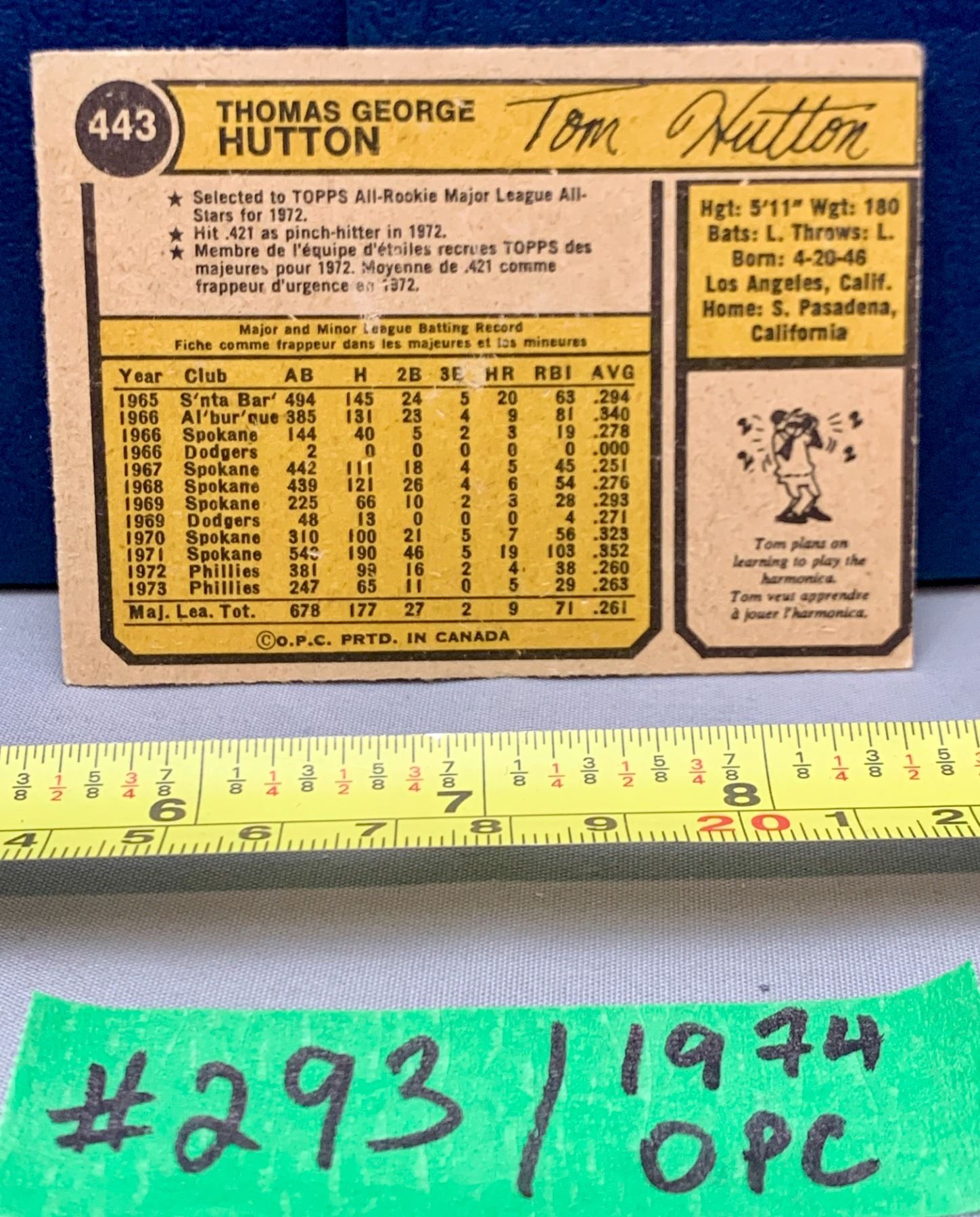 MLB Baseball Card - 1974 OPC Vintage Tom Hutton #443