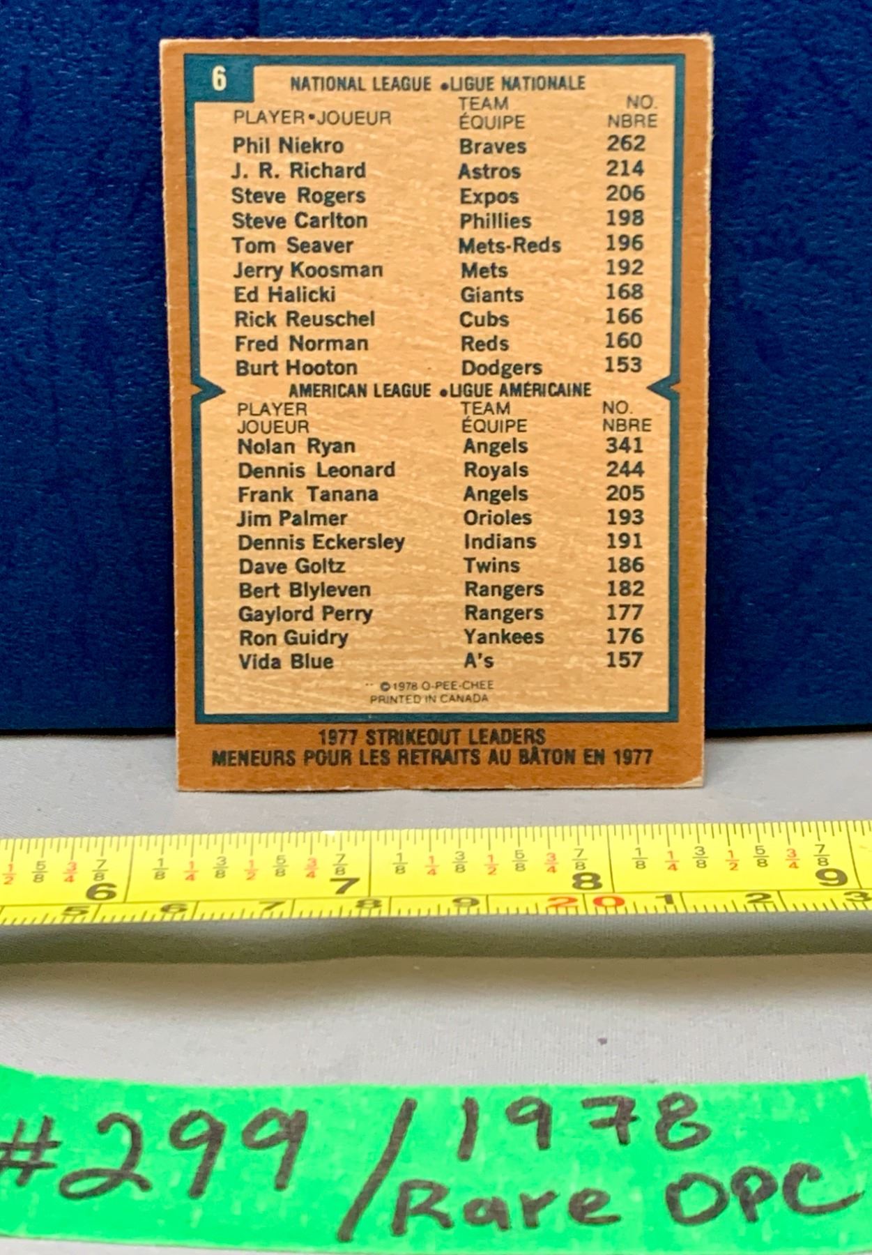 MLB Baseball Card - 1978 OPC Vintage Strikeout Leaders Phil Niekro & Nolan Ryan #6 RARE!