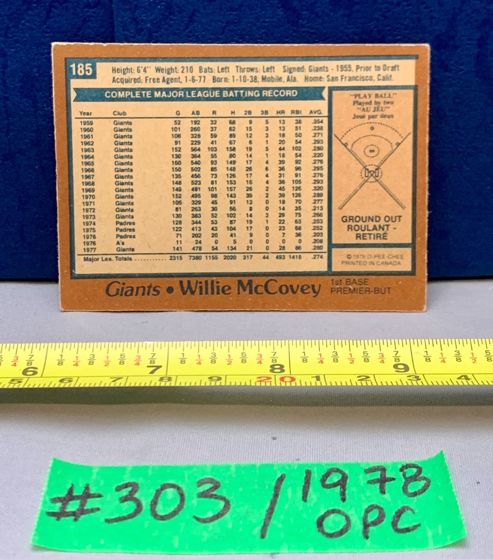 MLB Baseball Card - 1978 OPC Vintage Willie McCovey #185