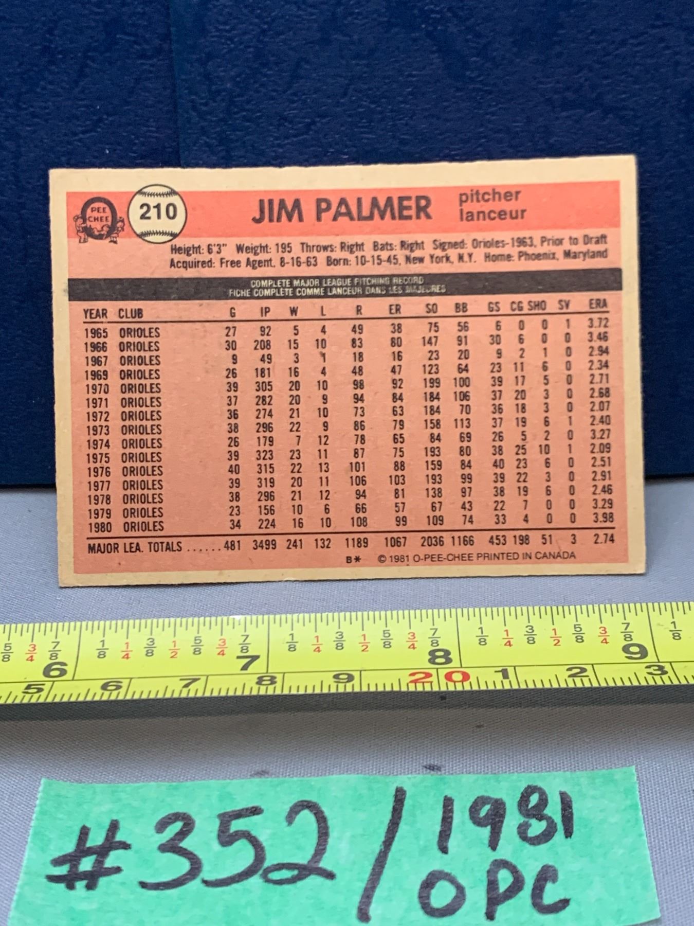MLB Baseball Card - 1981 OPC Vintage Jim Palmer