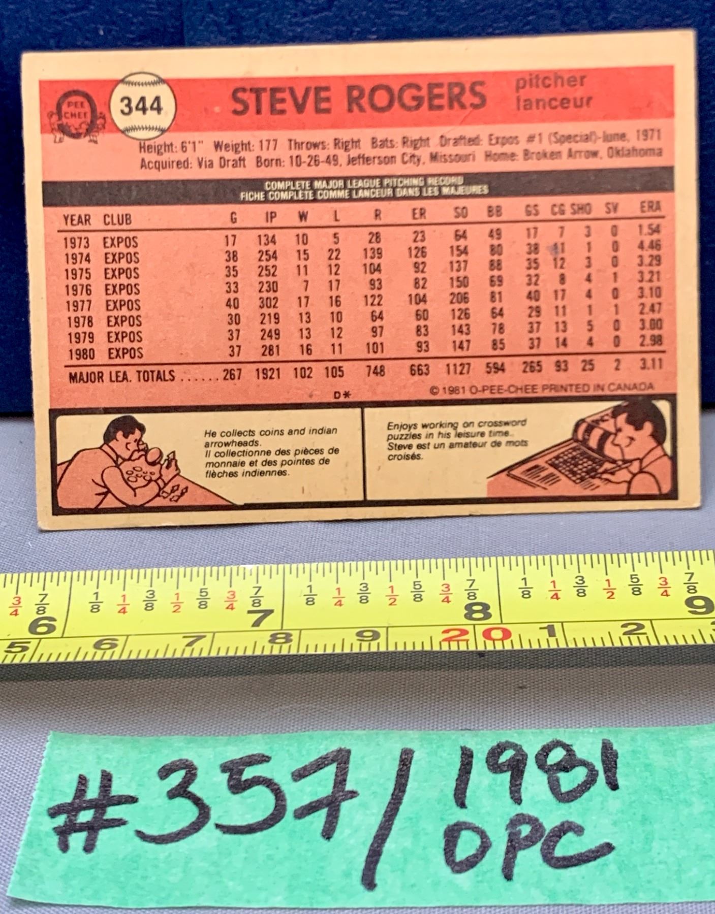 MLB Baseball Card - 1981 OPC Vintage Steve Rogers Expos