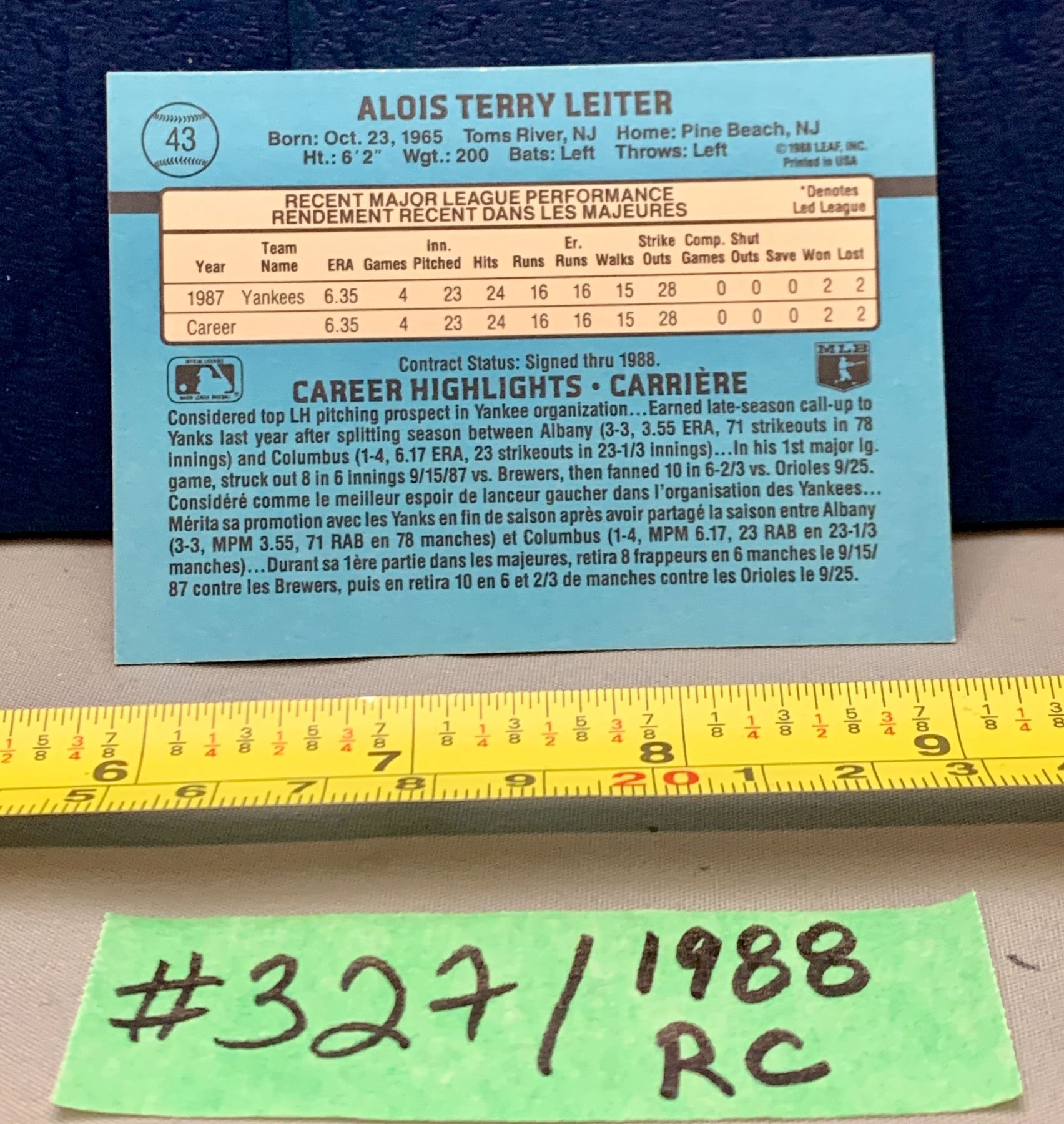 MLB Baseball Card - 1988 Leaf Vintage Rated Rookie Al Leiter #43