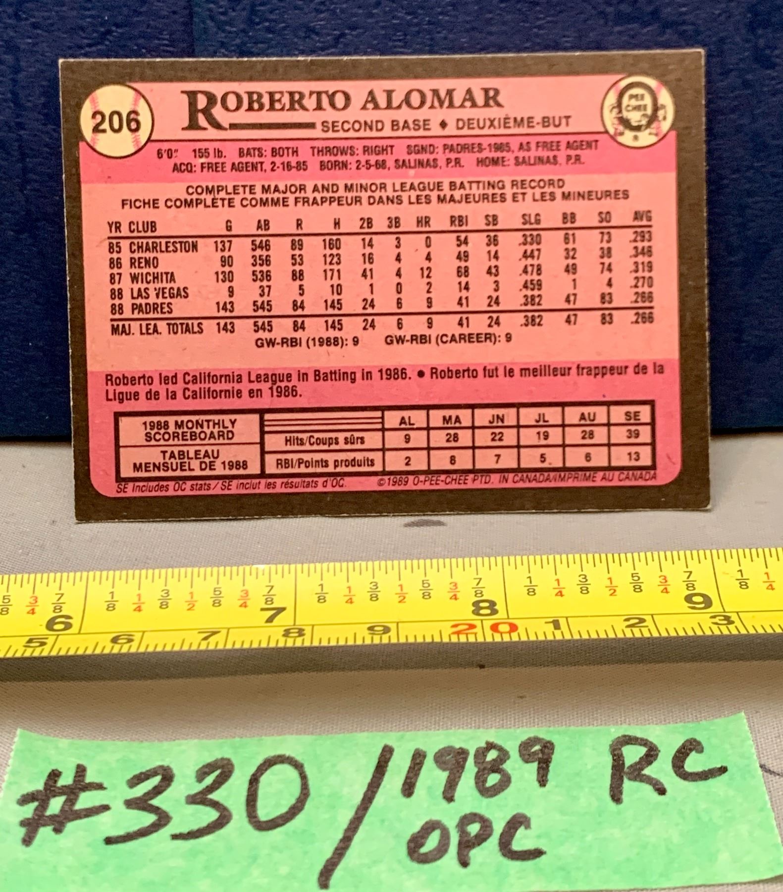 MLB Baseball Card - 1989 OPC Vintage Roberto Alomar Rookie Card #206