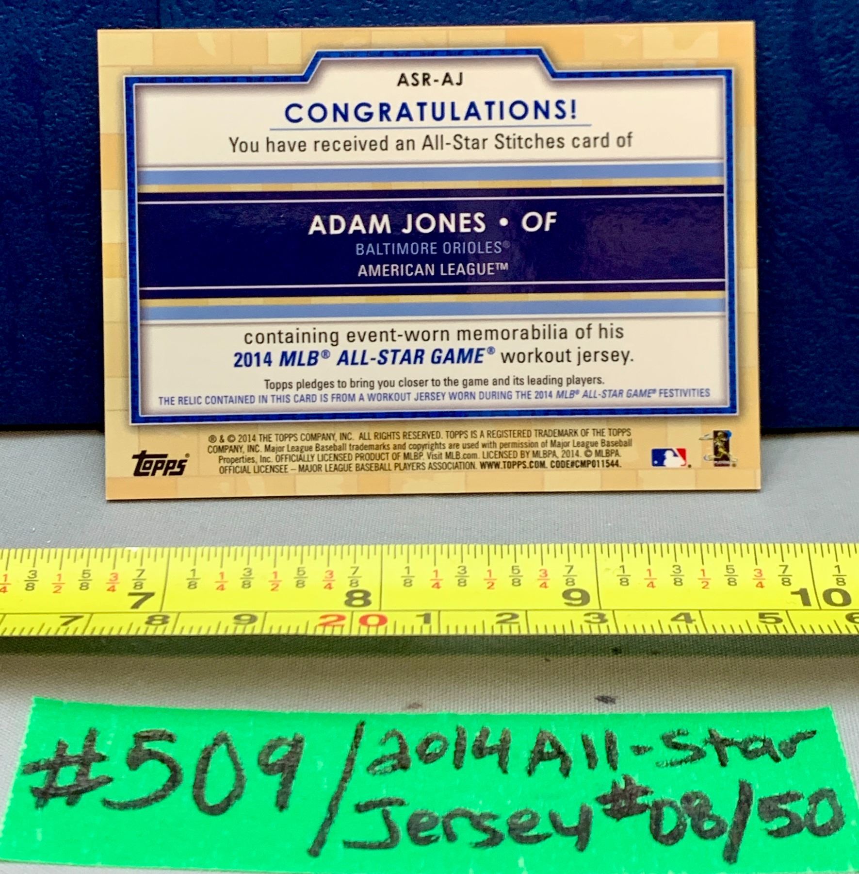 MLB Baseball Card - 2014 Adam Jones All Star Stitches Event Worn #08/50 Jersey card RARE!