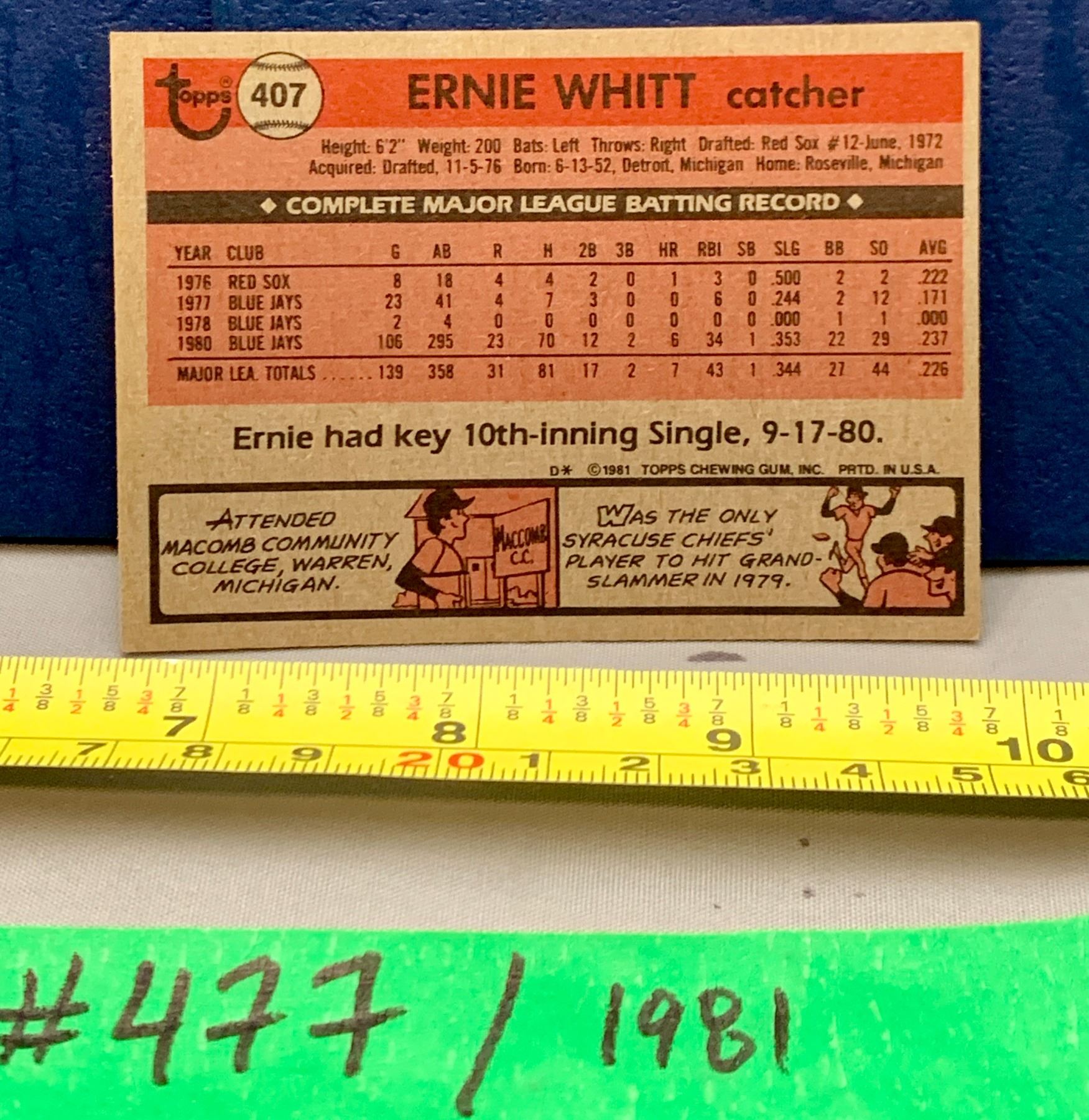 MLB Baseball Card - Toronto Blue Jays 1981 Ernie Whitt