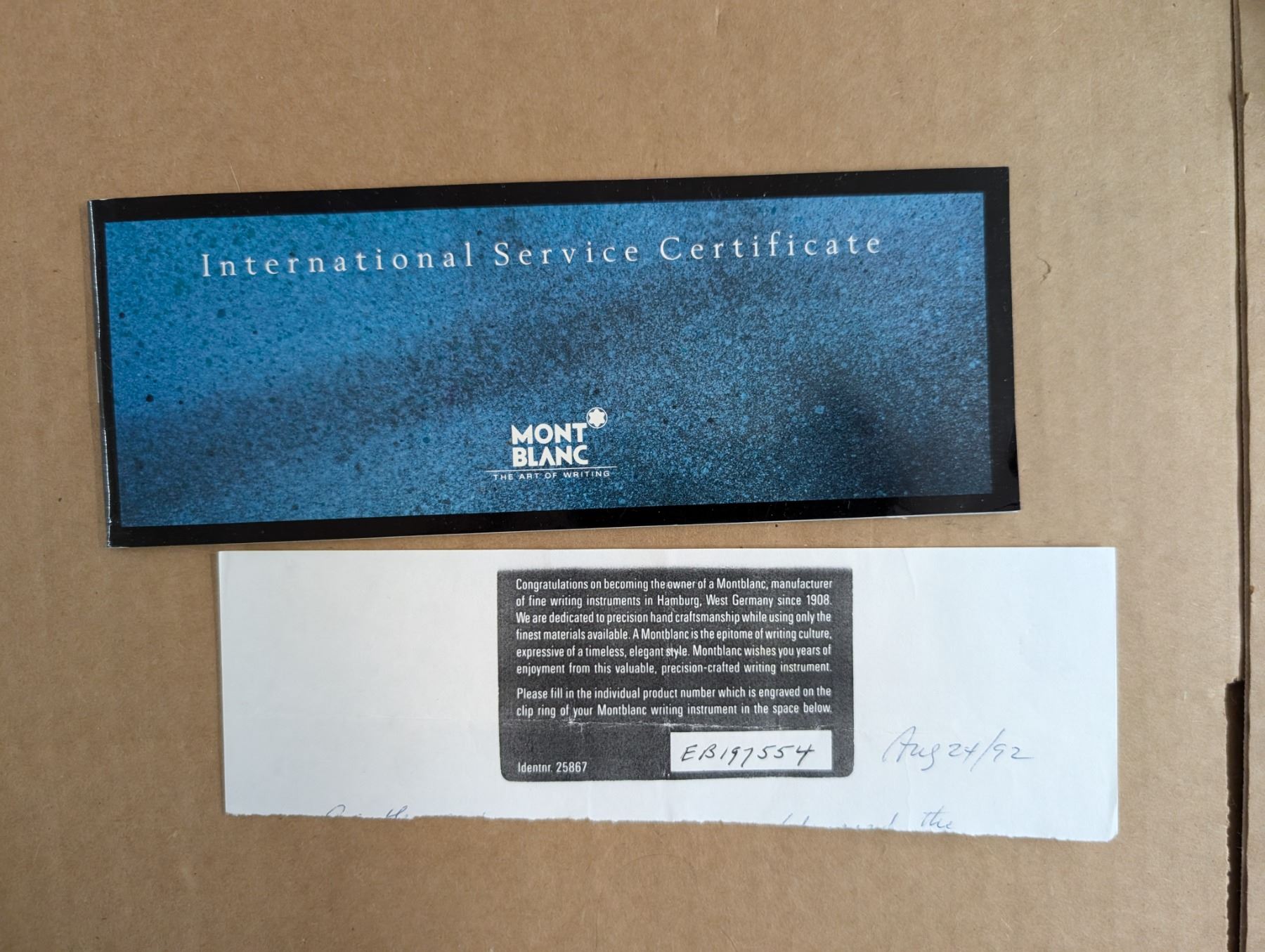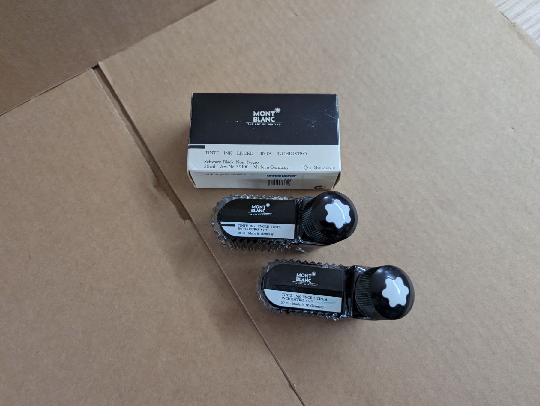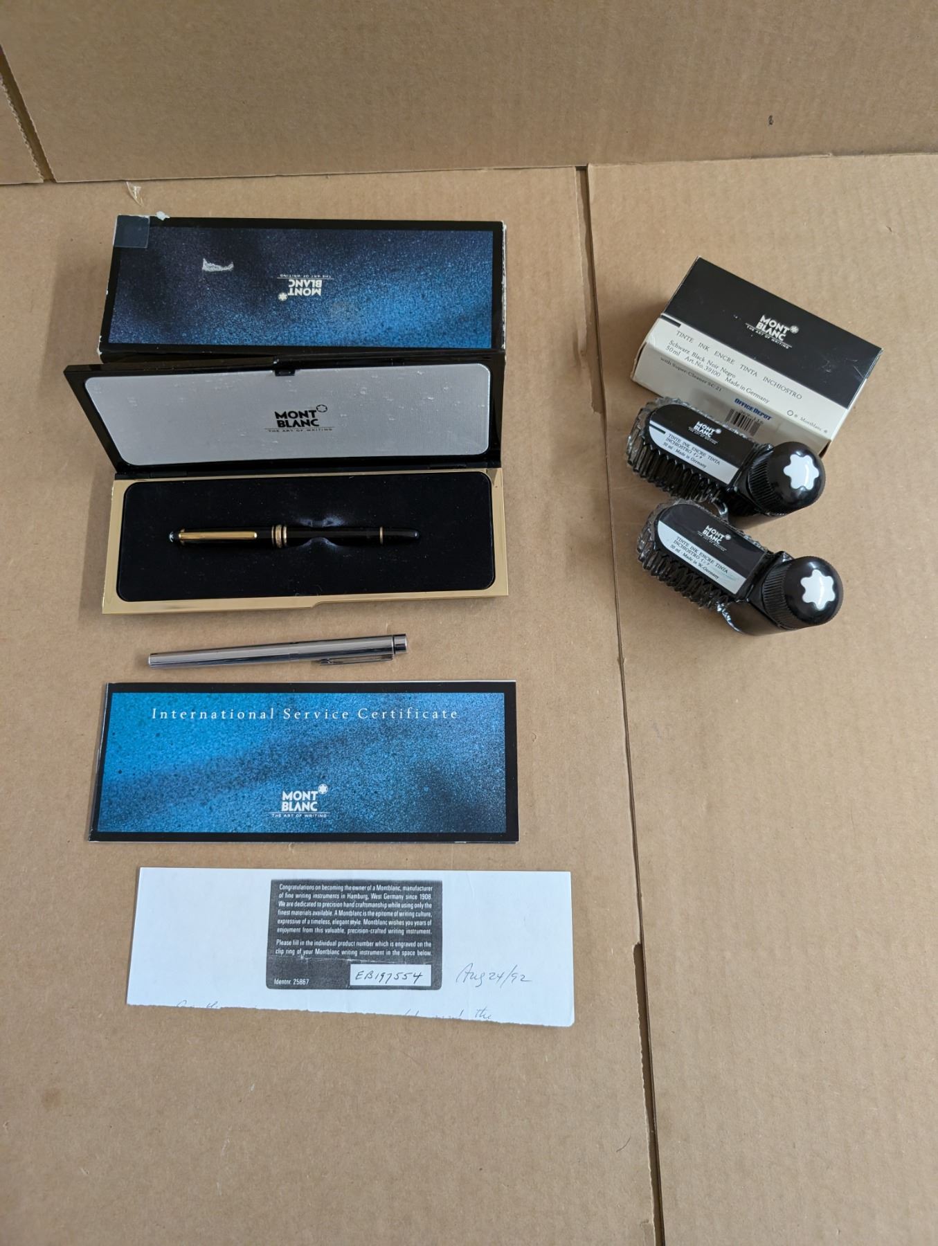 MONT BLANC Fountain Pen with International Service Certificate, made in Hamburg, Germany. Plus SHEAFER silver coloured Fountain Pen, made in USA. Plus one Mont Blanc bottle of black ink, sealed, never opened, in package, plus 1 bottle hardly used ink; made in Germany.