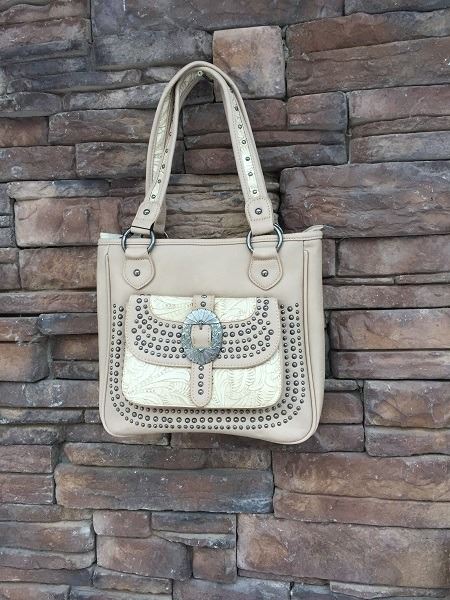 MONTANA WEST CREAM TOOLED WESTERN HANDBAG /Double straps. Inner and outer compartments. Top zipper closure.