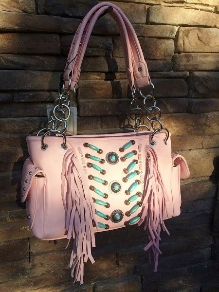 MONTANA WEST WESTERN HANDBAG WITH FRINGE AND TURQUOISE BEAD ACCENTS/Montana West western handbag. Double chain shoulder straps. Inner and outer compartments. Tribal turquoise bead and fringe accents on front.