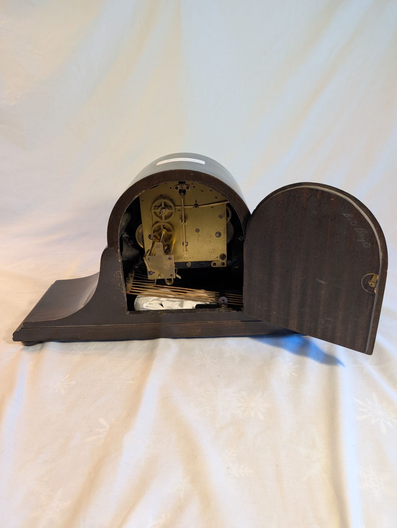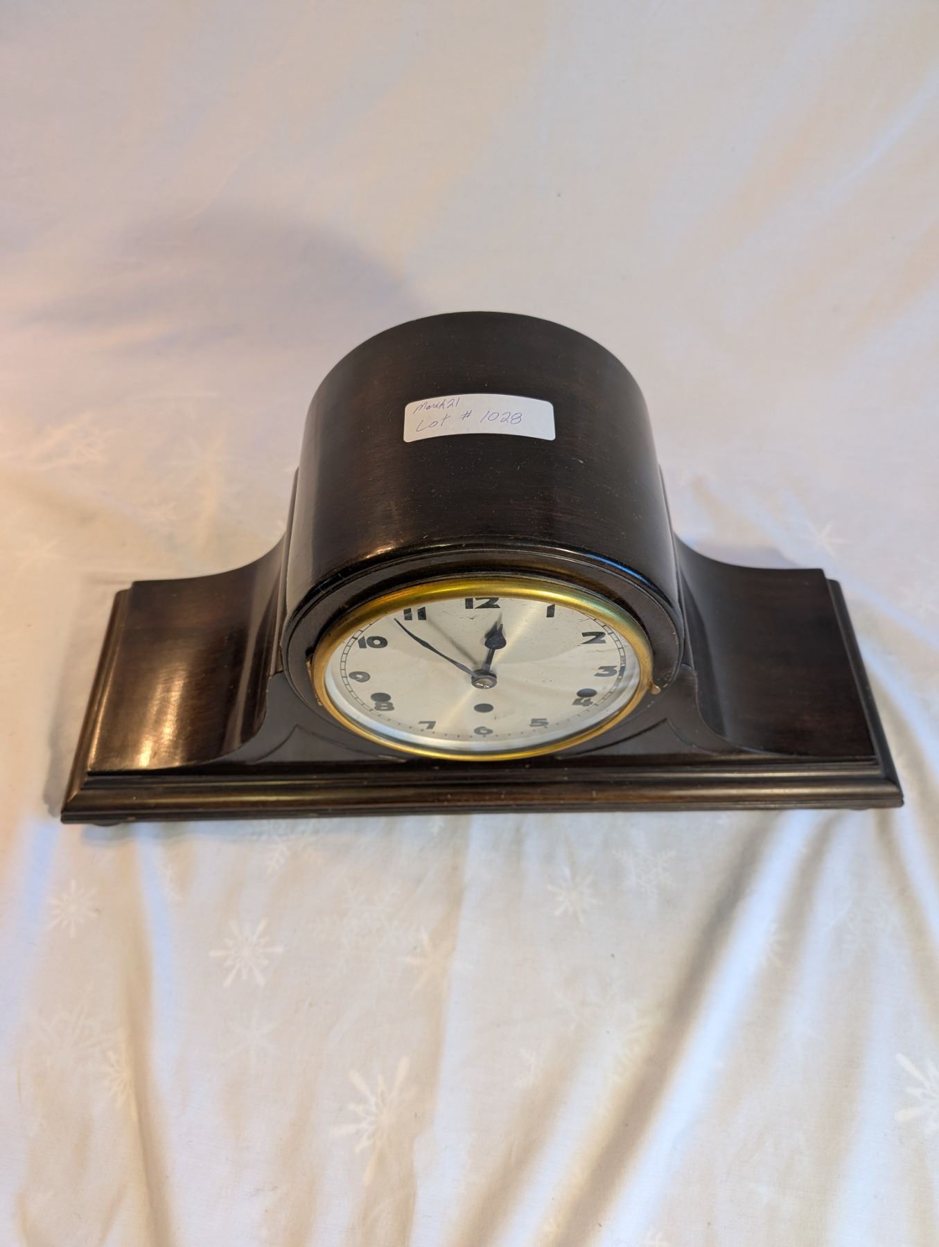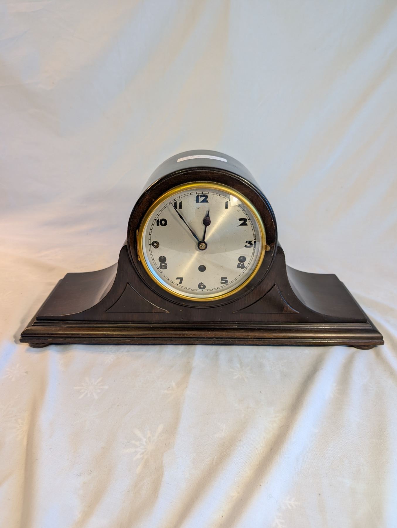 Mahogany Napoleon Hat Mantle Clock. Curved Glass Door . Circa 1930. (Clock Works, Chime Doesn’t)
