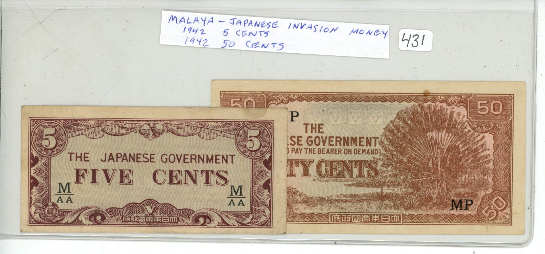 Malaya. Japanese Invasion Money. Lot of 2 notes, 1942 5 Cents & 1942 50 Cents. VF.