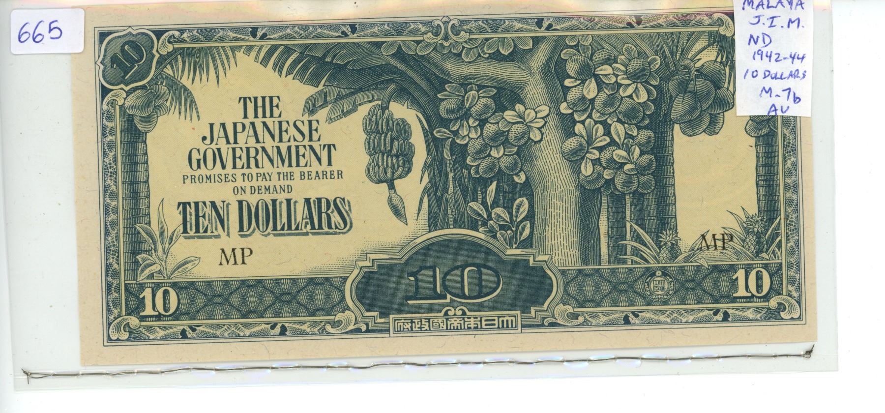 Malaya. Japanese Invasion Money issued during the occupation of Malaya. ND (1942 – 1944) 10 Dollars. AU.