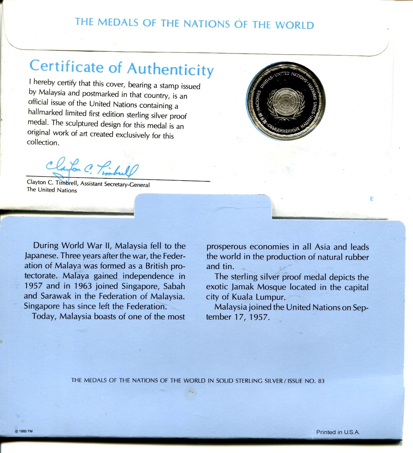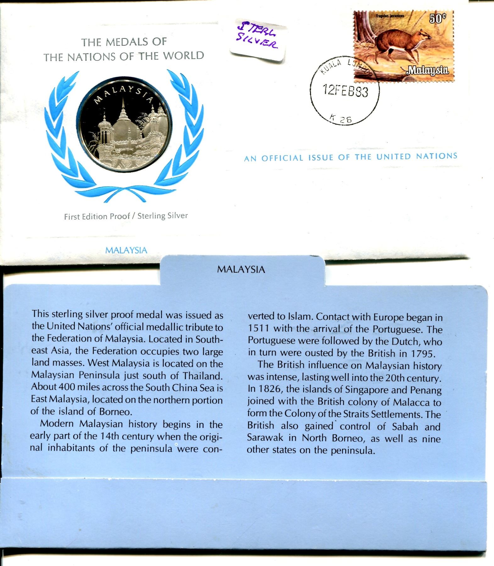 Malaysia - 1983 - United Nations Sterling Silver Coin w/ Mal. Stamp in Presentation Holder
