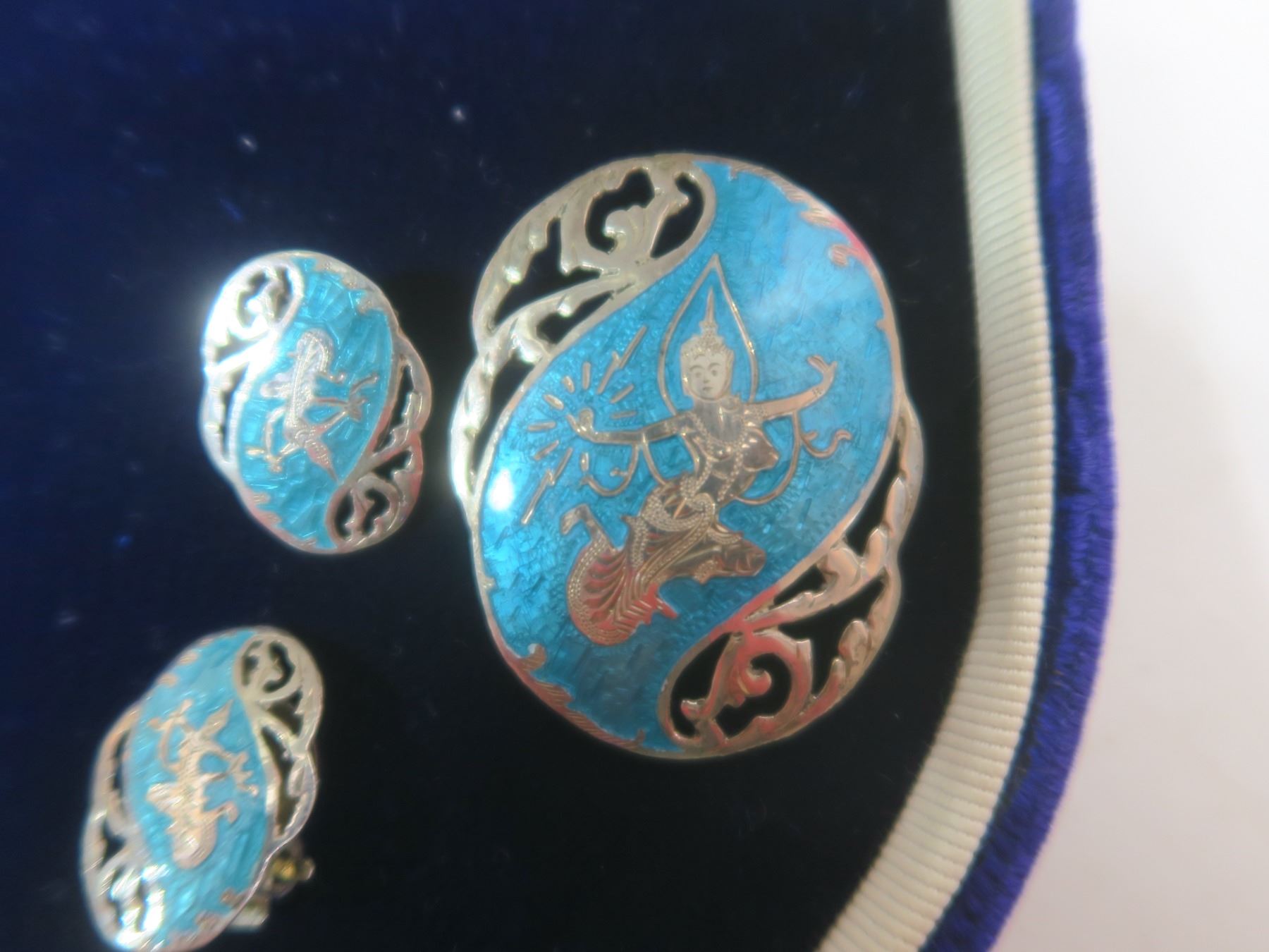Maleka lightning goddess siam sterling silver aqua blue enamel vintage brooch with clip earrings set