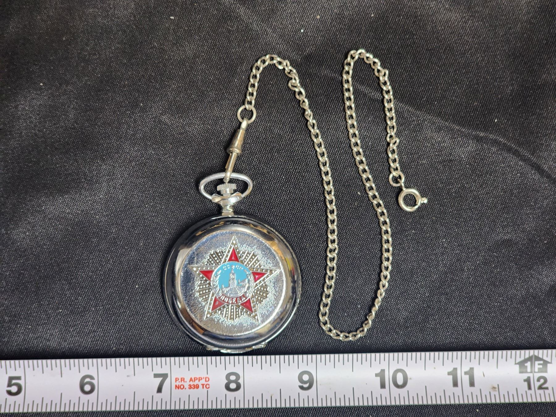 Serial #325125 (also #3602) Made in Russia, size 16. Comes with chain, heavy embossed front and back - has writings including 1941-1945. Tested, excellent working condition, keeps time (See paper in box)