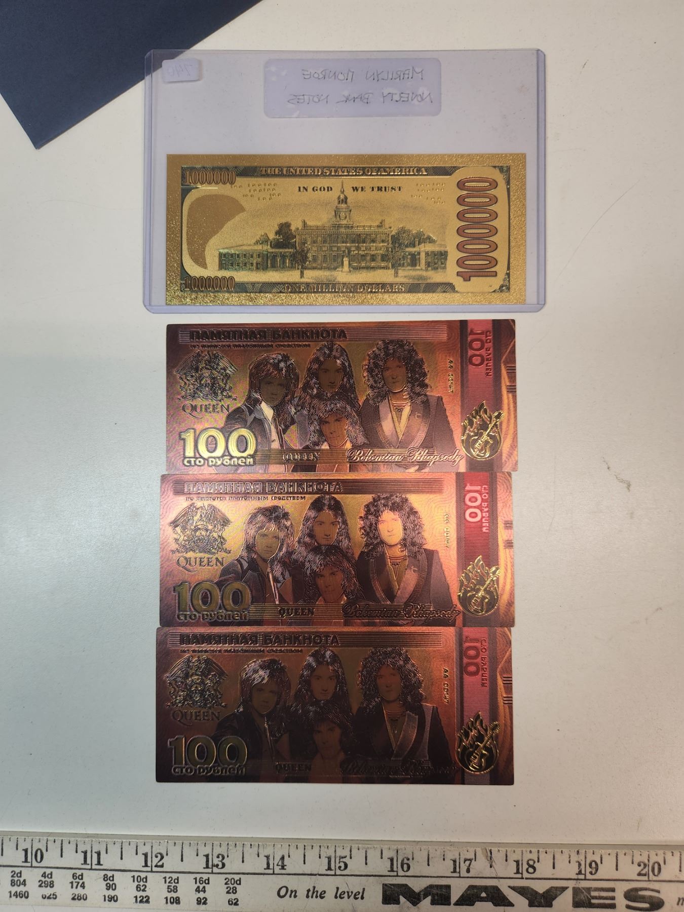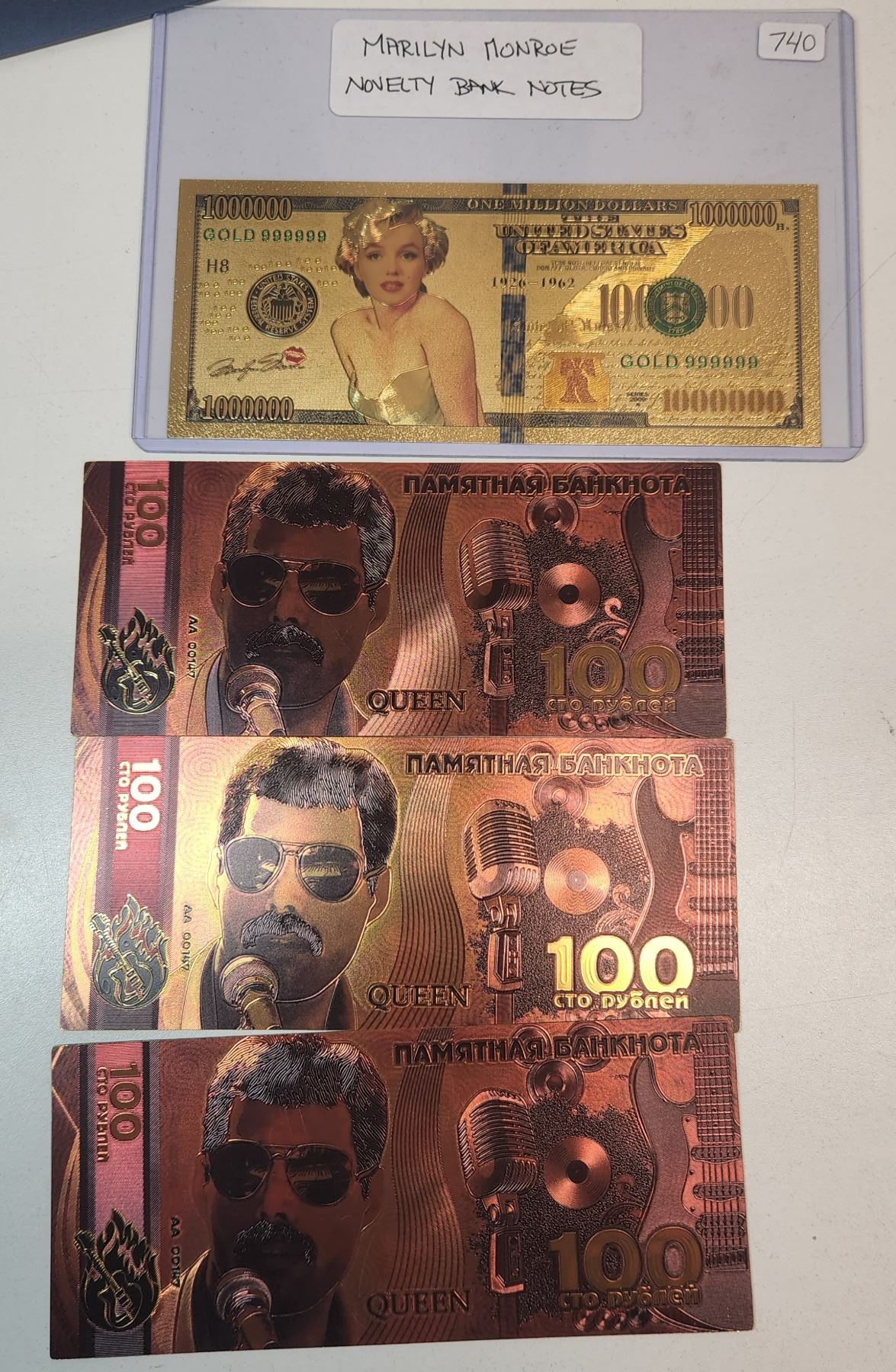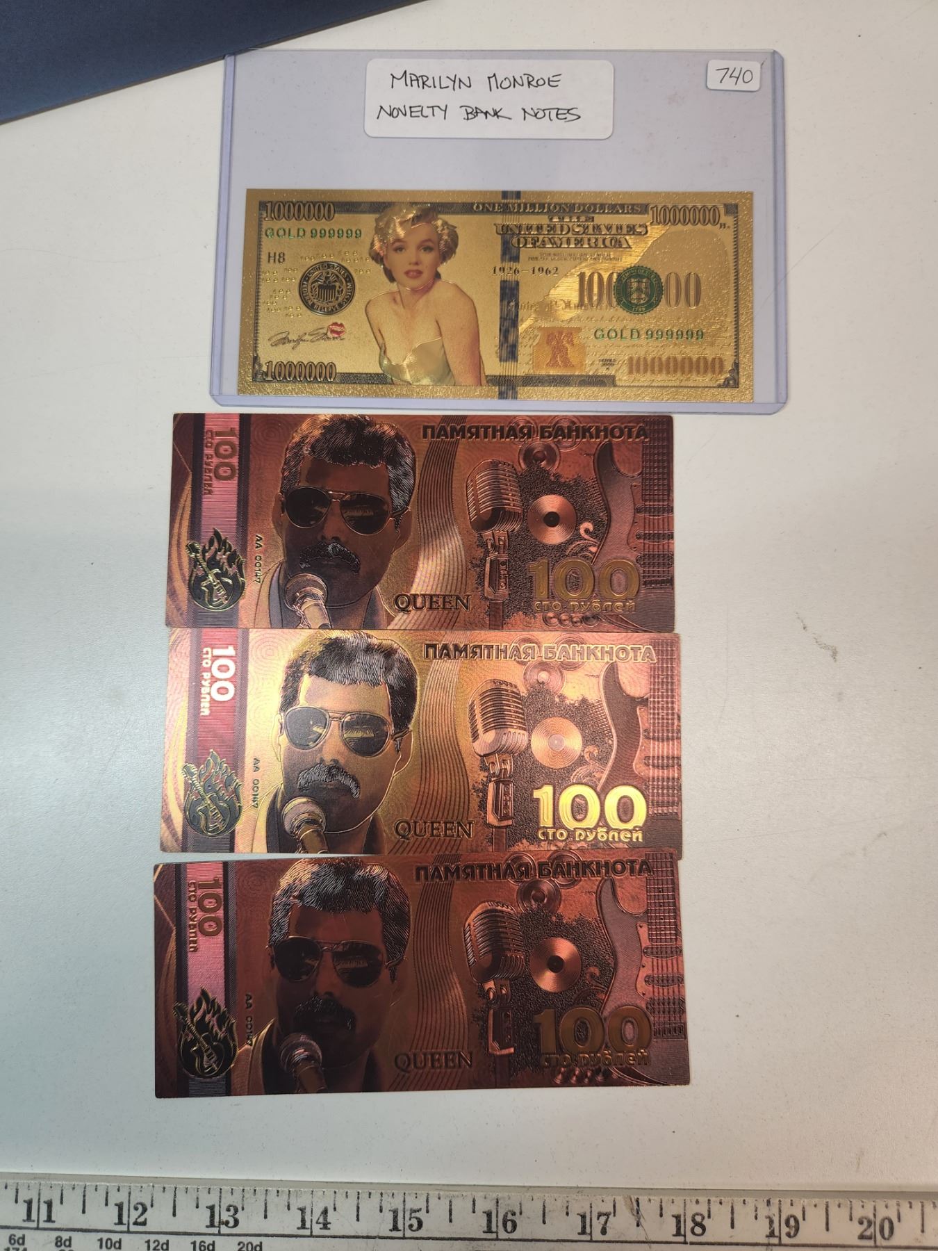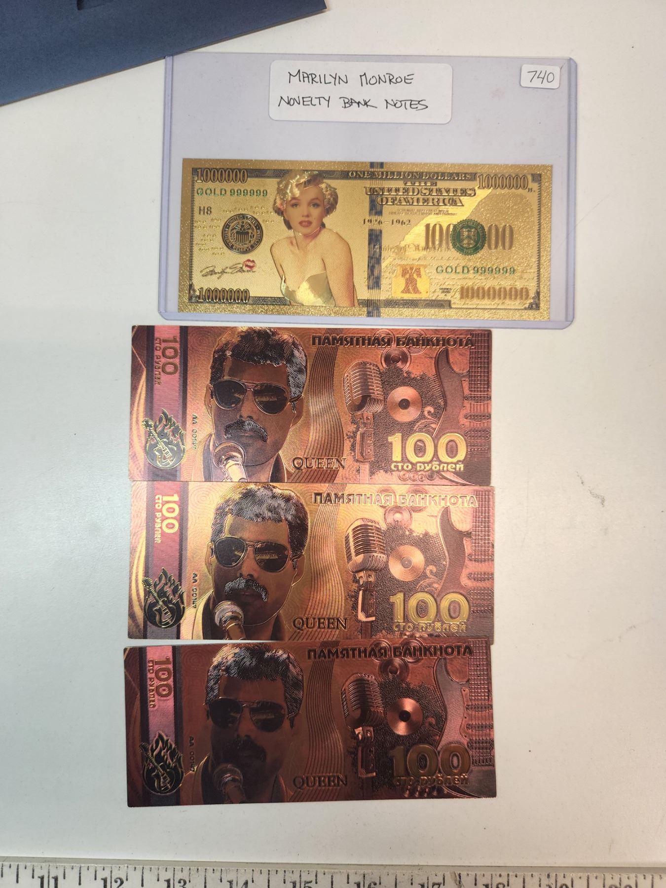 Marilyn Monroe Novelty Bank Note + (3) Queen Novelty Bank Notes