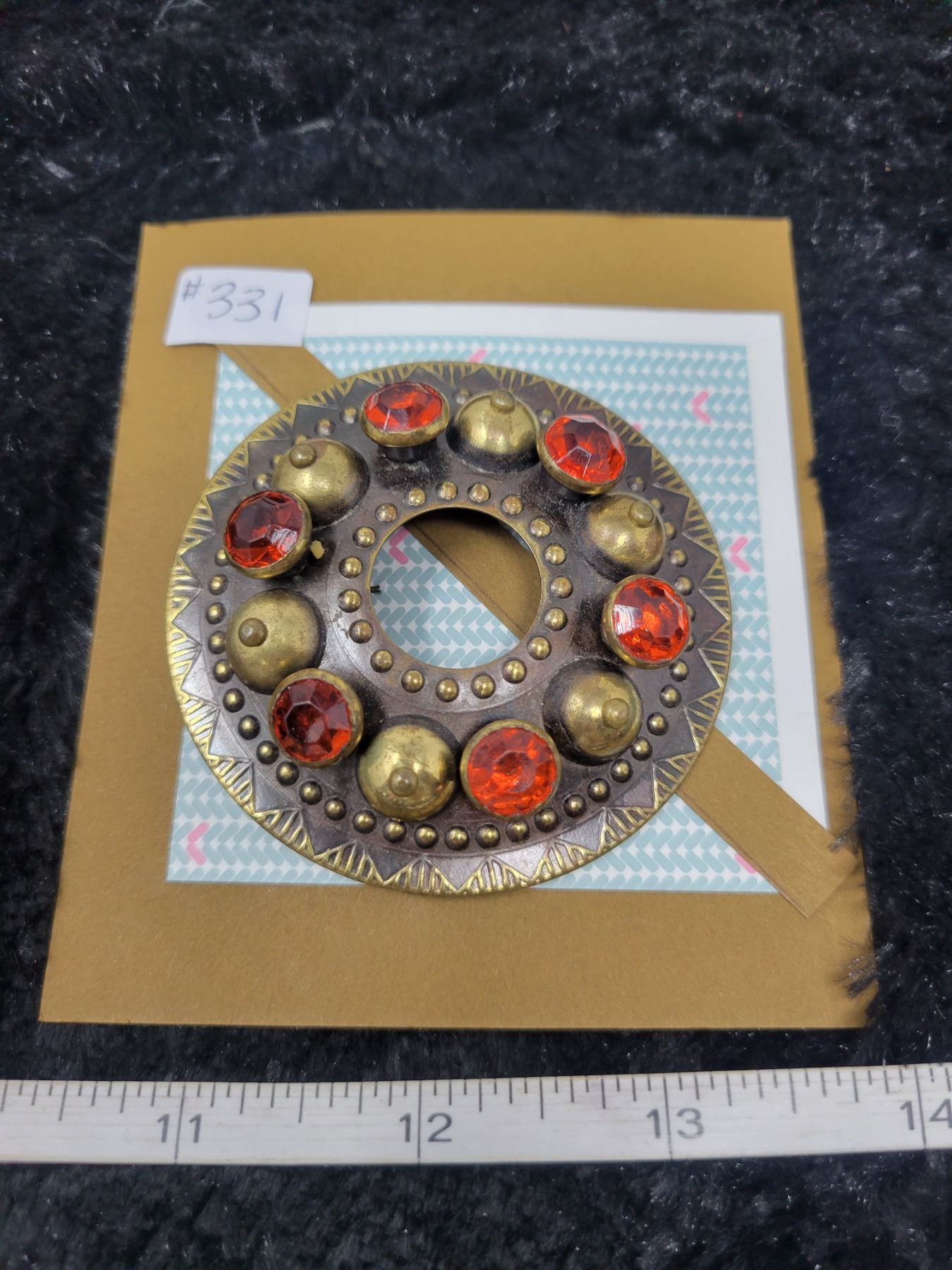 Massive cloak or scarf broach, metal with orange rhinestones, European