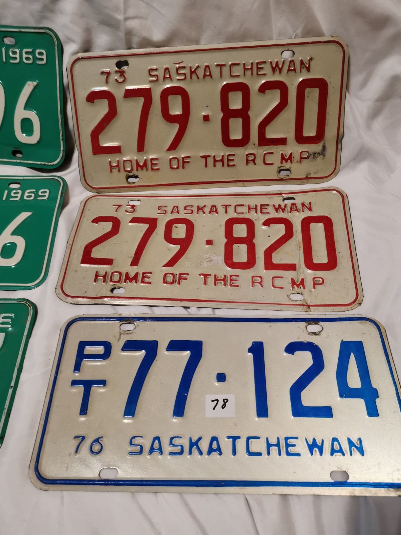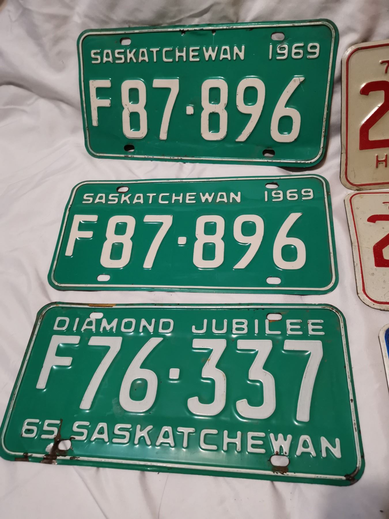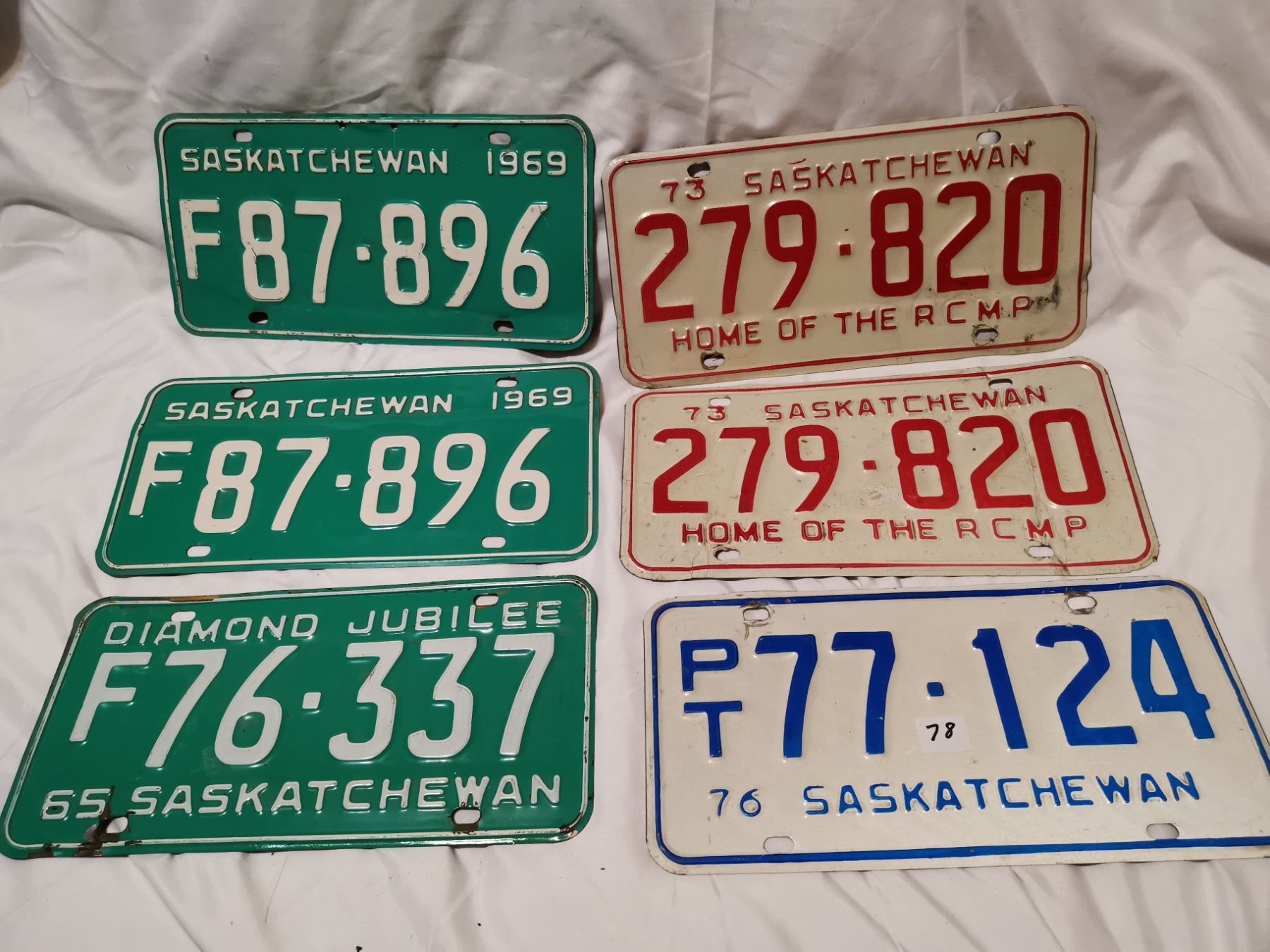 Matching 1969, 1973 Saskatchewan license plates and 1965 & 1976 single plates