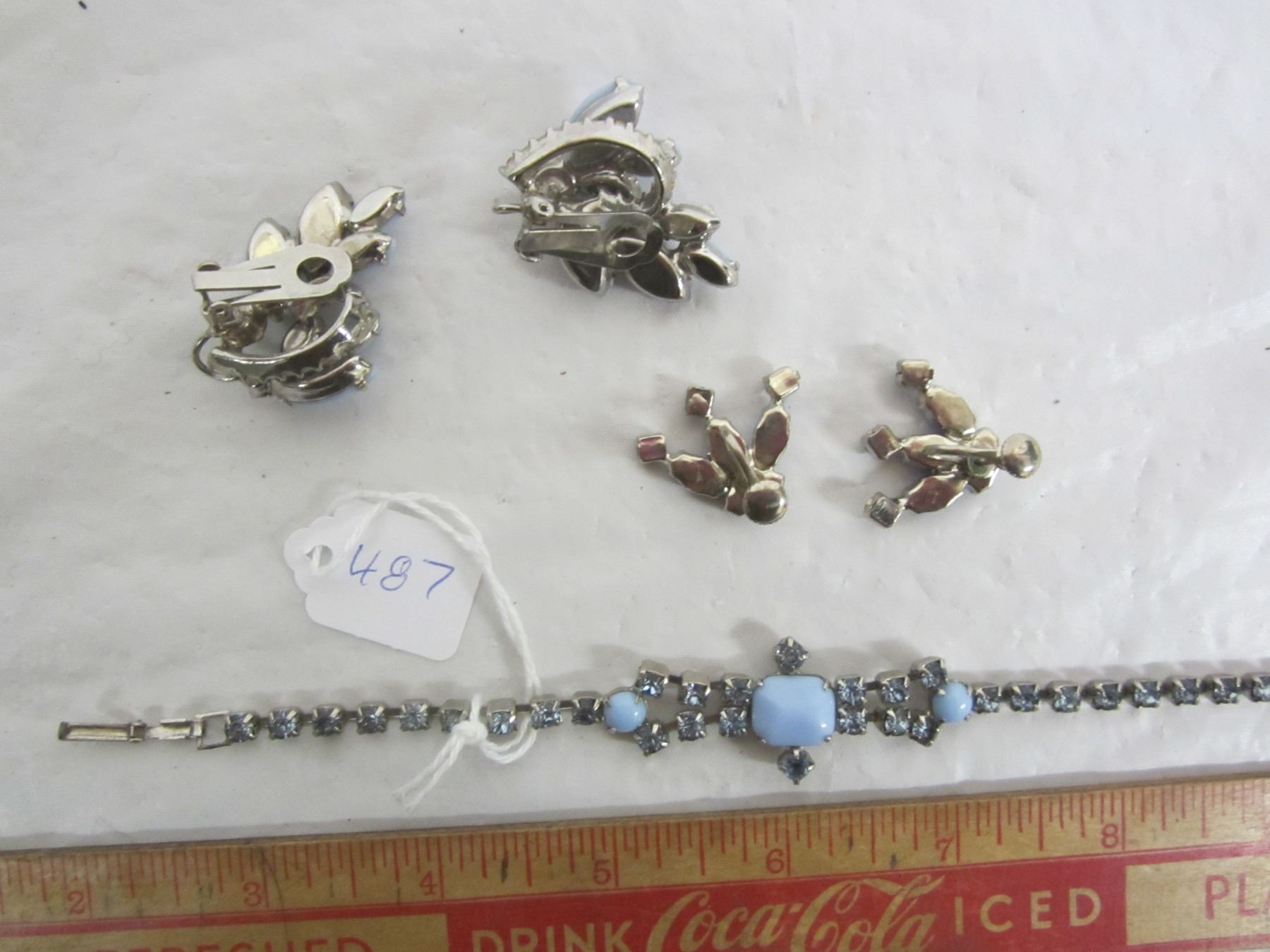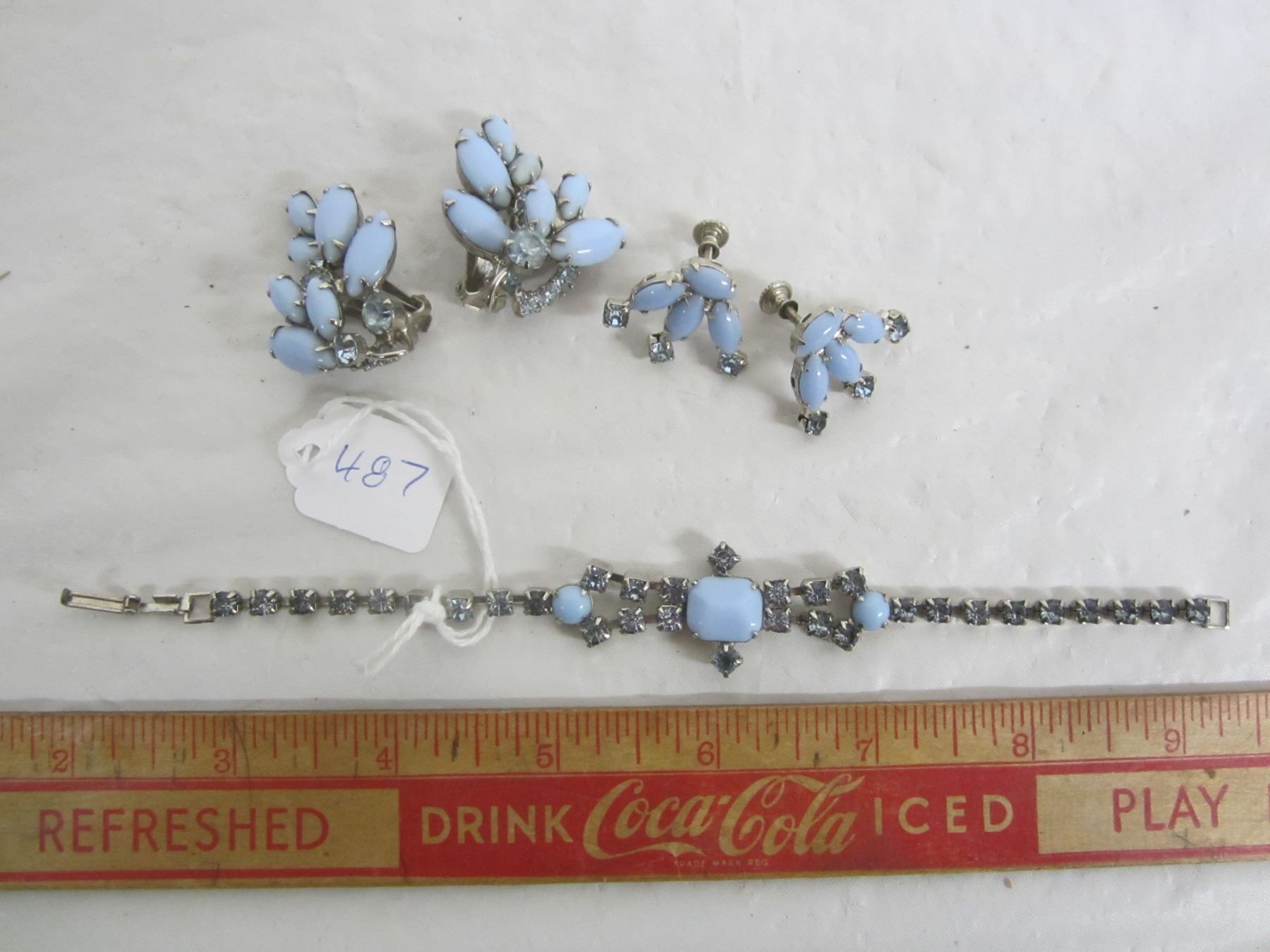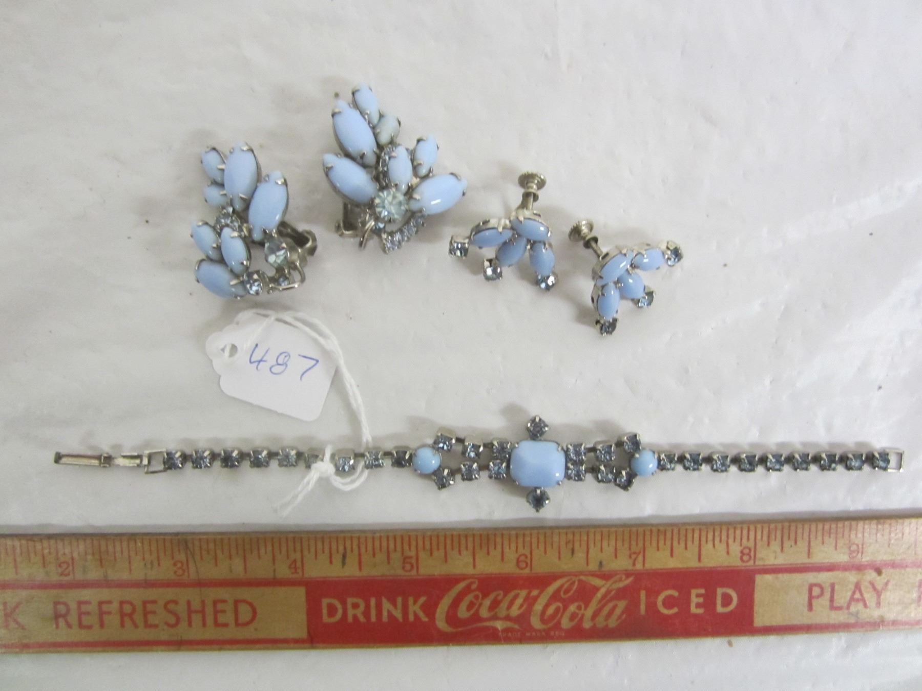 Matching set of costume jewelry with blue stones bracelet and 2 sets of earrings