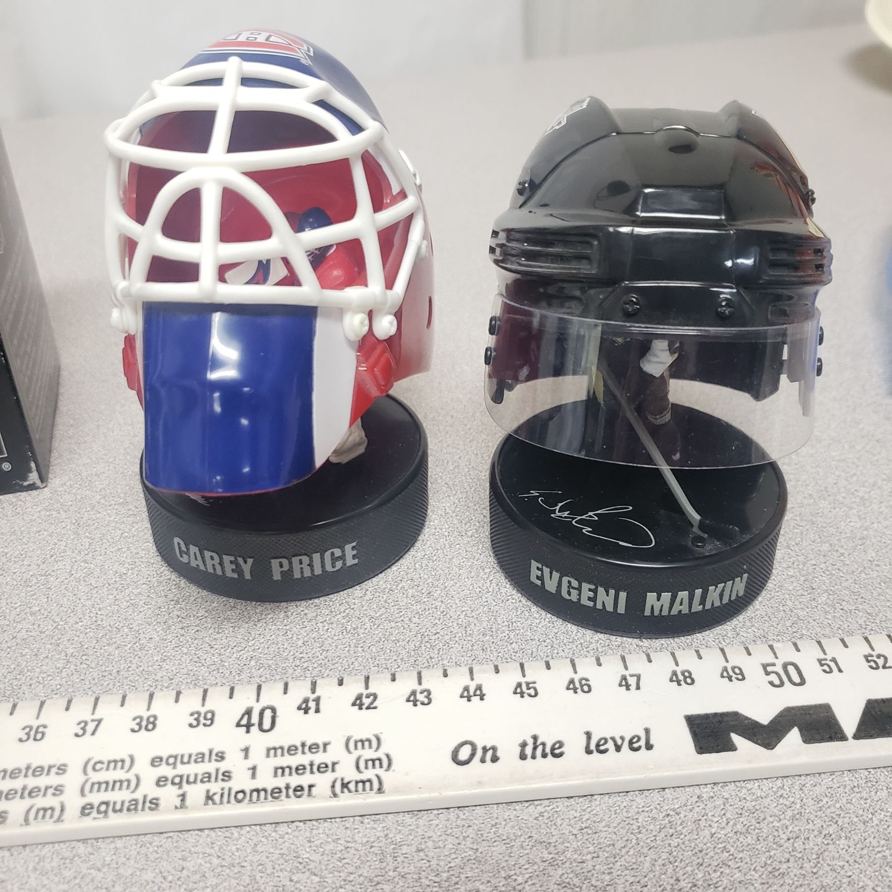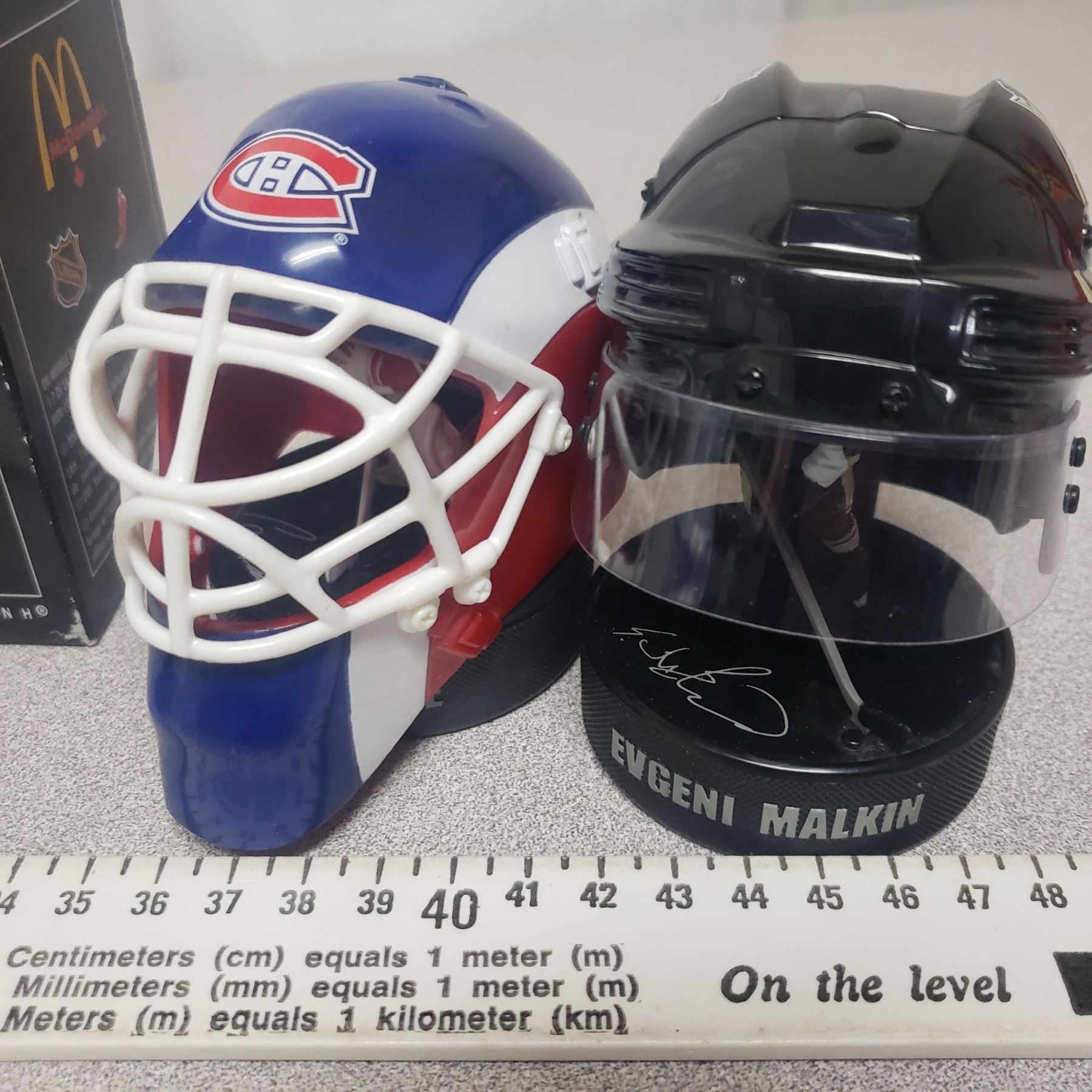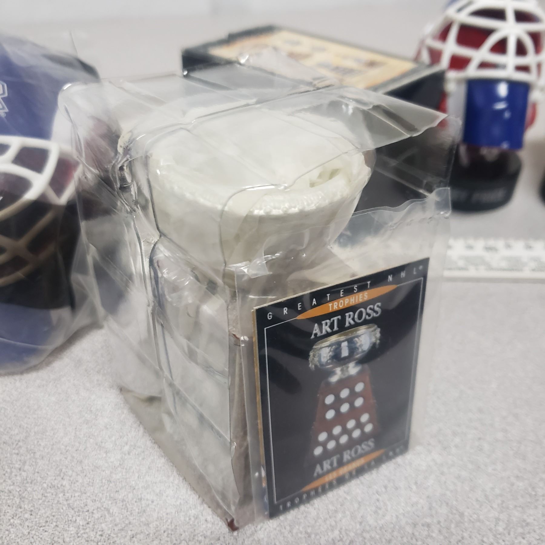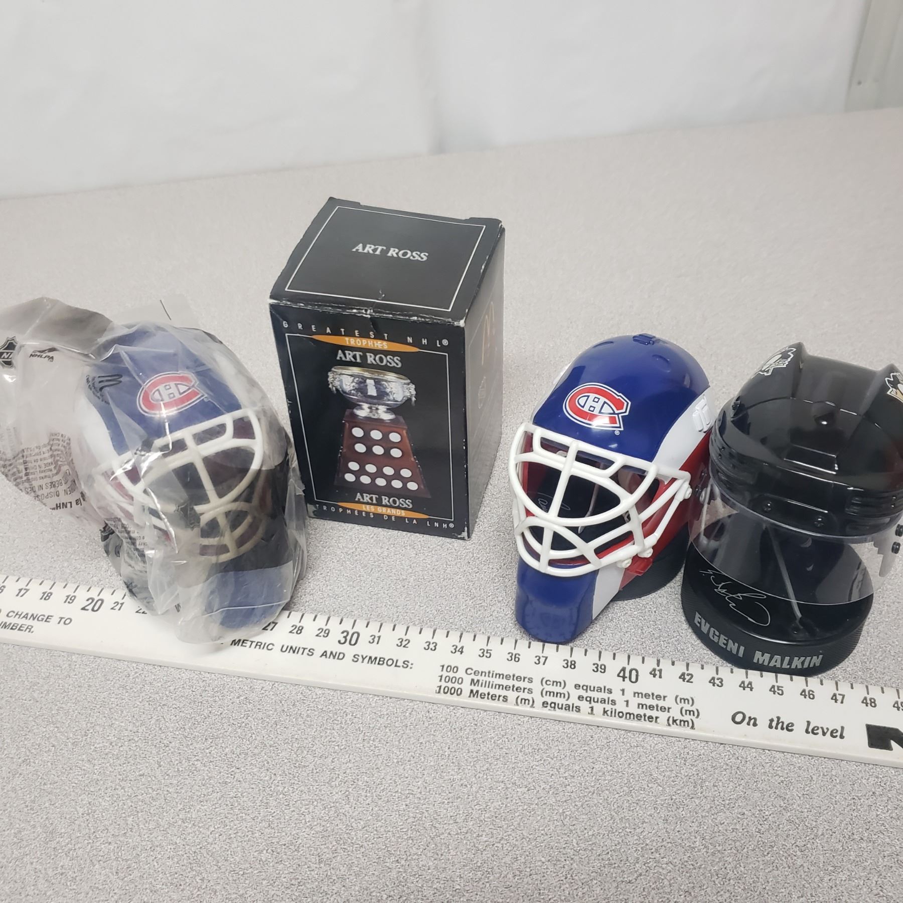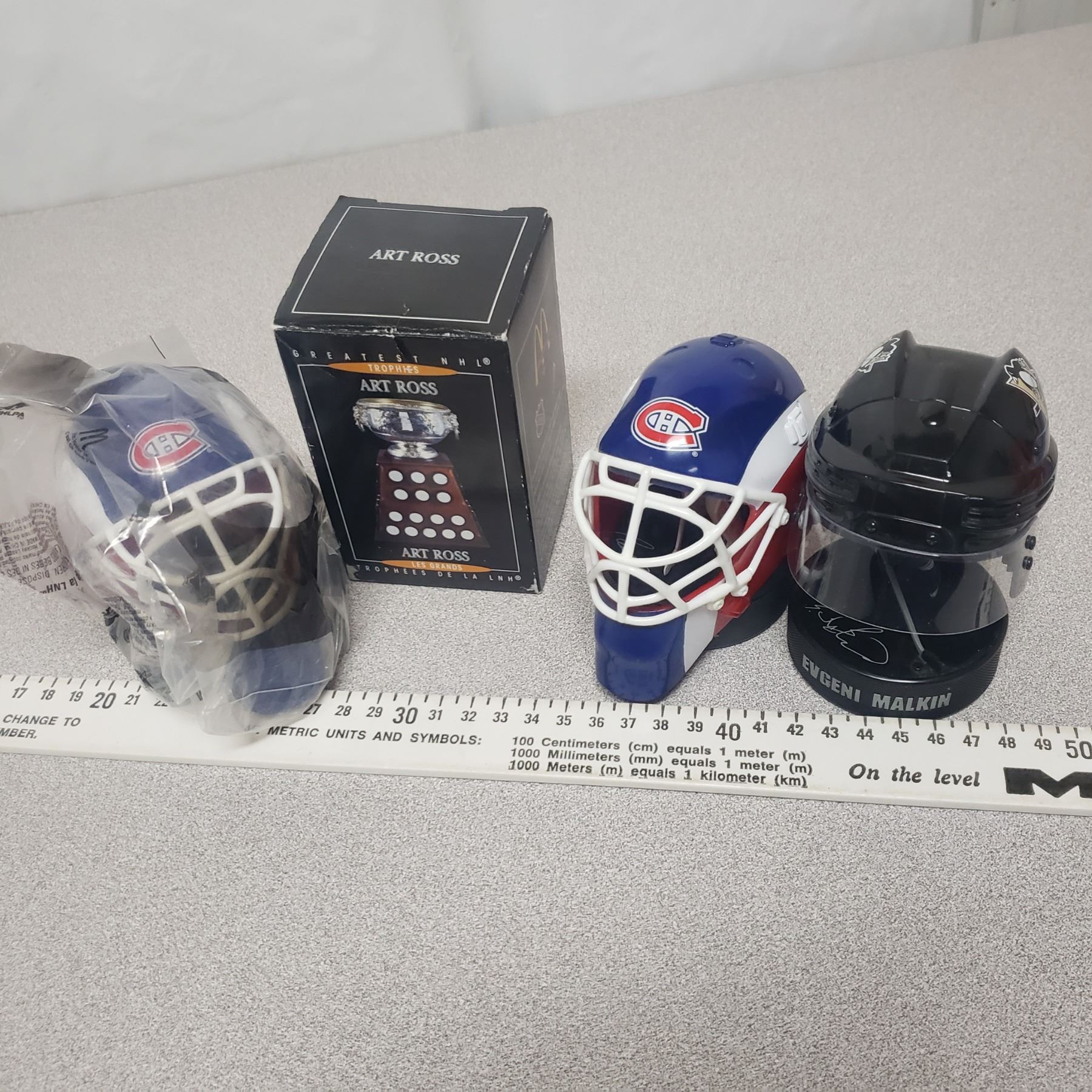 McDonald Sports Collectable Lot - 3 Helmets Malkin, Pricex2 and Art Ross Trophy In Box