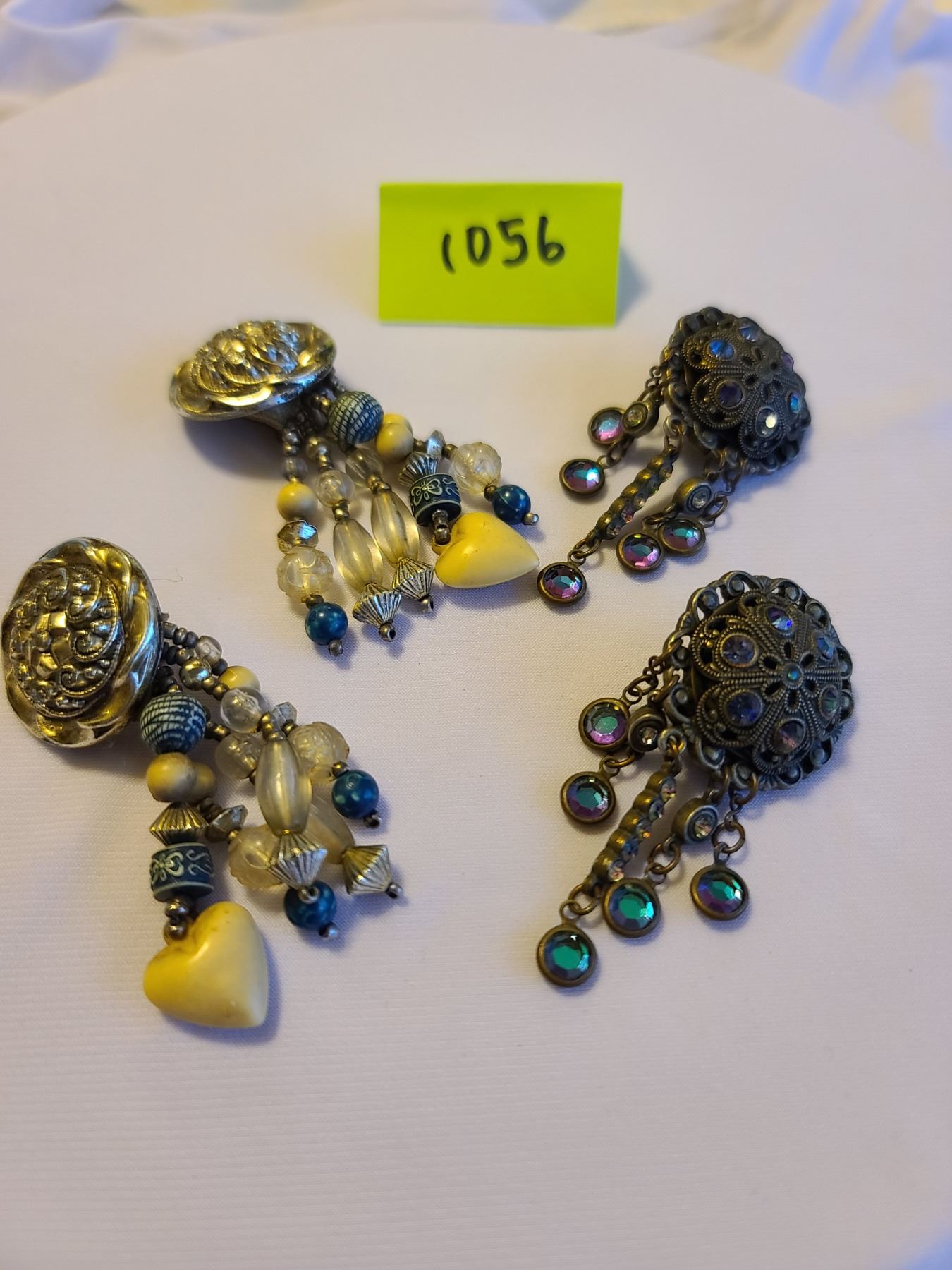 Medallion dangle clip earrings iridescent purple and blue rhinestones, Gold medallion dangle clip earrings with scroll detailing and cream and blue beading