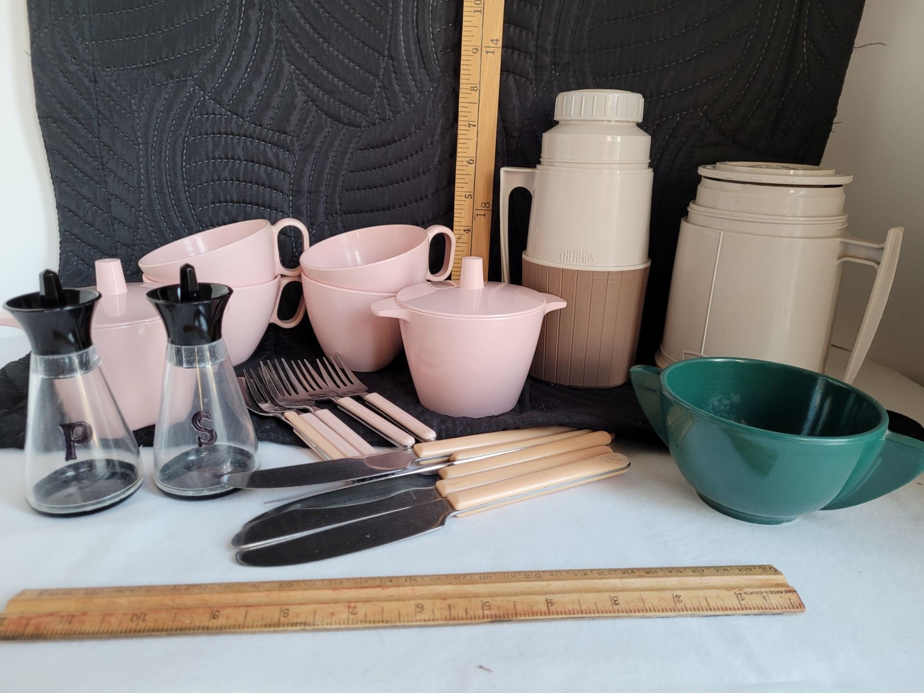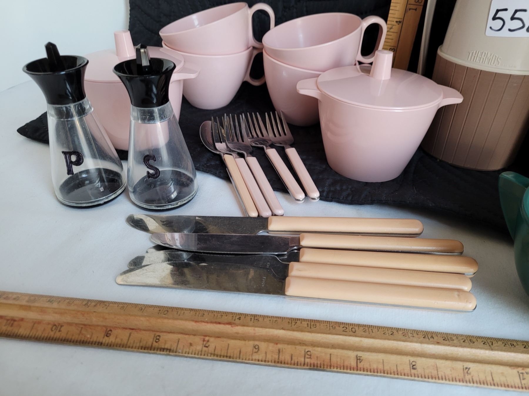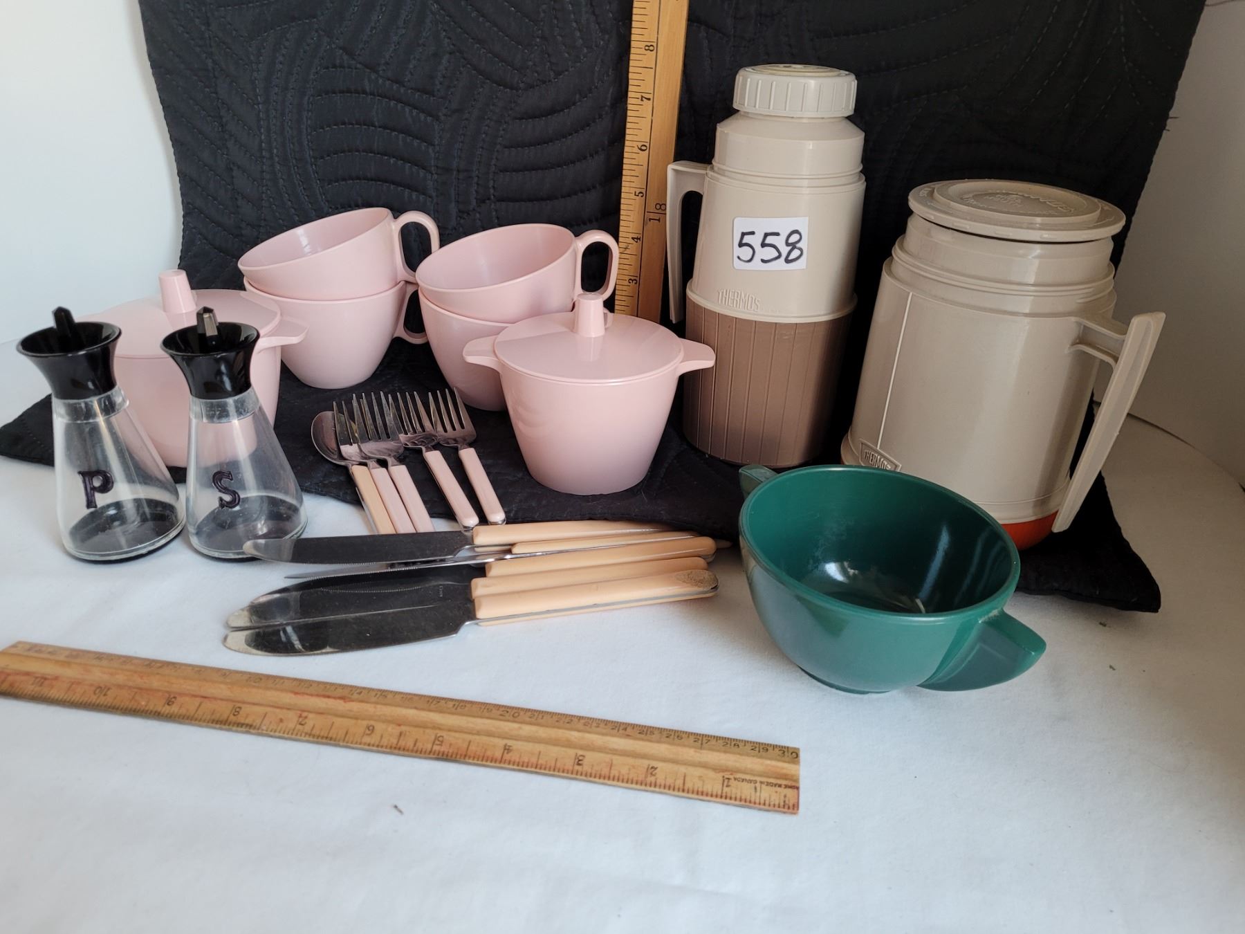 Melmac cups and sugar bowls, vintage cutlery plus 2 thermos bottles.