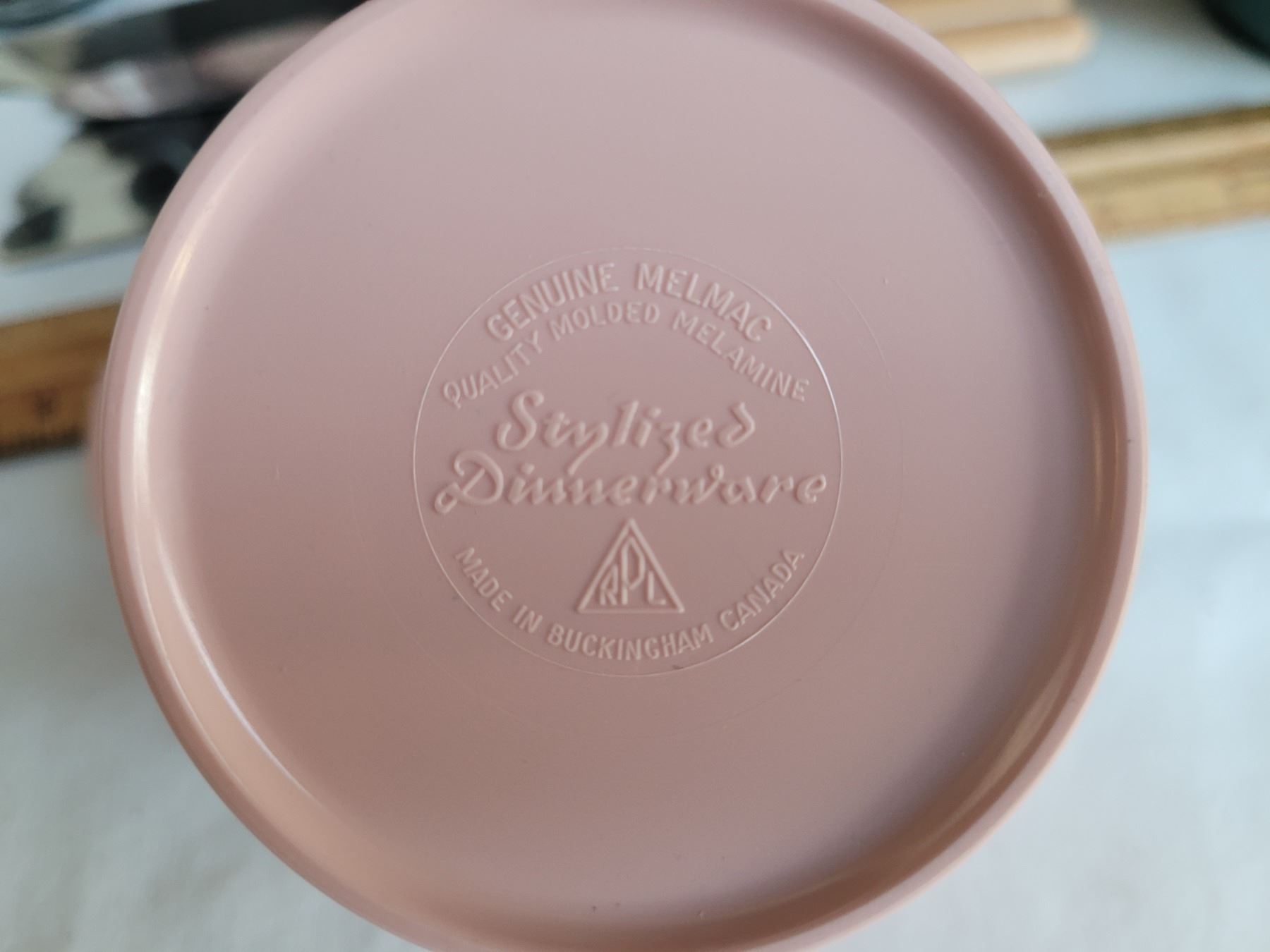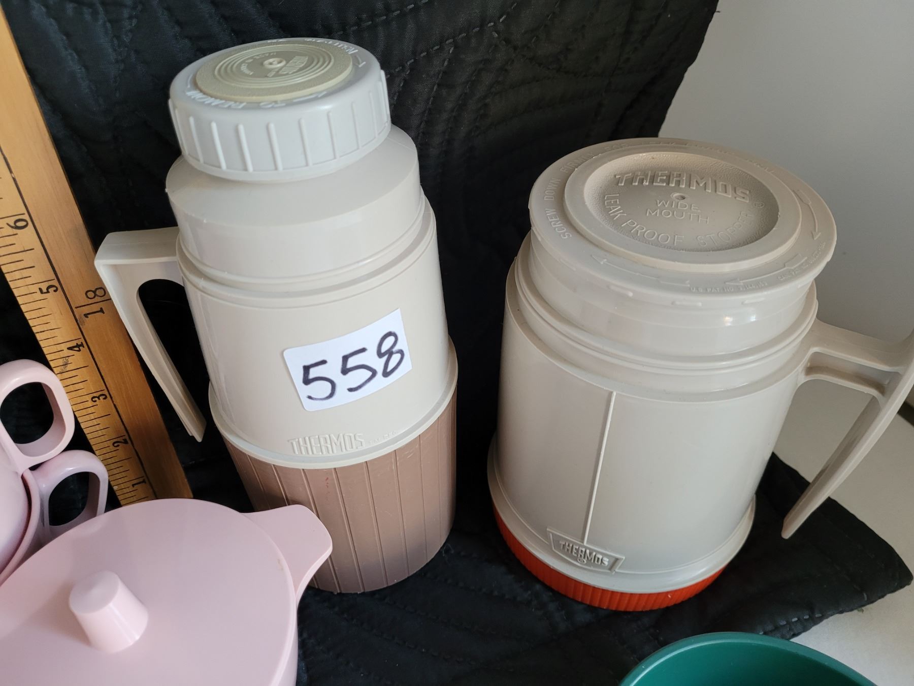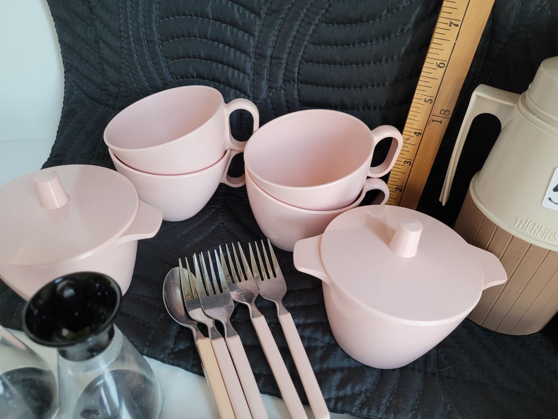 Melmac cups and sugar bowls, vintage cutlery plus 2 thermos bottles.