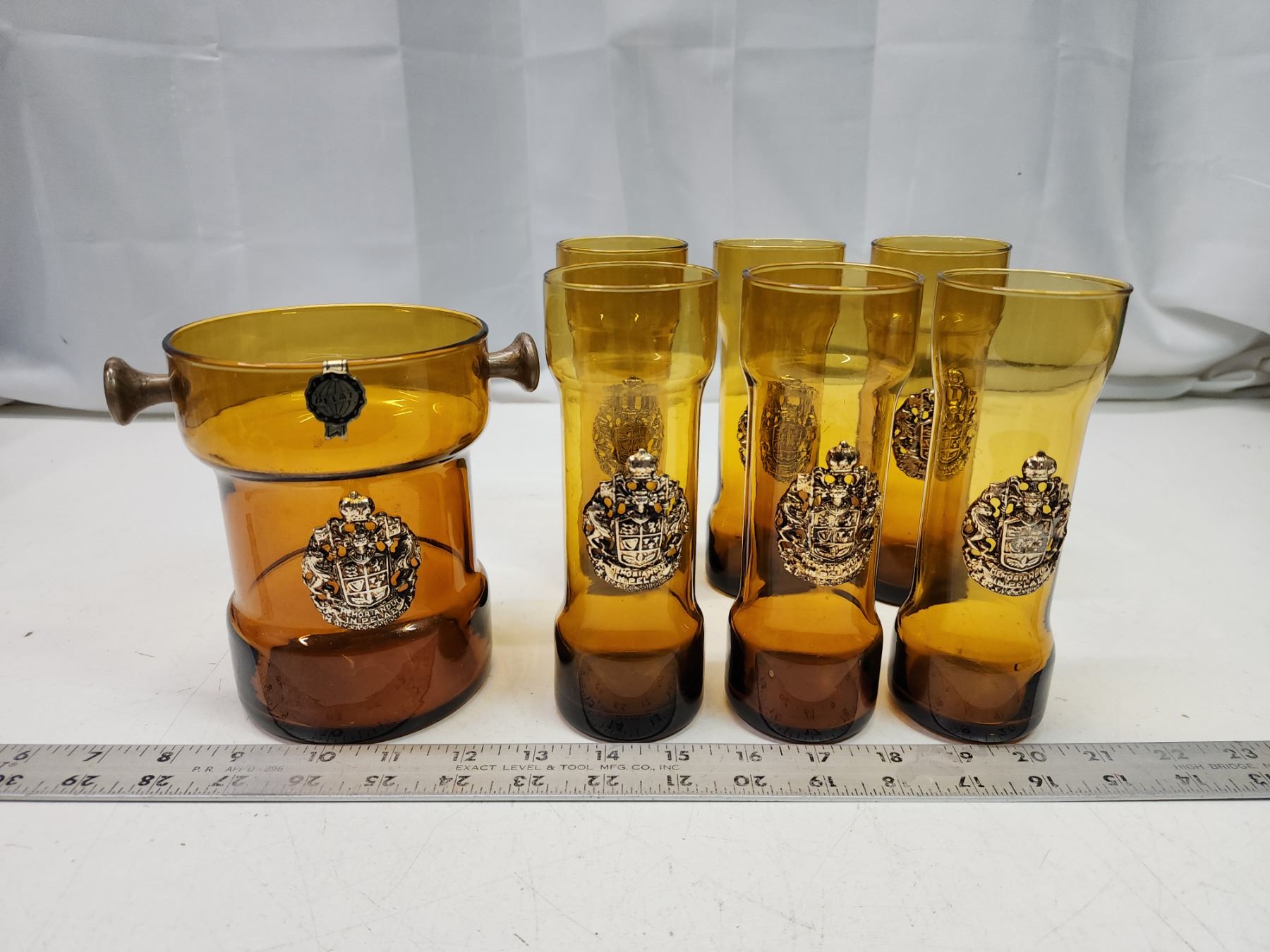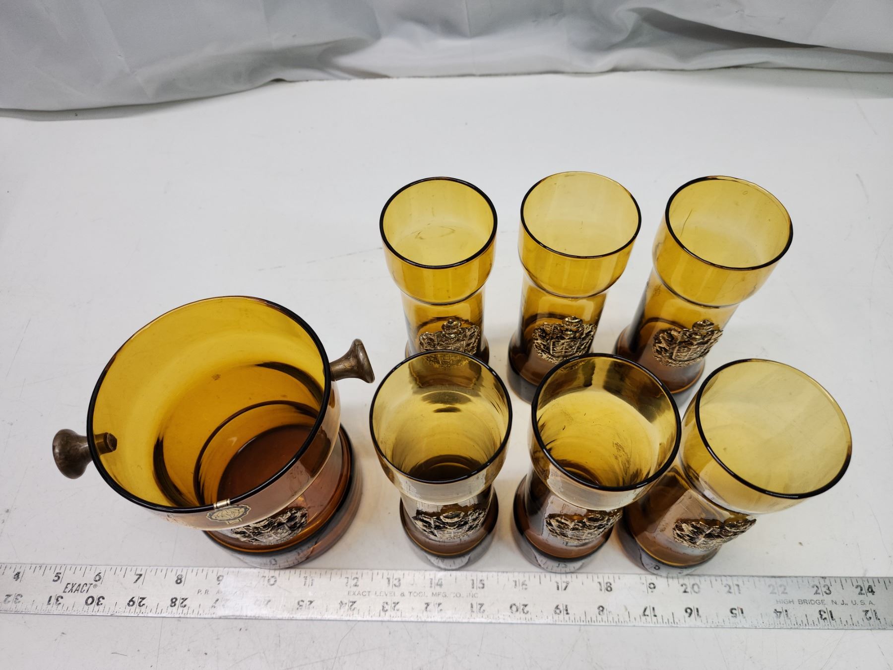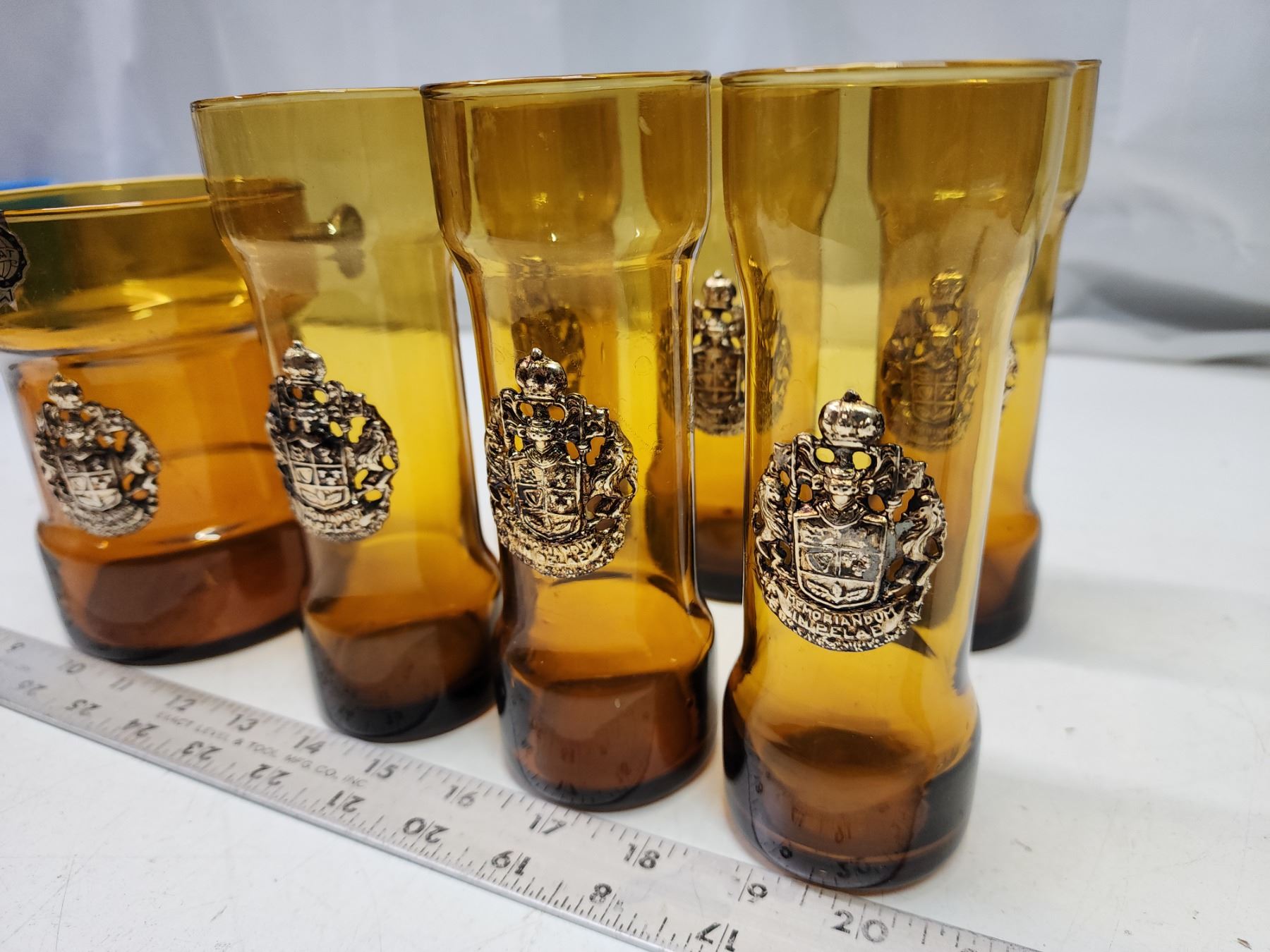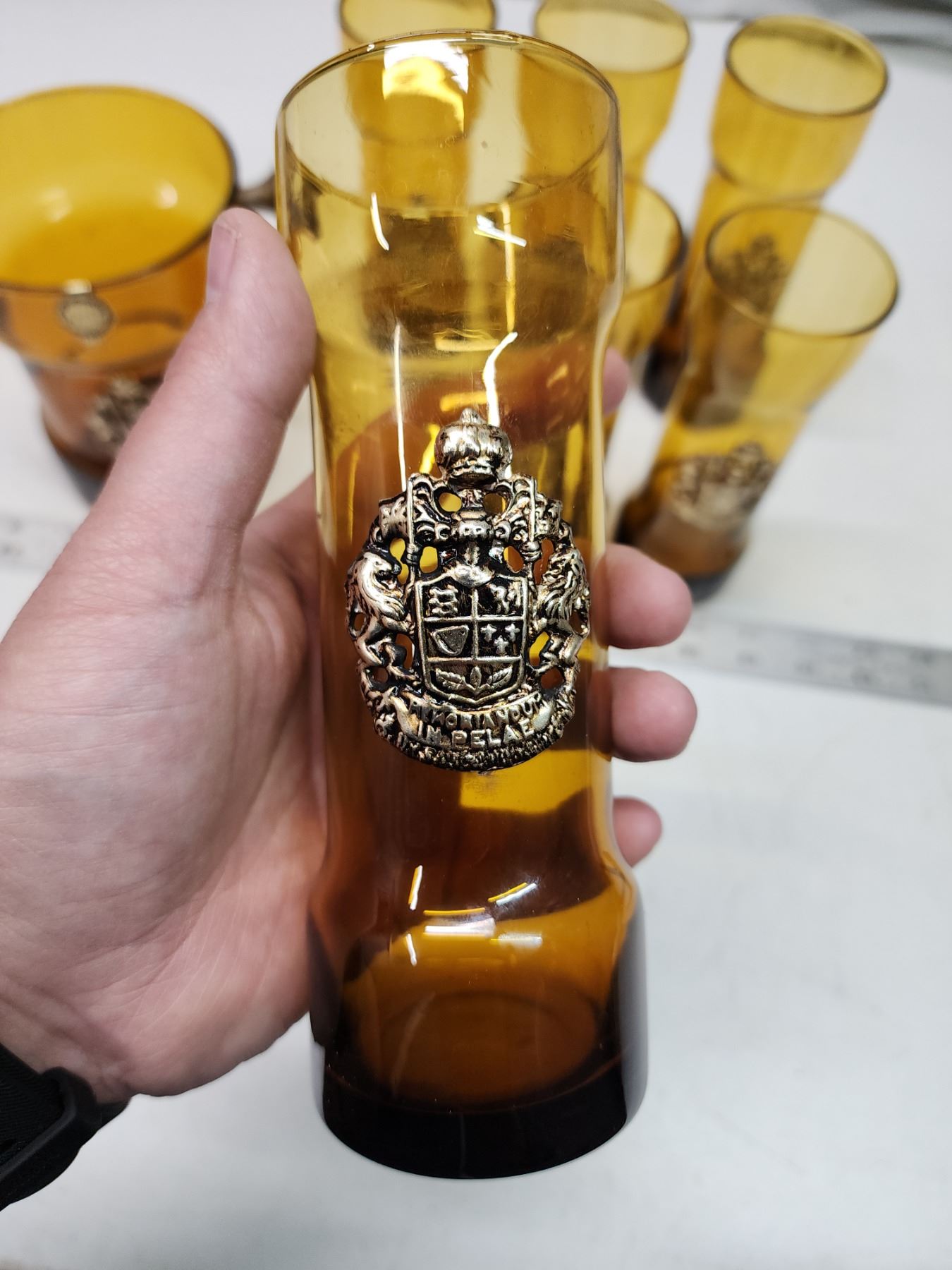 "Memoriandum in Pelae" coat of arms, unique brown beer glass set - 6 glasses & 1 schooner